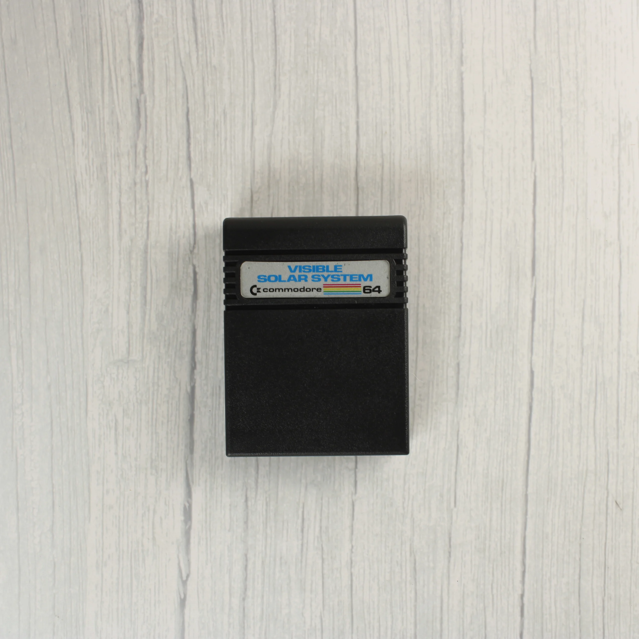 A Commodore 64 számítógéphez készült Visible Solar System szoftver eredeti dobozos kiadása. A csomag tartalmazza a színes illusztrációval ellátott kartondobozt és a fekete műanyag házas szoftvermodult. A doboz elején két asztronauta látható a Hold felszínén, háttérben a Naprendszer bolygóival. A hátoldalon a Commodore kiegészítőinek leírása és egy vonalkód található. A cartridge elején fehér címke azonosítja a programot. A termék a korának megfelelő esztétikai állapotban van, a doboz élein és sarkain látható kopásokkal és kisebb benyomódásokkal.