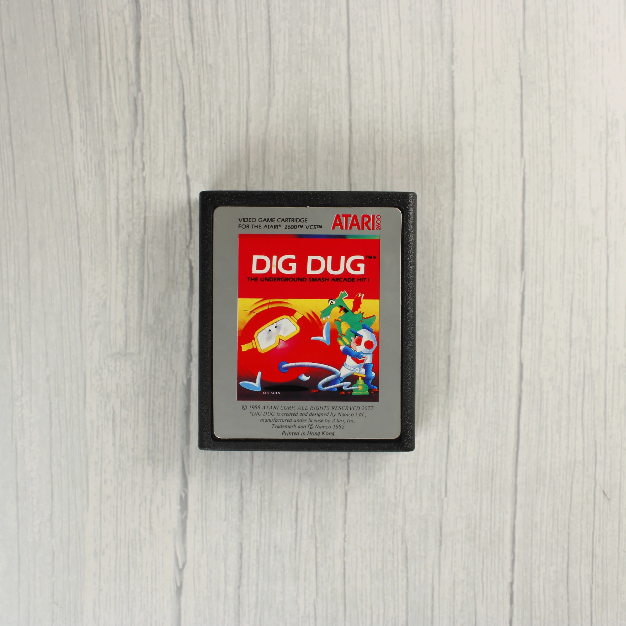 Az Atari 2600 konzolhoz készült Dig Dug videójáték eredeti dobozos kiadása. A csomag tartalmazza a színes illusztrációval ellátott kartondobozt és a fekete műanyag házas cartridge-et. A doboz elején a játék címe, a Namco logója és egy jellegzetes grafika látható, amely a főhőst és az ellenfeleket ábrázolja. A hátoldalon többnyelvű leírás és egy képernyőkép található a játékmenetről. A cartridge címkéje ezüst alapszínű, piros feliratokkal és a doboz grafikájának kicsinyített változatával. A termék az 1980-as évek végéről származik, amit a dobozon és a cartridge-en látható 1988-as évszám is igazol. A csomagolás és a hordozó fizikai állapota korának megfelelő, használatból eredő kopásokkal.
