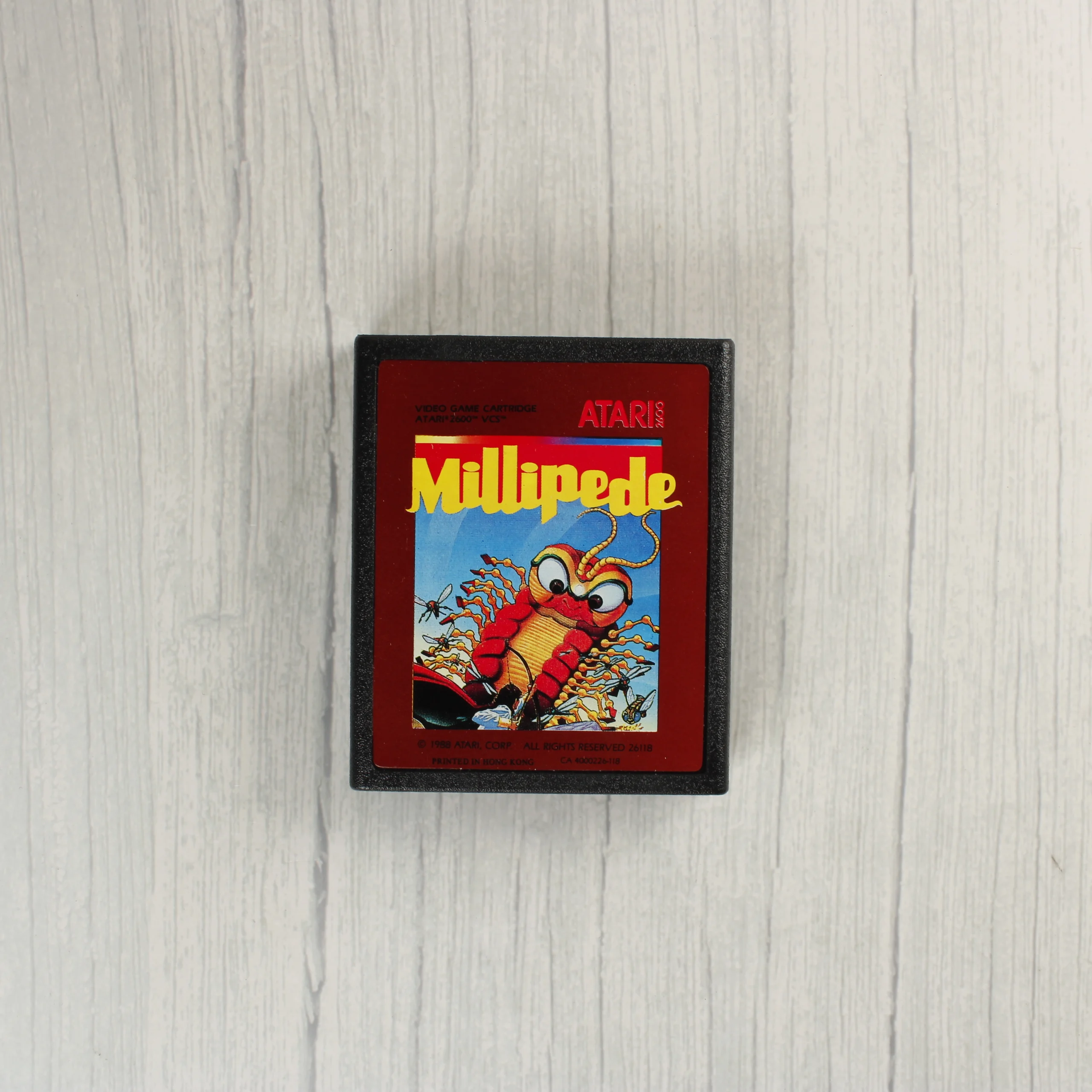 Egy eredeti dobozos Millipede videójáték Atari 2600 konzolhoz. A csomag tartalmazza a színes, illusztrált kartondobozt és a fekete műanyag házas játék cartridge-et. A doboz elején a játék címe és egy nagyméretű, stilizált százlábú grafika látható, felette a piros Atari 2600 logóval. A hátoldalon többnyelvű játékleírás és egy képernyőkép található a játékmenetről. A cartridge címkéje megegyezik a doboz grafikájával, rajta a Video Game Cartridge felirat olvasható. A termék az 1980-as évek végéről származik, amit a doboz alján lévő 1987-es és a cartridge-en lévő 1988-as évszám is jelez.