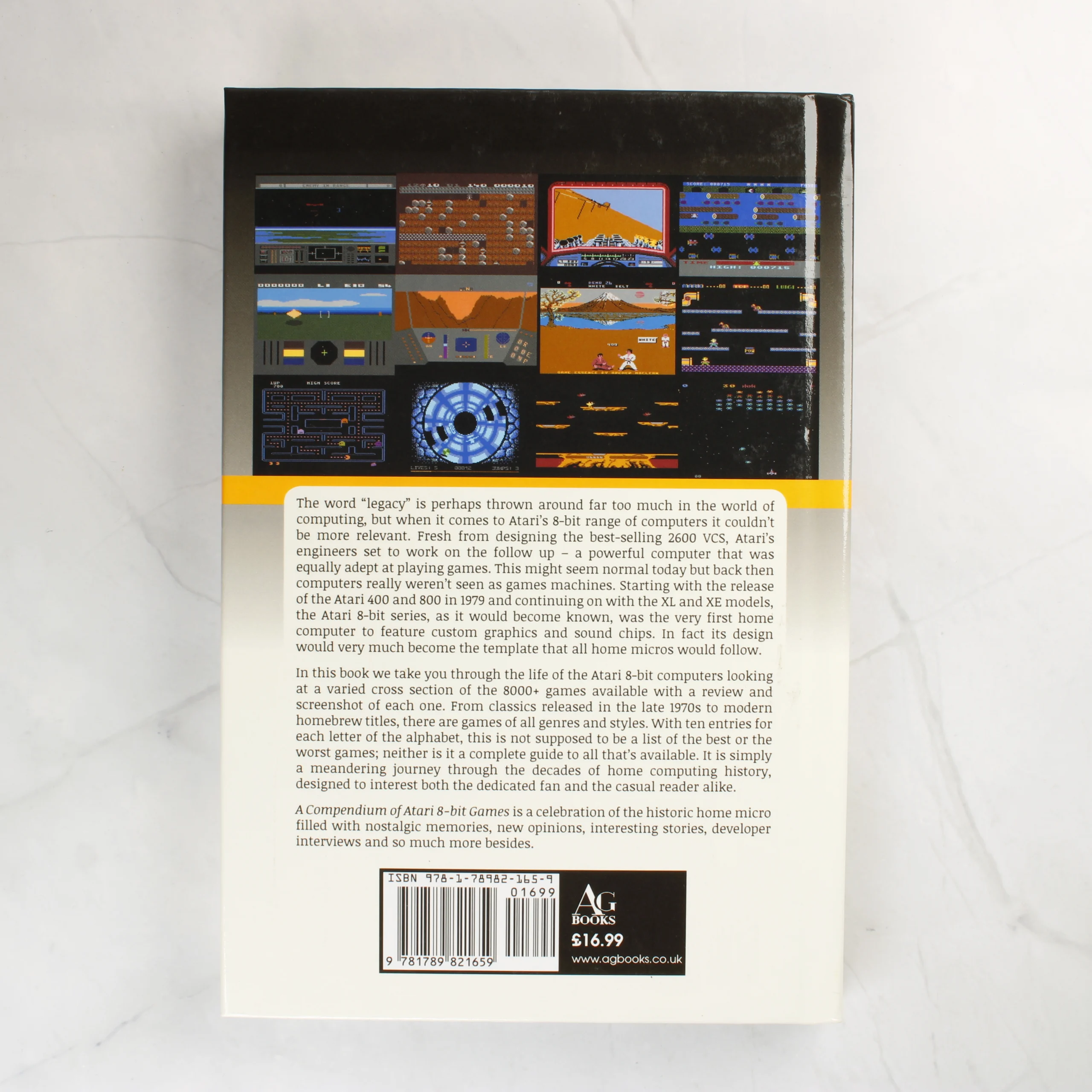 Kieren Hawken A Compendium of Atari 8-Bit Games Volume One című könyve egy keménytáblás, gyűjtői kiadás, amely az Atari 8 bites számítógépes játékait mutatja be. A borító felső részén sötét háttér előtt sárga felirat látható, alatta egy Atari 800-as számítógép fotója szerepel fehér alapon. A hátsó borítón tizenkét különböző videójátékból származó képernyőmentés látható, alatta pedig angol nyelvű ismertető szöveg olvasható. A kiadvány az AG Books gondozásában jelent meg. A könyv fizikai állapota kiváló, a sarkok épek, a borító felülete tiszta és fényes, látható sérülés vagy jelentős kopás nincs rajta.