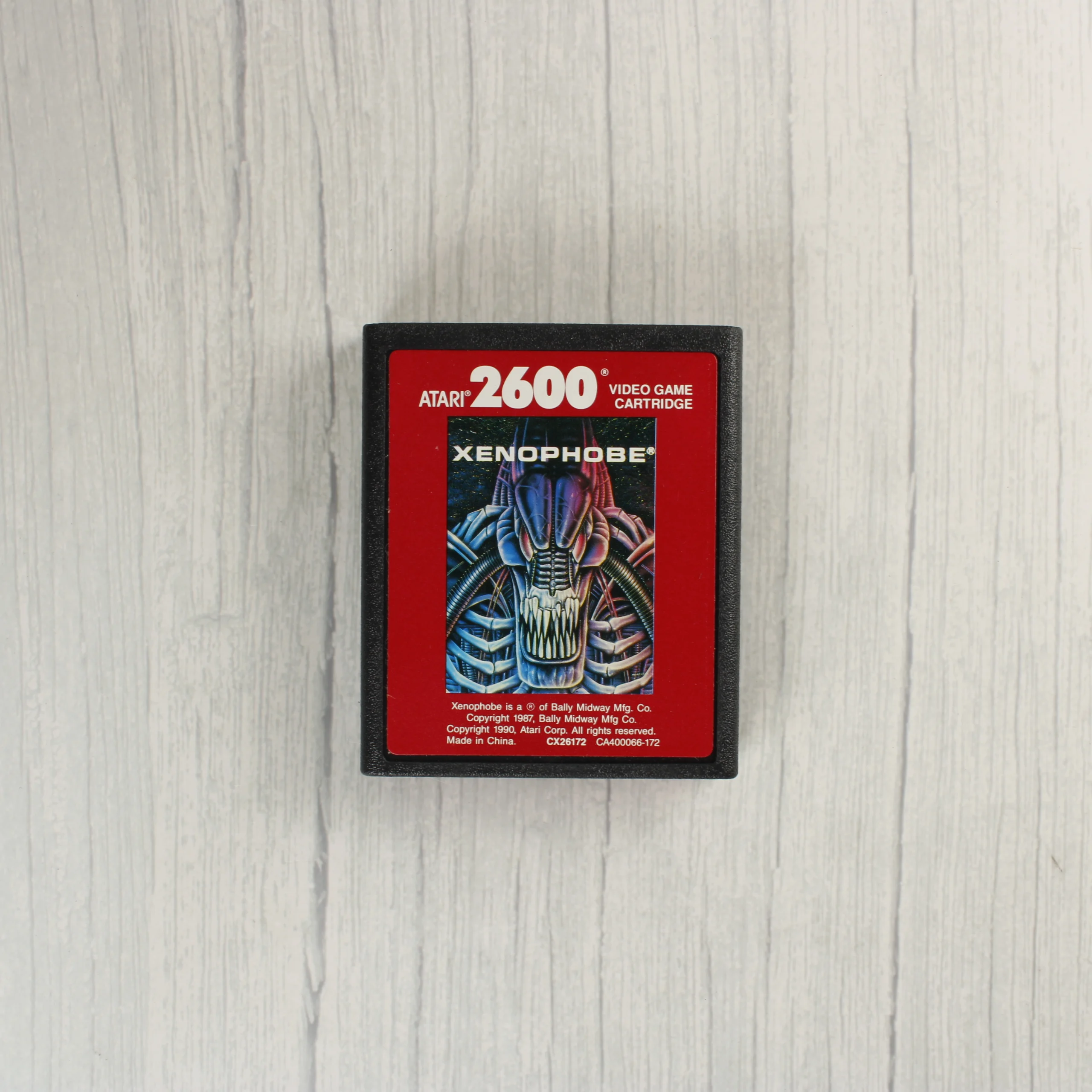 Az Atari 2600 konzolhoz készült Xenophobe videójáték eredeti dobozos kiadása. A csomag tartalmazza a piros alapszínű, kartonból készült külső dobozt és a fekete műanyag házas szoftvermodult. A doboz előlapján egy részletgazdag, idegen lényt ábrázoló grafika látható, felette az Atari 2600 felirattal. A hátoldalon angol nyelvű játékleírás és két képernyőkép mutatja be a játékmenetet. A cartridge címkéje megegyezik a doboz grafikájával, és tartalmazza a gyártói adatokat, valamint a CX26172 modellszámot. A termék az 1990-es évekből származik, a Bally Midway Manufacturing Company licence alapján az Atari Corporation gyártotta.