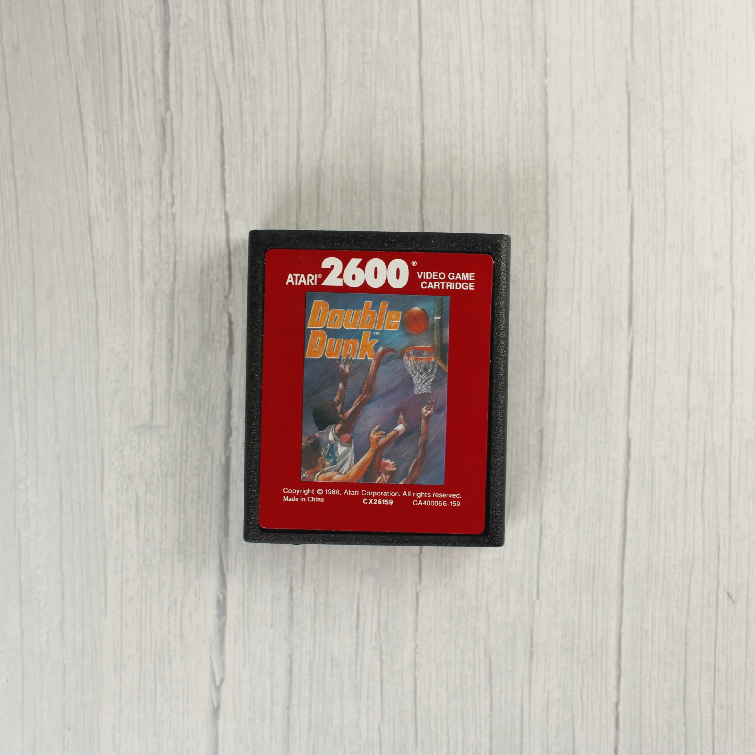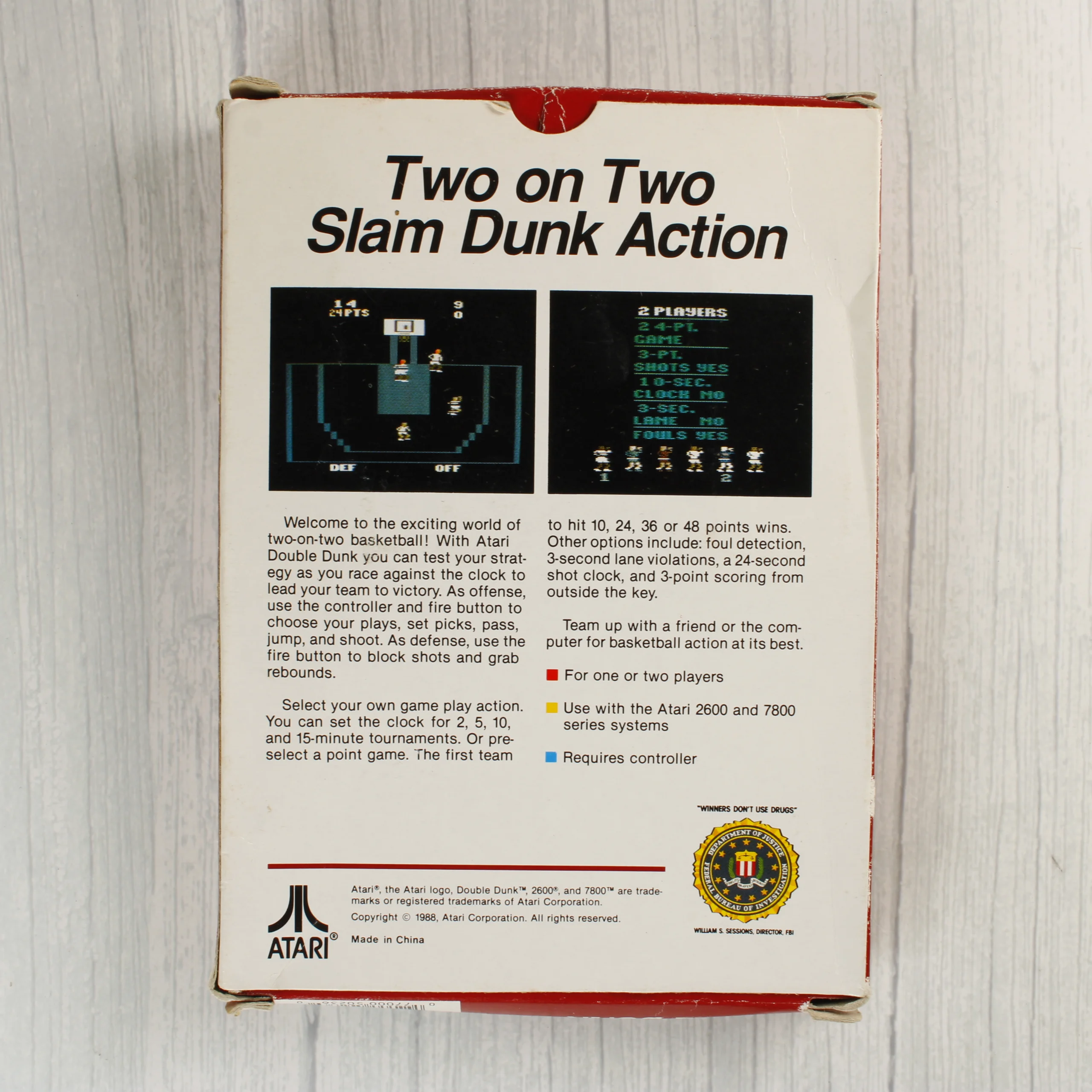Az Atari 2600 konzolhoz készült Double Dunk egy kosárlabdás videójáték, amely eredeti dobozában és cartridge formátumban látható. A piros alapszínű papírdoboz elején egy dinamikus illusztráció látható, amelyen játékosok küzdenek a labdáért a palánk alatt. A doboz hátoldala fehér, rajta két képernyőkép a játékmenetről, valamint angol nyelvű leírás és az irányítási lehetőségek szerepelnek. A fekete műanyag cartridge piros címkével rendelkezik, amely megegyezik a doboz grafikájával. A csomagoláson jól látható az Atari logó és a 2600-as típusszám. A termék 1988-as kiadású, Kínában készült.