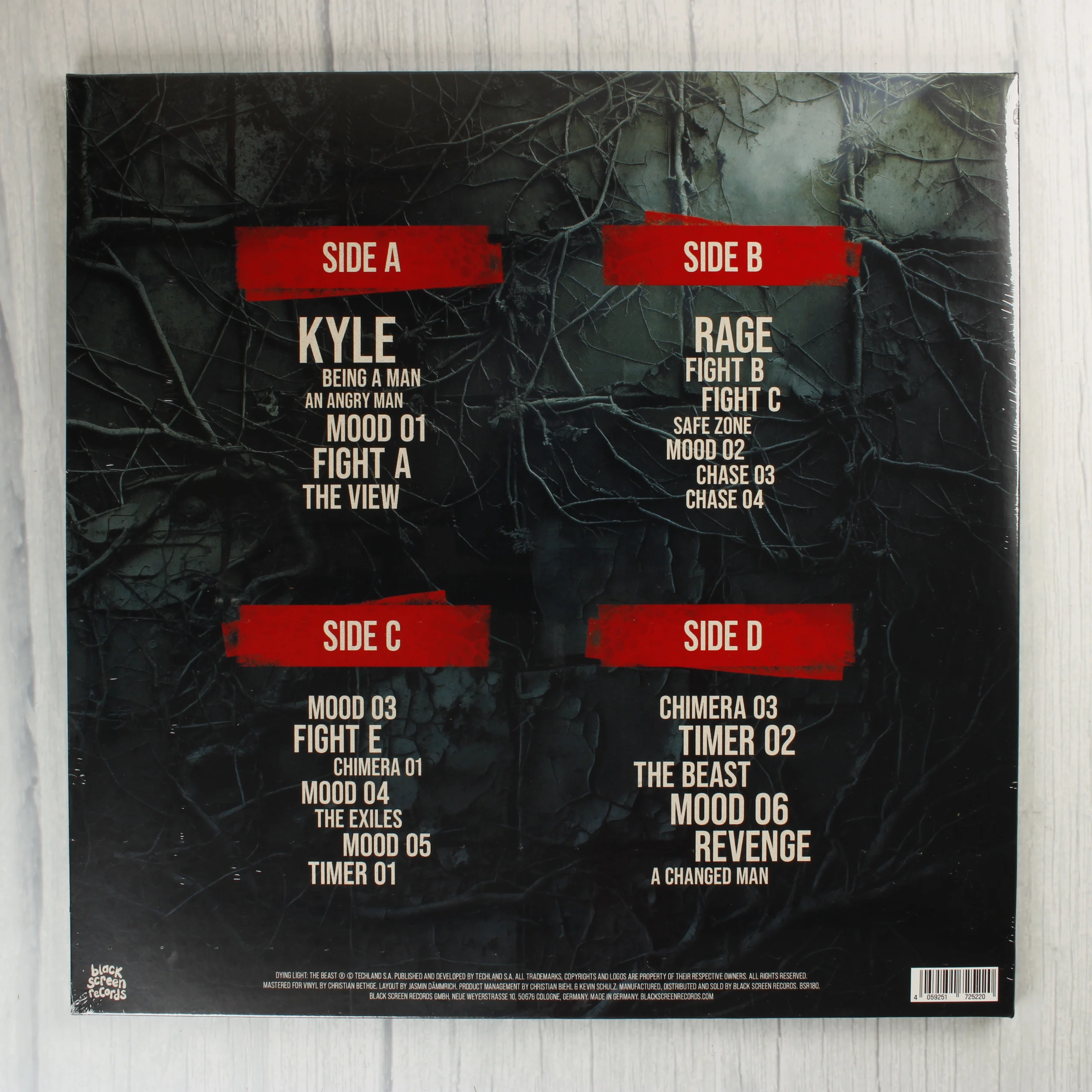 A Dying Light: The Beast videójáték hivatalos filmzenéjét tartalmazó dupla bakelit lemez, Olivier Deriviere szerzeményeivel. A kiadvány a Black Screen Records gondozásában jelent meg. A borító előlapján egy dinamikus illusztráció látható, amelyen egy férfi küzd egy zombival egy erdős környezetben. A hátoldalon a négy oldal (A, B, C, D) számlistája olvasható sötét, indás háttér előtt. A csomagoláson található matrica szerint a készlet két darab áttetsző piros, fekete márványmintás lemezt tartalmaz. A termék gyári védőfóliában van, amely megvédi a kartontok éleit és felületét.