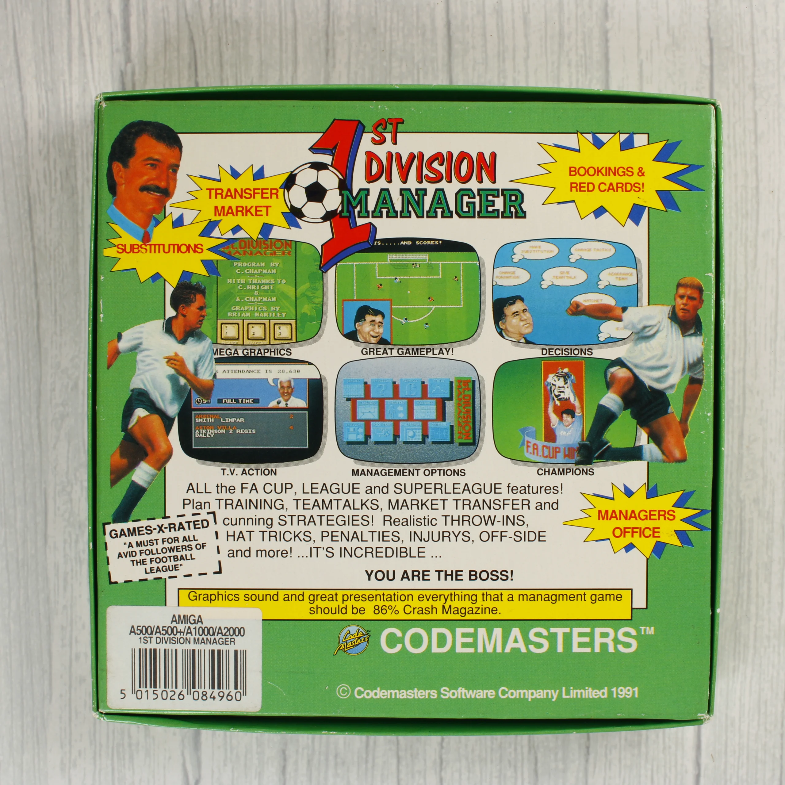 A 1st Division Manager egy klasszikus labdarúgó-menedzser videójáték Commodore Amiga platformra, amelyet a Codemasters adott ki 1991-ben. A csomag tartalmazza az eredeti színes kartondobozt, amelyen futballisták és menedzserek grafikái láthatók, valamint a játékot tartalmazó kék színű, 3,5 colos floppy lemezt. A doboz hátoldalán képernyőképek és a játék funkcióinak leírása olvasható, mint például az átigazolási piac, a taktikai döntések és a bajnoki opciók. A készlet részét képezi továbbá egy nyomtatott reklámanyag is, amely Codemasters ajándéktárgyakat kínál. A szoftver az Amiga 500, 1000 és 2000 modellekkel kompatibilis.