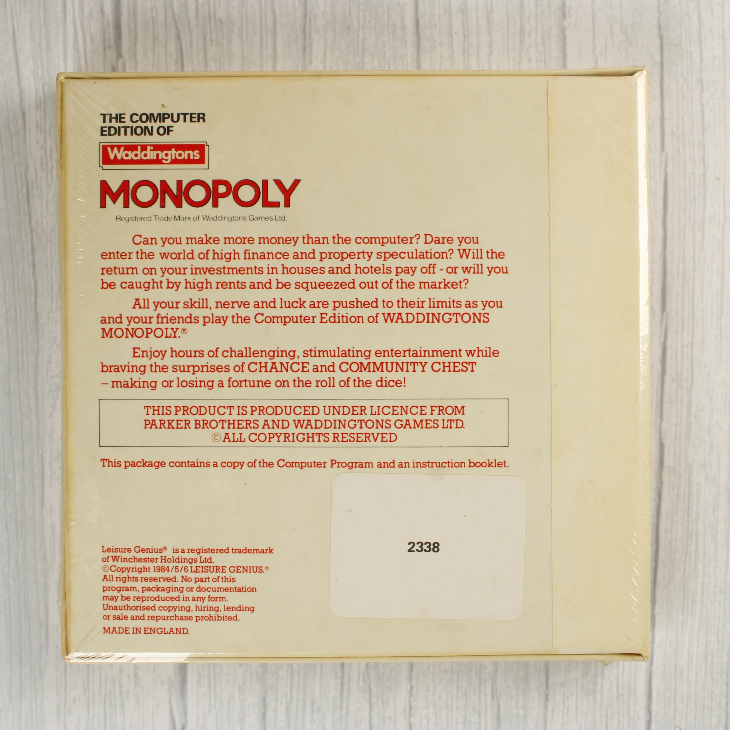 A Waddingtons Monopoly videójáték Commodore 64 platformra készült kiadása eredeti dobozban. A csomagolás elején a Leisure Genius logója és egy illusztrált karakter látható, piros és krémfehér színek dominálnak. A doboz jobb alsó sarkában egy fehér körben a FOR THE CBM 64 felirat olvasható. A hátoldalon a játék rövid leírása, a licencinformációk és a gyártási adatok szerepelnek. A termék gyári fóliázásban van, ami megóvta a karton felületét a közvetlen sérülésektől, bár a fólia alatt a papír enyhén sárgult az idő múlásával. A hátoldalon egy fehér matrica látható a 2338-as számmal. A doboz élei és sarkai épek, a grafika jól olvasható és tiszta.