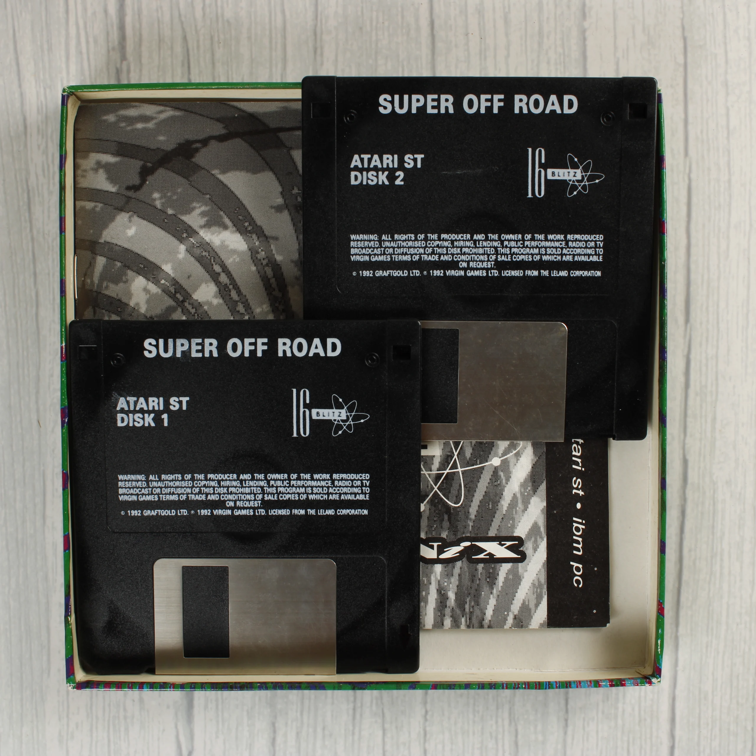 Atari ST, retro játék, Virgin Games, Super Off Road, floppy lemez, terepverseny
