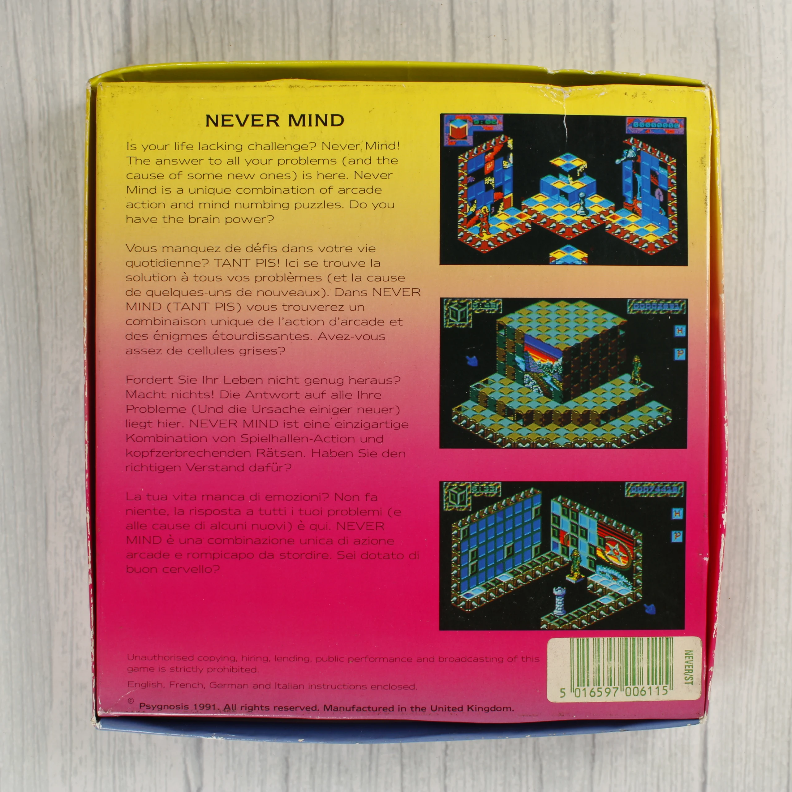 A Never Mind című videójáték Atari ST platformra készült kiadása a Sizzlers sorozat részeként. A csomag tartalmazza az eredeti, sárga-rózsaszín átmenetes kartondobozt, két darab kék színű 3,5 colos floppy lemezt, valamint egy termékregisztrációs kártyát. A doboz elején szürreális grafika látható egy meditáló alakról, a hátoldalon pedig többnyelvű leírás és játékmenet-képek kaptak helyet. A lemezeken fehér felirat jelzi a címet, a kiadót és a lemez sorszámát. A kiadvány színes verzió, futtatásához legalább 512k memória szükséges.