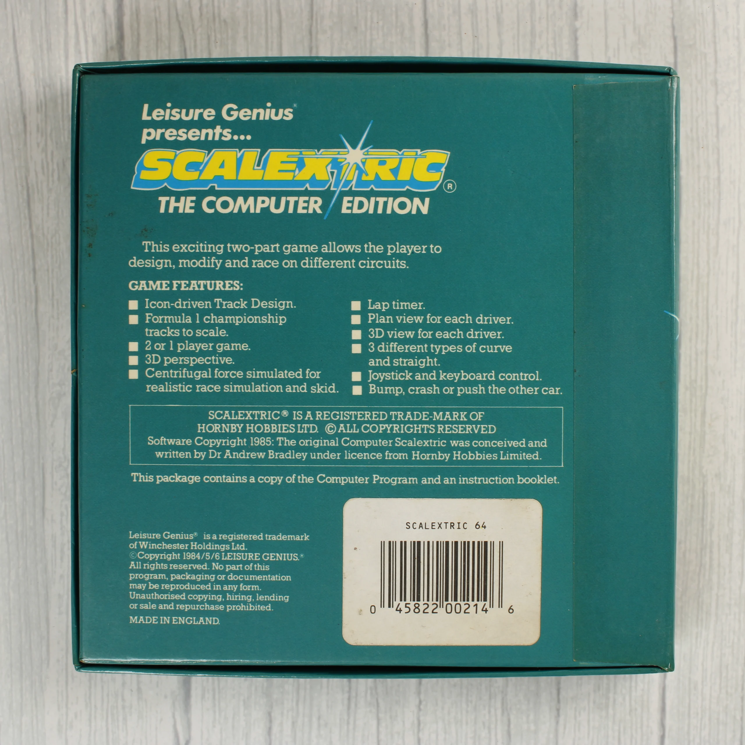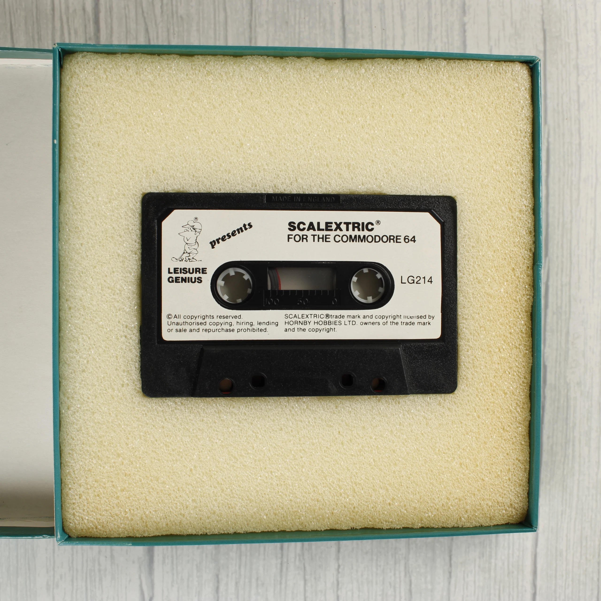 A Scalextric: The Computer Edition egy Commodore 64 platformra megjelent videójáték, amely eredeti kartondobozos csomagolásban látható. A doboz elején két versenyautó grafikája és a Leisure Genius logója szerepel. A csomag tartalmaz egy fekete színű adathordozó kazettát, amely egy sárgás szivacságyban helyezkedik el a dobozon belül. A kazetta fehér címkéjén a játék címe és a gyártói adatok olvashatók. A doboz hátoldalán a játék jellemzői, a szerzői jogi információk és egy vonalkód található. A csomagoláson régi árcímkék és némi kopás látható, ami a korából adódó természetes elhasználódást tükrözi.