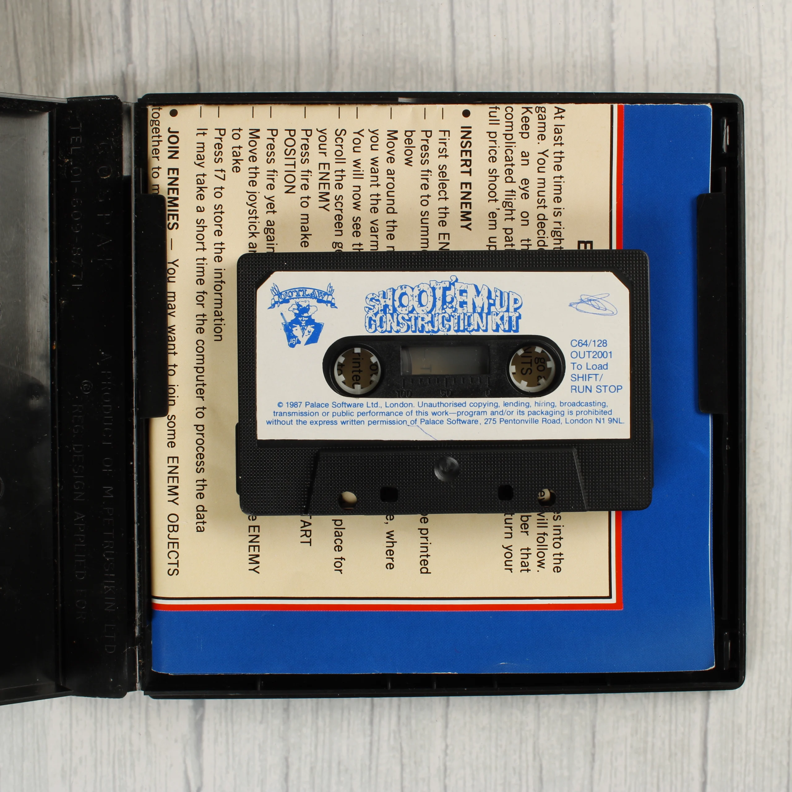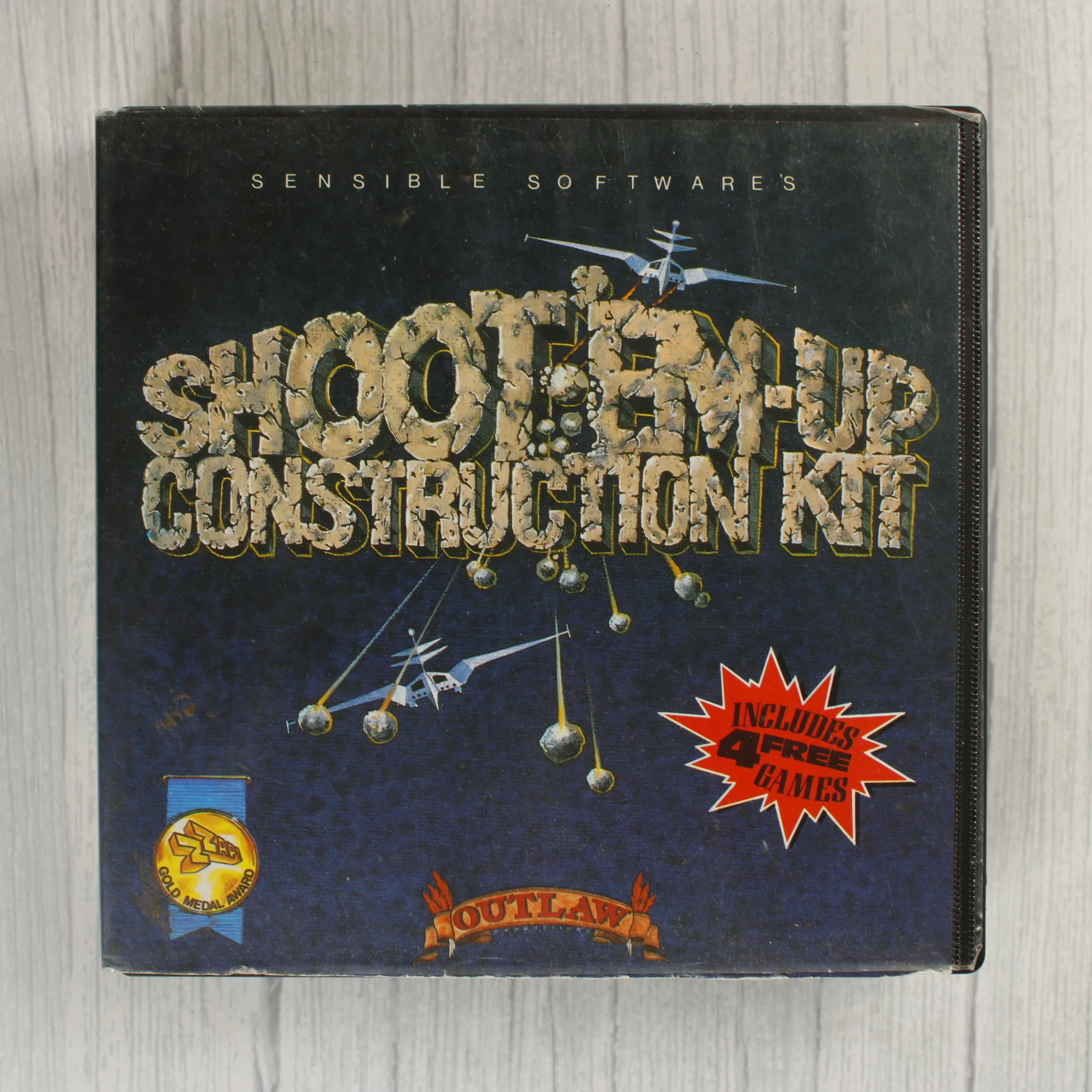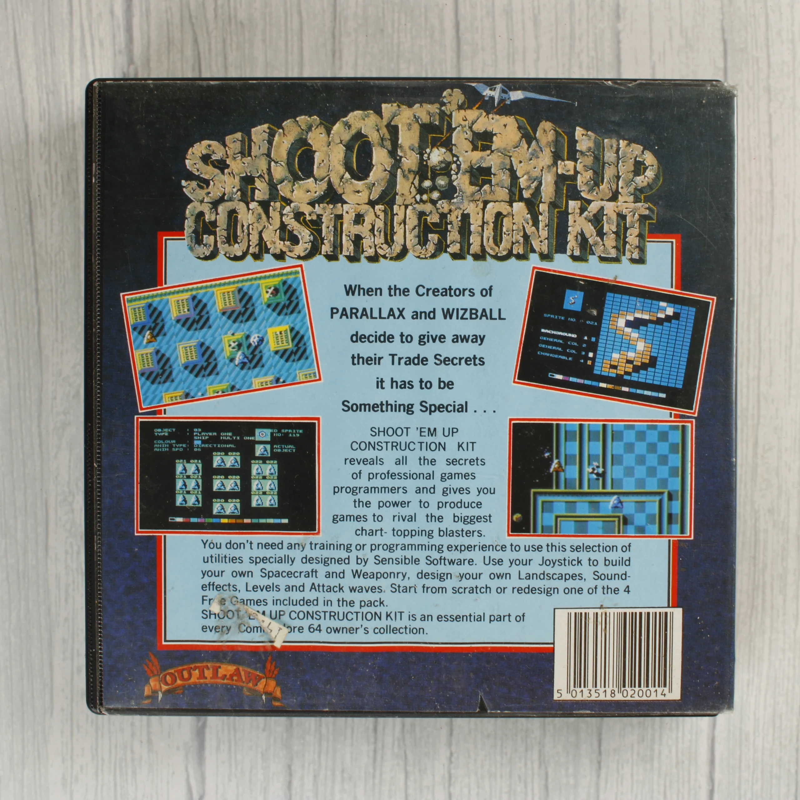 A Sensible Software által fejlesztett Shoot-'Em-Up Construction Kit videójáték Commodore 64 platformra. A csomag egy fekete műanyag tokban található, amely tartalmazza az eredeti programot hordozó magnetofonkazettát és a hozzá tartozó nyomtatott használati útmutatót. A borítón látványos grafika látható űrhajókkal és kőhatású felirattal, valamint egy piros csillag alakú jelzés, amely szerint a készlet négy ingyenes játékot is tartalmaz. A hátoldalon képernyőmentések és angol nyelvű leírás mutatja be a szoftver funkcióit, beleértve a saját pályák, ellenségek és hangeffektek tervezésének lehetőségét. A kazetta fehér címkével rendelkezik, kék felirattal és az Outlaw logóval.