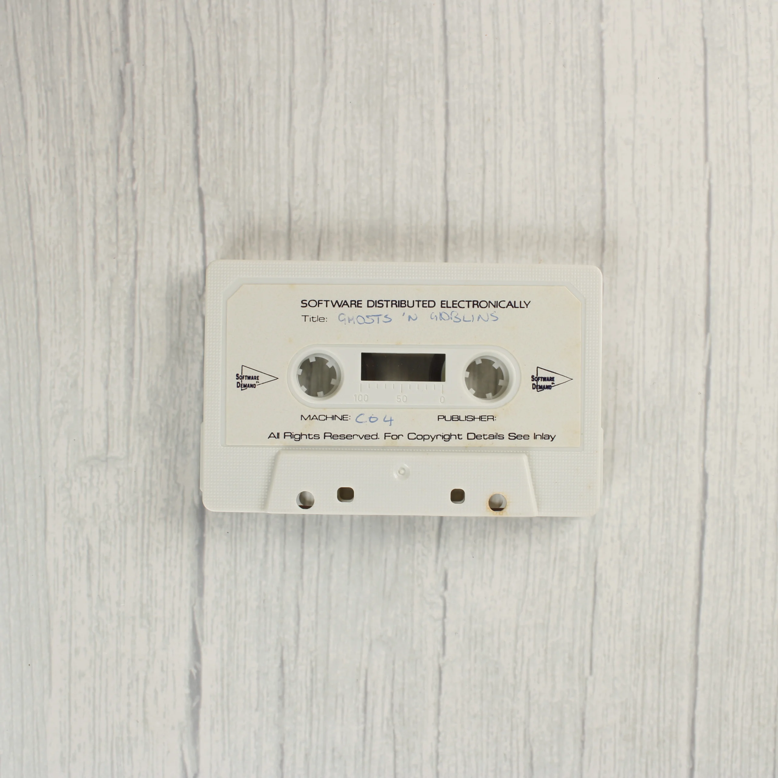 A Ghosts 'n Goblins című videójáték Commodore 64 platformra készült kiadása. A csomag egy átlátszó műanyag tokot tartalmaz, amelyben az eredeti színes borító látható az Encore és az Elite logóival, valamint egy Zzap! Gold Medal Award matricával. A hátoldalon többnyelvű játékleírás és képernyőmentések találhatók. A készlet része egy fehér színű magnókazetta, amelyen kézzel írt felirat azonosítja a játék címét és a C64-es géptípust. A kazetta címkéjén a Software Distributed Electronically felirat olvasható.