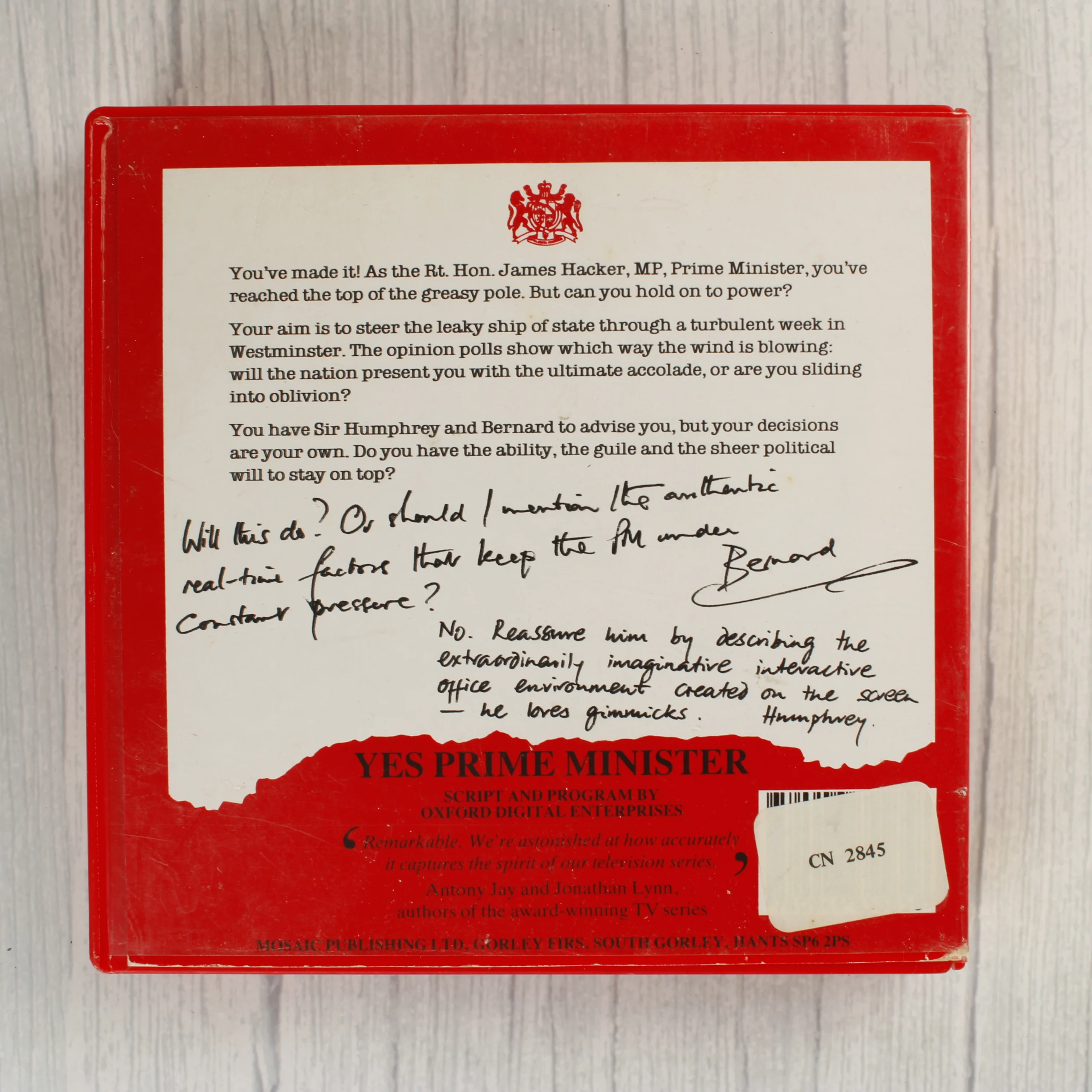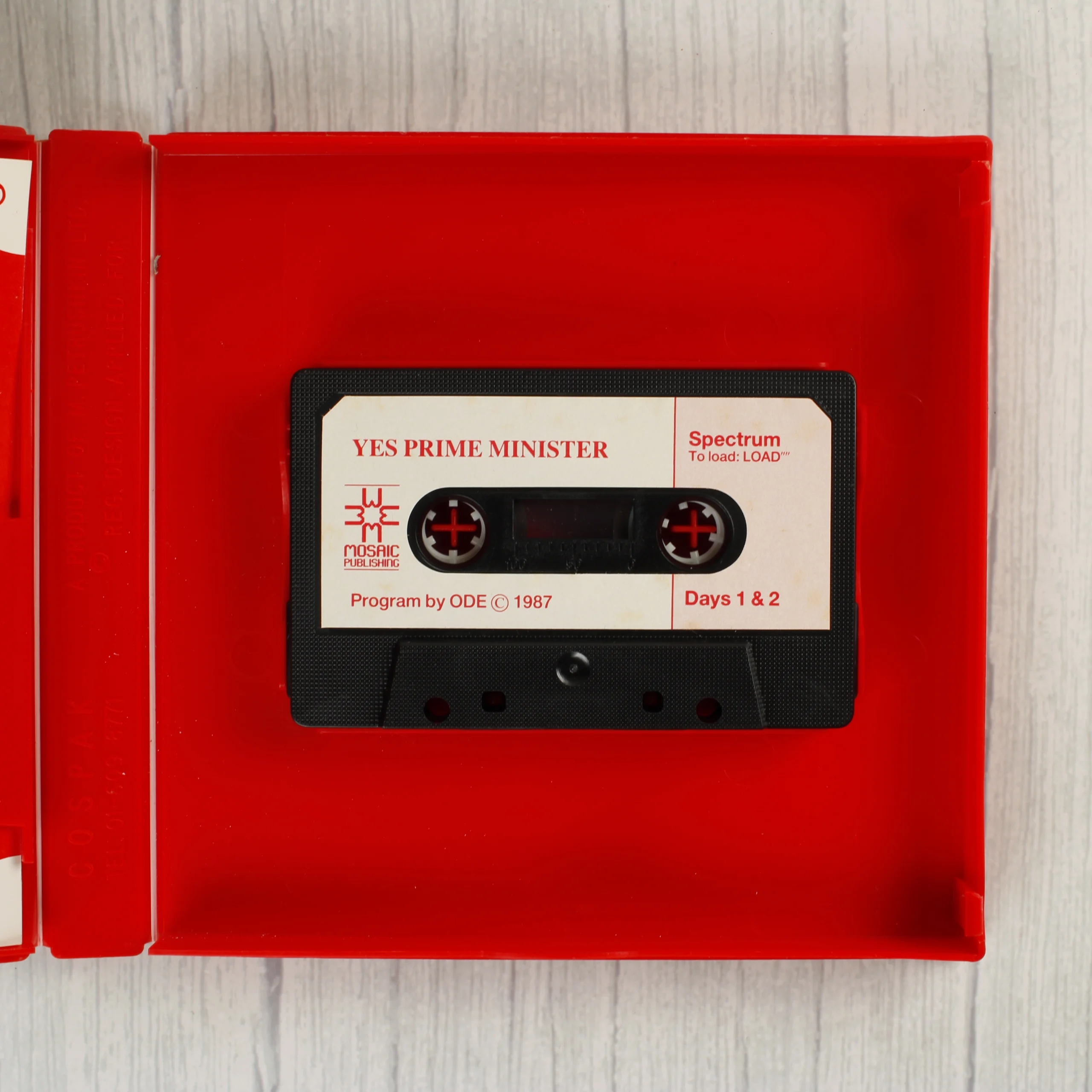 A Yes Prime Minister című videójáték ZX Spectrum platformra készült kiadása. A csomag egy piros színű, műanyagból készült, kinyitható tokot tartalmaz, amelyben egy darab fekete színű magnókazetta található. A tok előlapján aranyozott feliratok és egy címer látható, a sarkokban dekoratív aranyozott elemekkel. A hátoldalon fehér alapon fekete szöveges leírás olvasható, amely kézzel írott jegyzeteket imitáló grafikával van kiegészítve. A kazetta címkéje fehér, piros és fekete feliratokkal, rajta a Mosaic Publishing logója és az 1987-es évszám szerepel. A tok felülete helyenként karcos, a sarkoknál enyhe kopás látható, a hátoldalon pedig egy fehér árcímke vagy azonosító matrica maradványa található.
