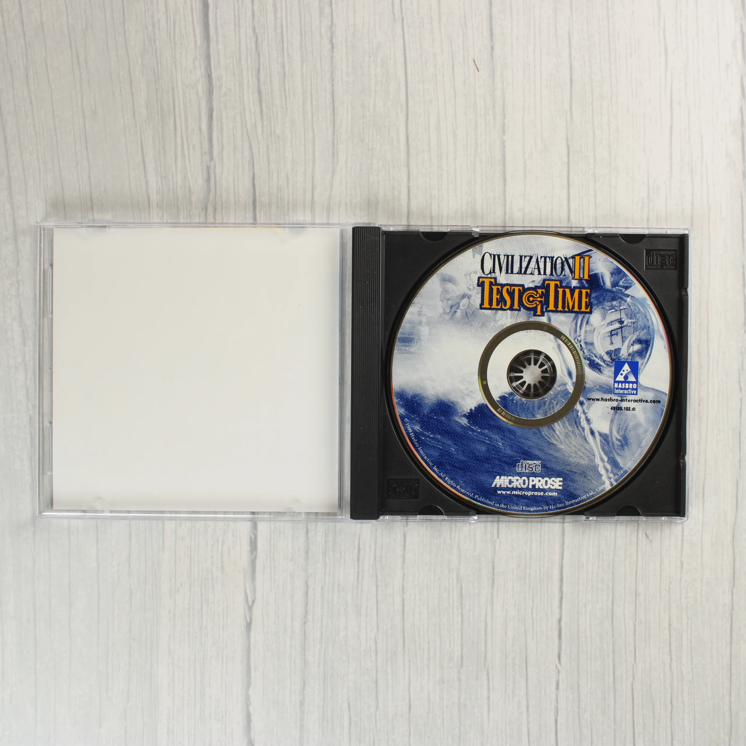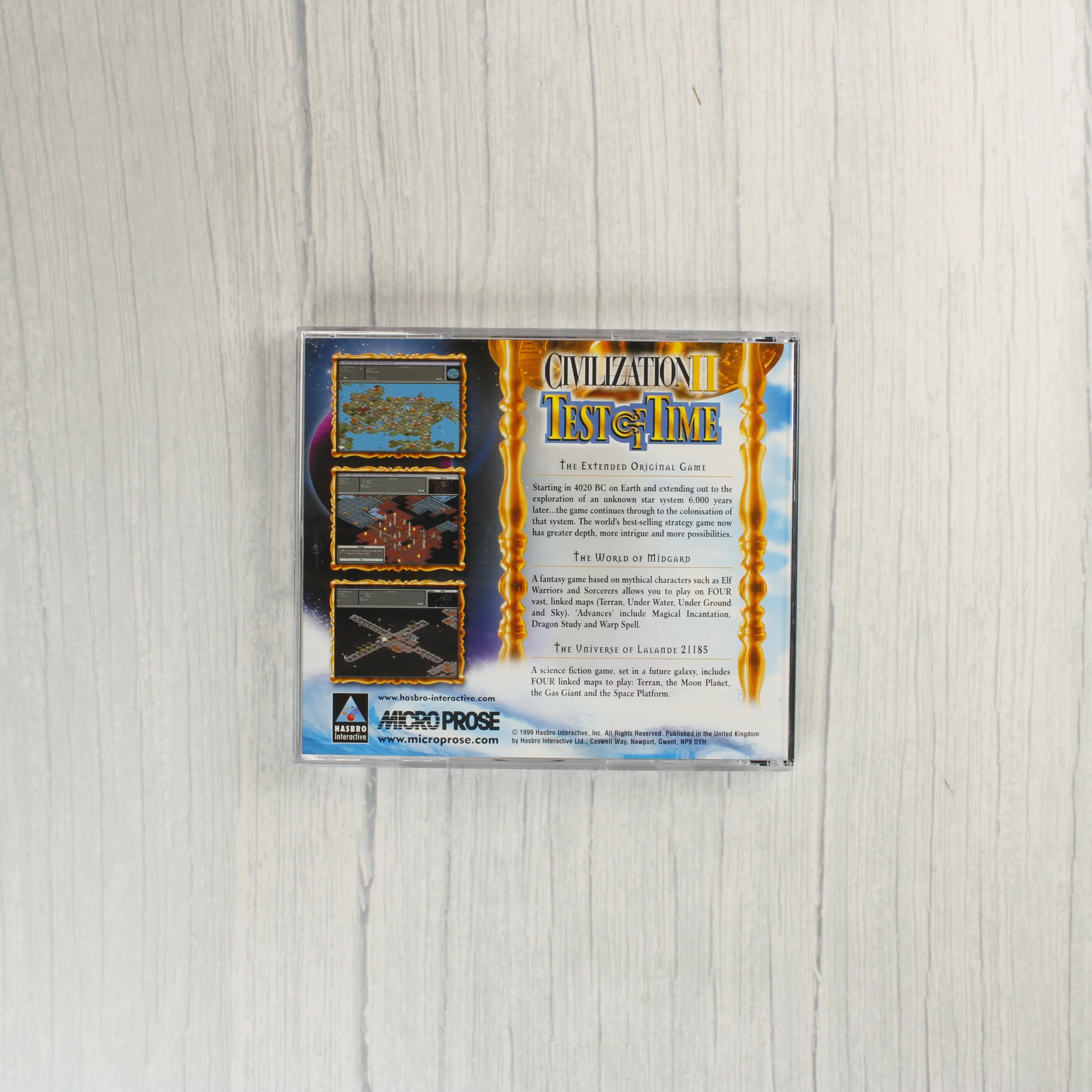 A Civilization II: Test of Time egy PC-re megjelent stratégiai videójáték, amely nagy méretű, álló formátumú kartondobozban került forgalomba. A csomag tartalmazza a játékot egy normál CD-tokban, a telepítőlemezt, két darab nyomtatott kézikönyvet és egy kihajtható technológiai fát ábrázoló posztert. A doboz elején egy homokórát formázó grafika látható, amelyben egy vitorláshajó és különböző történelmi korszakok szimbólumai jelennek meg. A hátoldalon képernyőképek és a játék három különböző világának leírása olvasható. A kiadvány a MicroProse és a Hasbro Interactive logóit viseli. A fizikai hordozó egy CD-ROM, amely kék-fehér grafikával van ellátva. A papíralapú mellékletek színes nyomtatásúak, a kézikönyvek borítója megegyezik a doboz grafikájával.