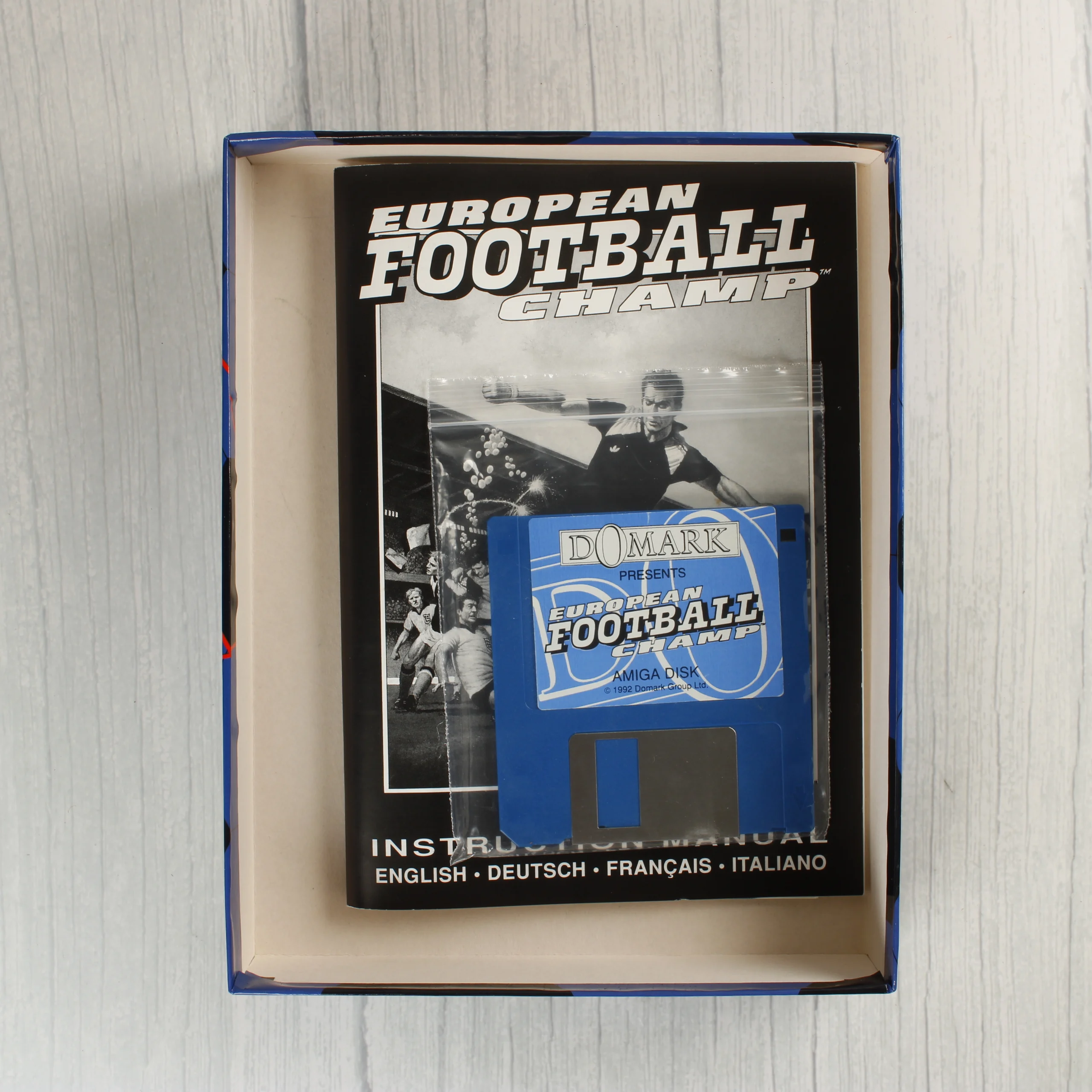 A European Football Champ egy Amiga platformra megjelent videójáték, amelyet a Domark adott ki. A csomag tartalmazza az eredeti, színes illusztrációval ellátott kartondobozt, egy többnyelvű (angol, német, francia, olasz) használati útmutatót és egy kék színű, 3,5 colos floppy lemezt. A doboz elején egy dinamikus futballjelenet látható, a hátoldalán pedig angol és olasz nyelvű leírás, valamint játékmenet-képek kaptak helyet. A floppy lemez egy átlátszó műanyag tasakban található a dobozon belül. A kiadvány az 1992-es évből származik, a Taito licencével készült. A doboz sarkai és élei enyhén kopottak, de a grafika jól kivehető és a színek élénkek maradnak. A használati útmutató fekete-fehér borítóval rendelkezik, állapota megkímélt.