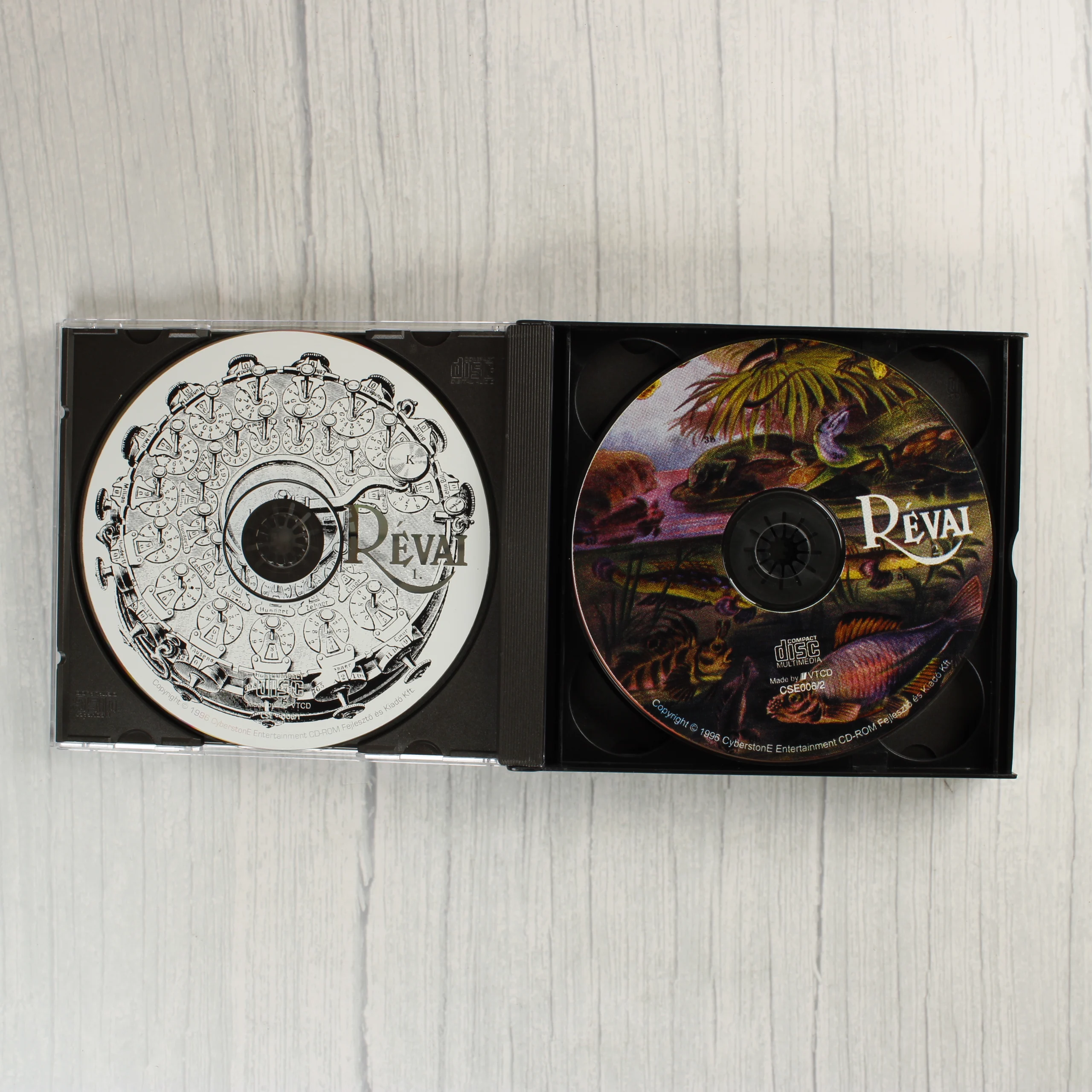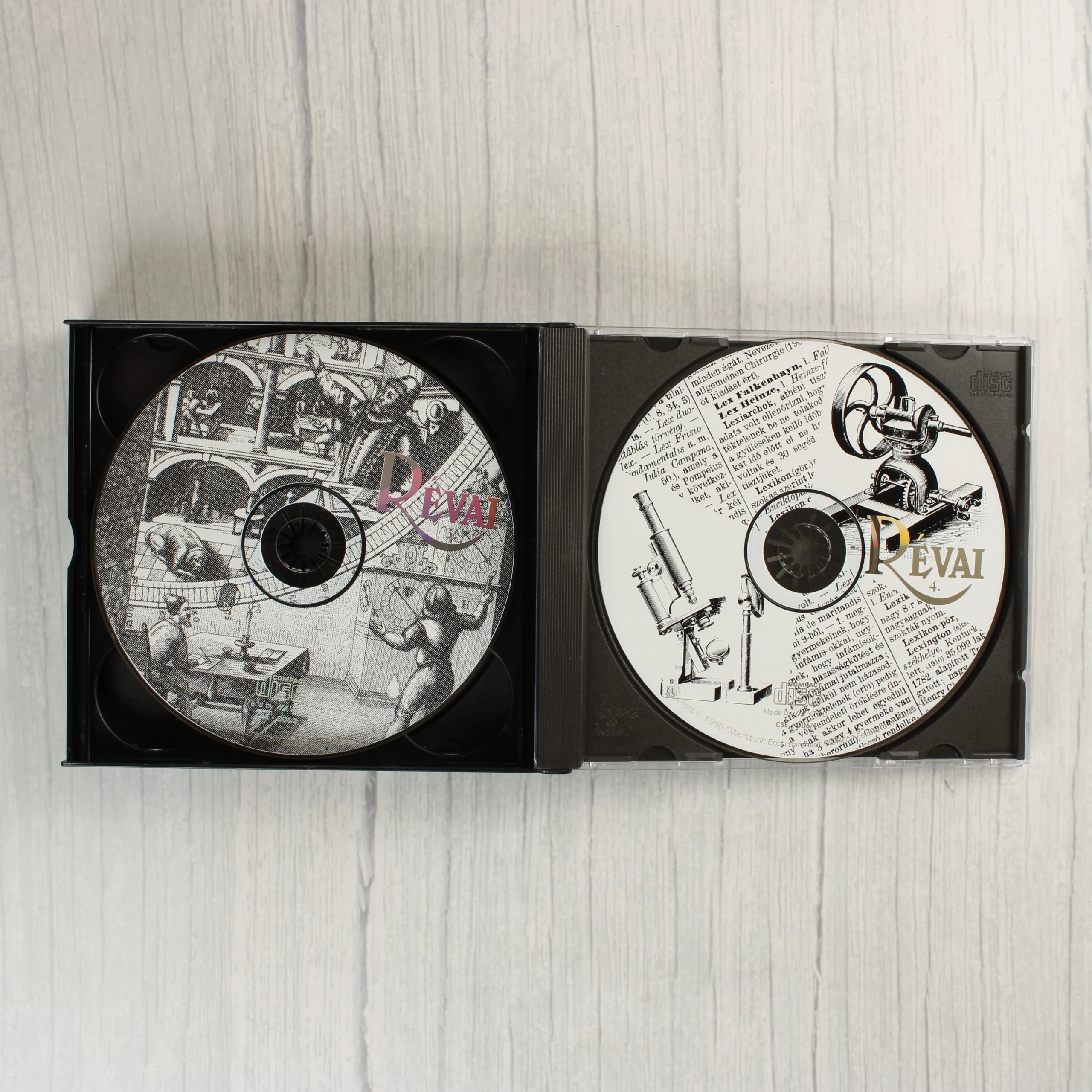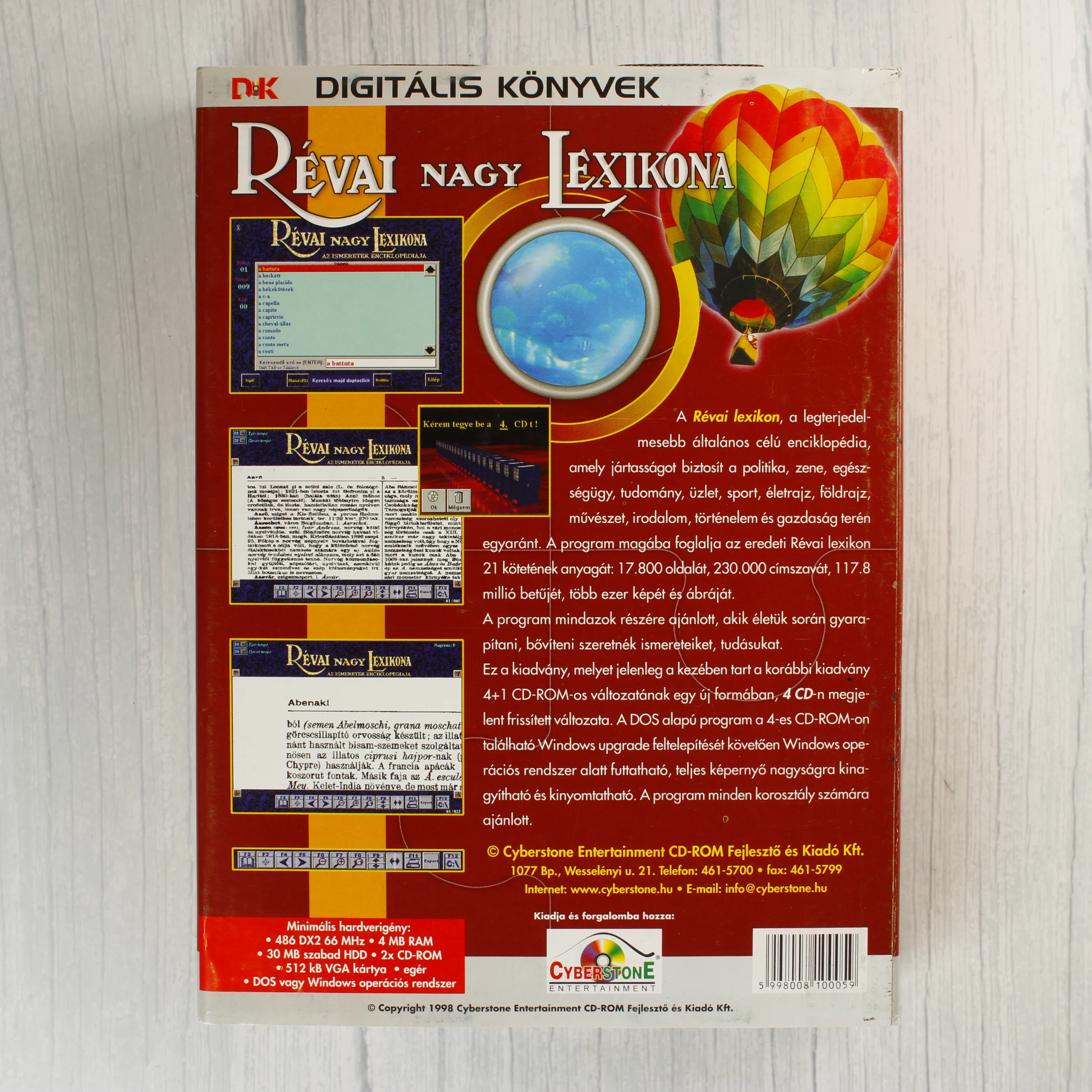 A Révai Nagy Lexikona digitális kiadása, amely 4 darab CD-ROM lemezt tartalmaz egy vastag CD-tokban, papír borítóval. A kiadvány a teljes I-XXI. kötet anyagát magában foglalja. A borítón színes illusztrációk láthatók, többek között hőlégballon, repülőgép, kiscicák és a Szabadság-szobor. A lemezek felülete egyedi grafikával díszített, fekete-fehér és színes rajzokkal. A csomagolás hátoldalán a szoftver képernyőmentései és a minimális hardverigény olvasható. A termék a Cyberstone Entertainment gondozásában jelent meg 1998-ban. A papírborító élei mentén enyhe kopás látható, de a lemezek és a tok jó állapotban vannak.