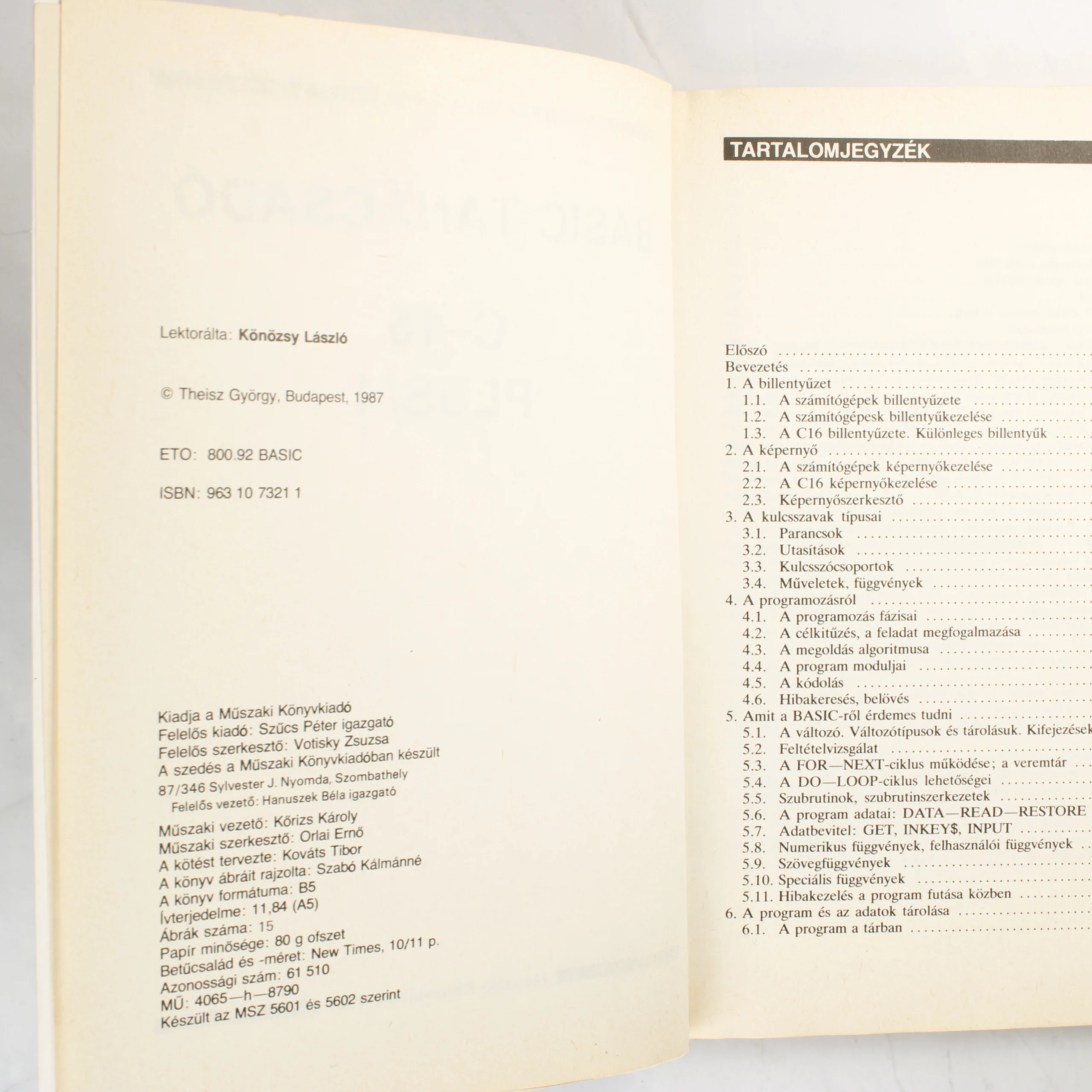 Theisz György BASIC tanácsadó C-16 Plus/4 című szakkönyve a Műszaki Könyvkiadó gondozásában jelent meg 1987-ben. A puhafedeles kötet borítója fehér alapszínű, rajta piros és kék feliratokkal, valamint egy grafikus illusztrációval, amely a C-16 feliratot ábrázolja perspektivikus elrendezésben. A könyv B5 formátumú, belső oldalai enyhén sárgultak az idő múlásával, de a szöveg és a tartalomjegyzék tisztán olvasható. A borítón minimális használati nyomok és apróbb elszíneződések láthatóak, a sarkok épek. A kiadvány részletes útmutatást nyújt a BASIC programozási nyelv használatához a megjelölt számítógéptípusokon, érintve a billentyűzetkezelést, a képernyőszerkesztést és a programozási fázisokat.