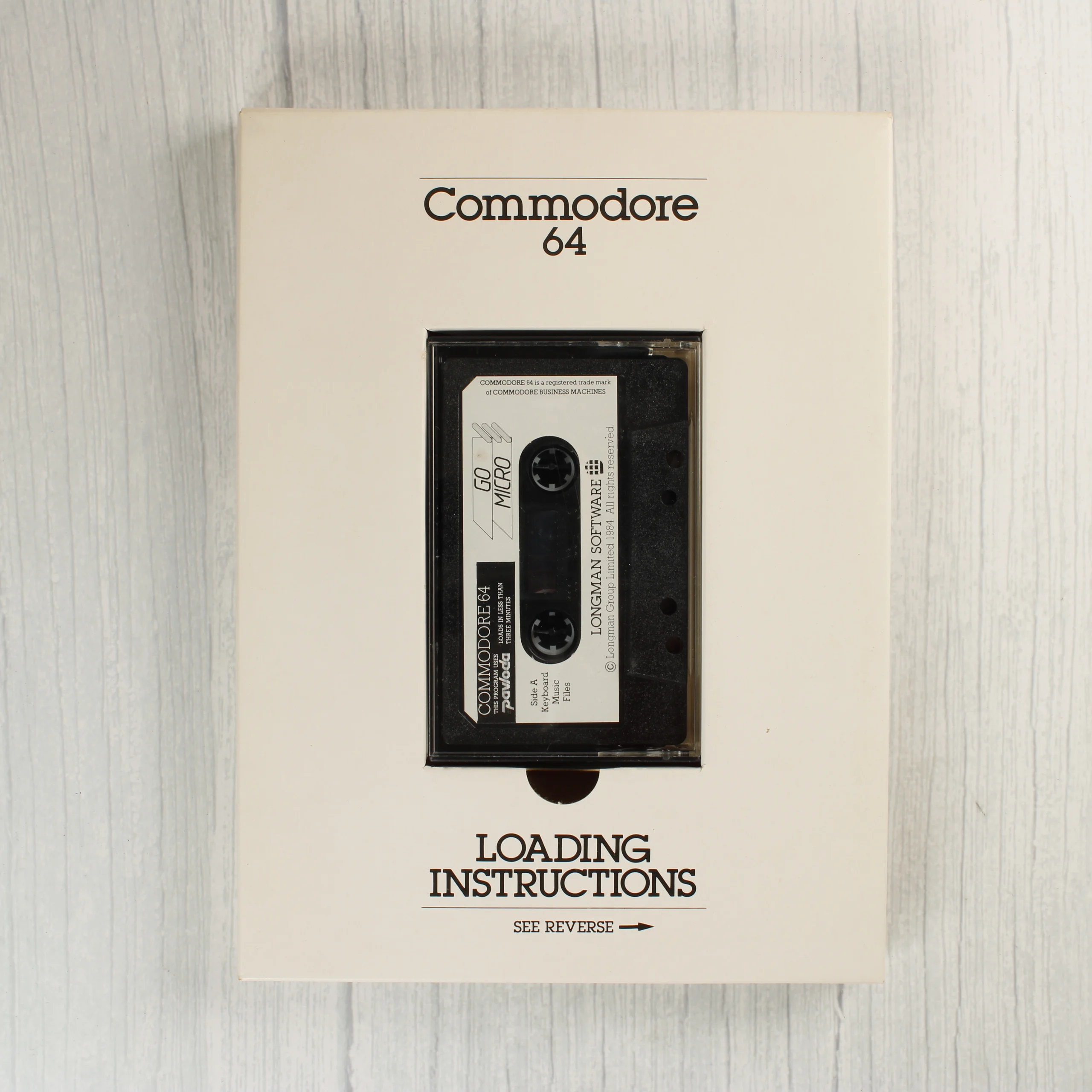 A Go Micro egy Commodore 64 platformra készült oktatócsomag, amelyet a Longman Software adott ki. A termék egy nagyméretű kartondobozban érkezik, amelynek előlapján egy számítógép előtt ülő család látható. A csomag tartalmaz egy illusztrált könyvet és egy mágnesszalagos kazettát, amely öt különböző programot rejt. A doboz hátoldalán részletes leírás olvasható a tartalomról, valamint itt található az ISBN azonosító és a vonalkód is. A belső papírbetét rögzíti a fekete műanyag házas kazettát, amelyen fehér címke jelzi a programokat. A csomagolás grafikája a 80-as évek stílusát idézi, kék, zöld és rózsaszín sávokkal díszítve.