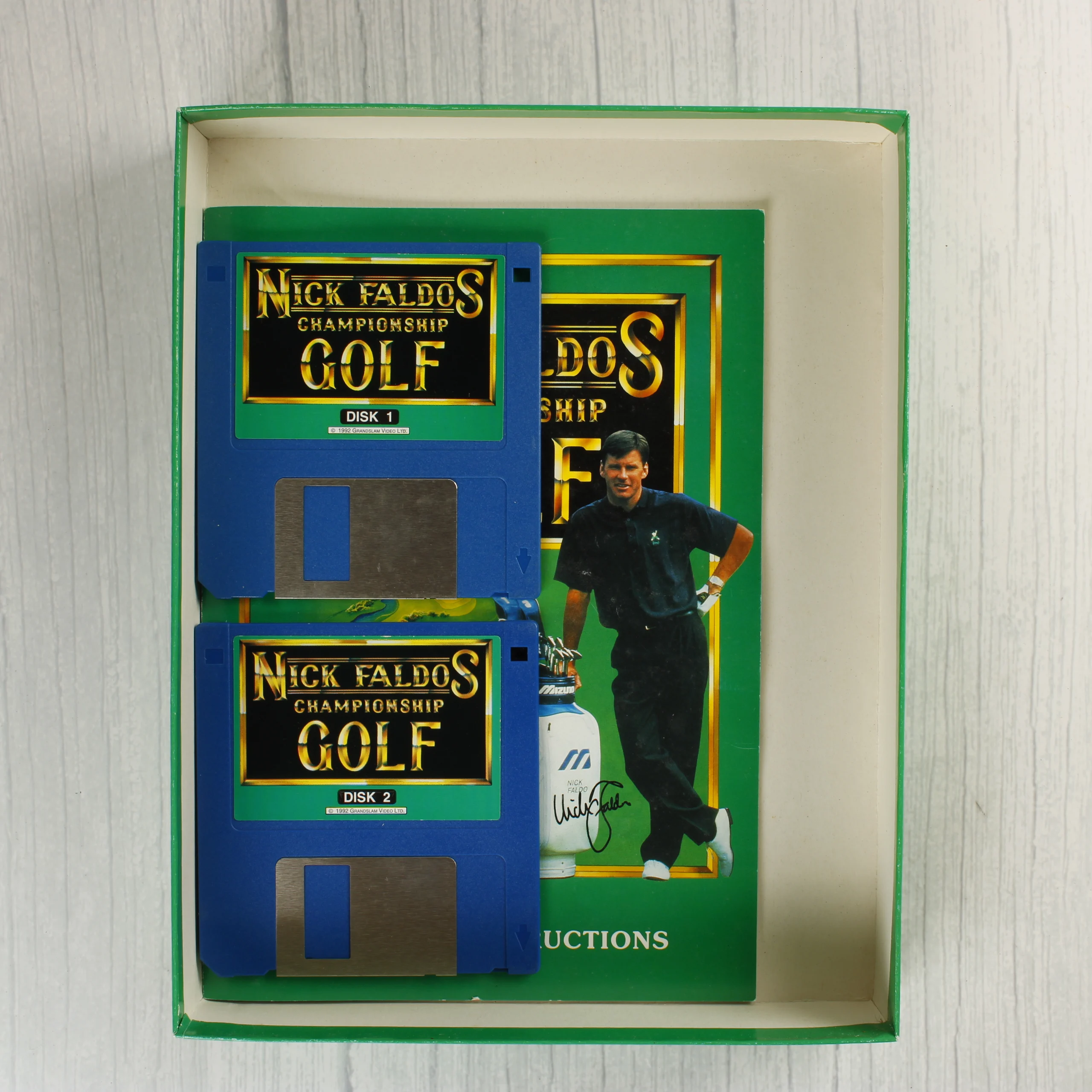 A Nick Faldo's Championship Golf videójáték Amiga platformra készült kiadása eredeti kartondobozban. A csomag tartalmaz két darab kék színű, 3,5 colos floppy lemezt, valamint a hozzá tartozó színes használati útmutatót. A doboz előlapján Nick Faldo golfozó látható egy golfpálya illusztrációja mellett, zöld alapszínnel és aranyozott kerettel. A hátoldalon a játékból vett képernyőmentések és angol nyelvű leírások találhatók. A doboz élei mentén látható némi kopás, de a grafika ép és jól olvasható. A floppy lemezek címkéi tiszták, a fém védőlemezek sértetlenek.
