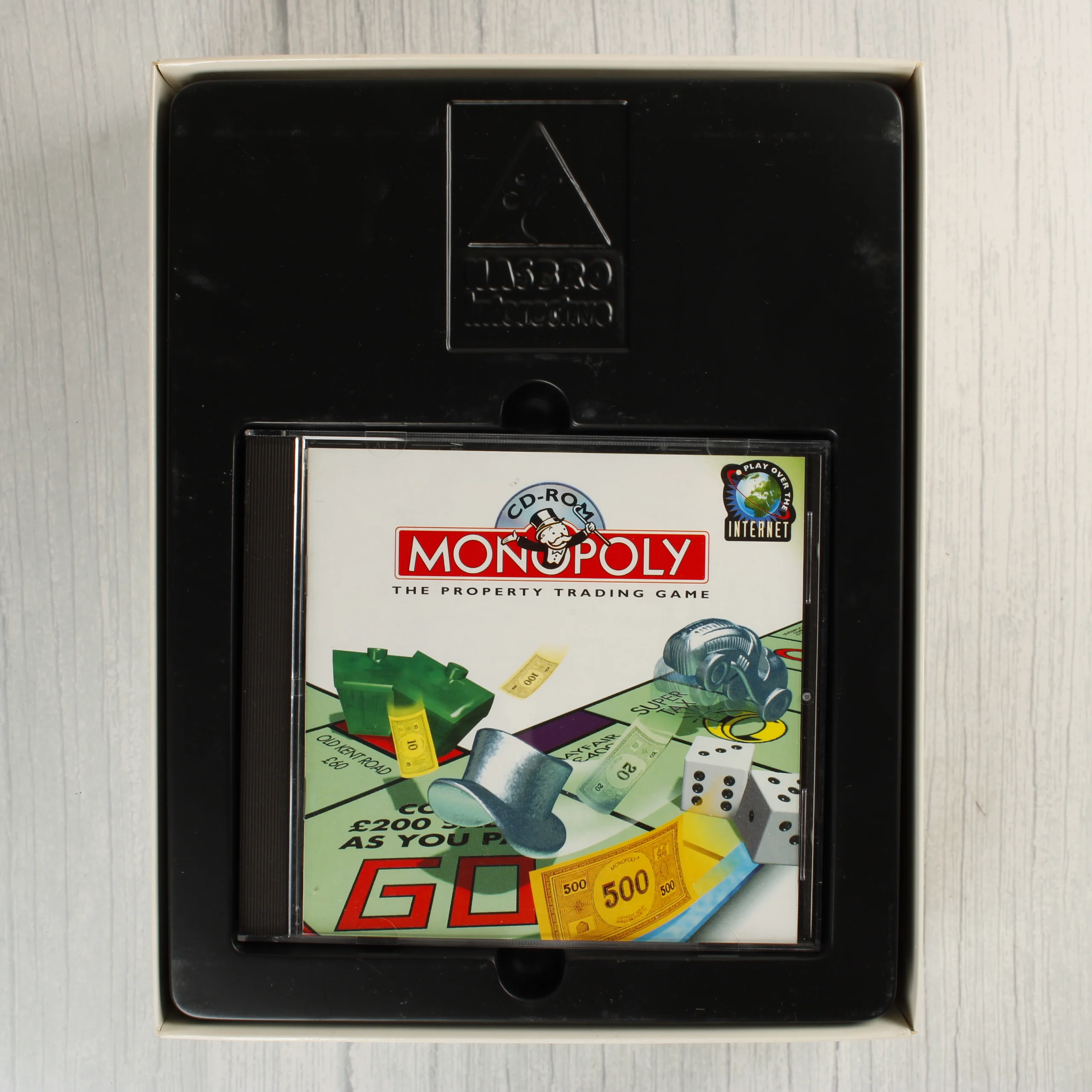 A Monopoly videójáték CD-ROM kiadása, amely az eredeti kartondobozos csomagolásban található. A készlet tartalmazza a külső papírdobozt, egy fekete műanyag belső tálcát, valamint egy normál CD-tokot a játéklemezzel és a hozzá tartozó füzettel. A doboz grafikája a klasszikus Monopoly elemeket ábrázolja 3D-s stílusban, kiemelve az internetes játéklehetőséget. A lemez felülete illusztrált, a Hasbro Interactive és a Westwood Studios logói láthatóak rajta. A csomagolás angol nyelvű feliratokat tartalmaz, a hátoldalon képernyőmentések és a játék jellemzői olvashatóak. A fizikai hordozó egy szabványos CD-ROM lemez.