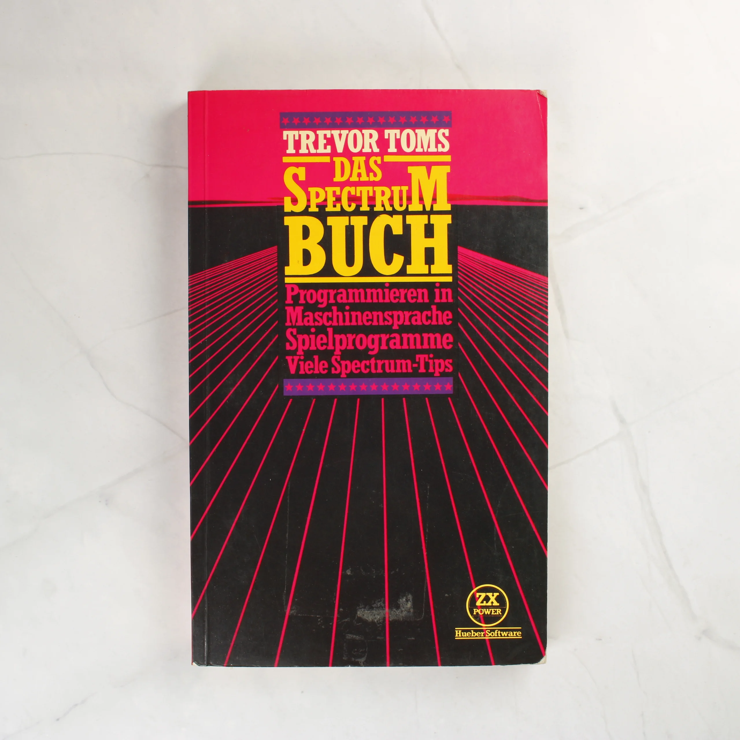 Trevor Toms által írt Das Spectrum Buch című német nyelvű szakkönyv, amely a Sinclair ZX Spectrum számítógép programozásával foglalkozik. A puhafedeles kötet borítója fekete és piros alapszínű, sárga és fehér feliratokkal. A borítón perspektivikus piros vonalak láthatók, amelyek egy központi pont felé tartanak. A kiadvány a Hueber Software gondozásában jelent meg a ZX Power sorozat részeként. A könyv hátoldala teljes egészében piros, rajta fehér és sárga német nyelvű ismertető szöveg olvasható. A borító élei mentén enyhe kopás és használati nyomok láthatók, a sarkok minimálisan lekerekedtek.