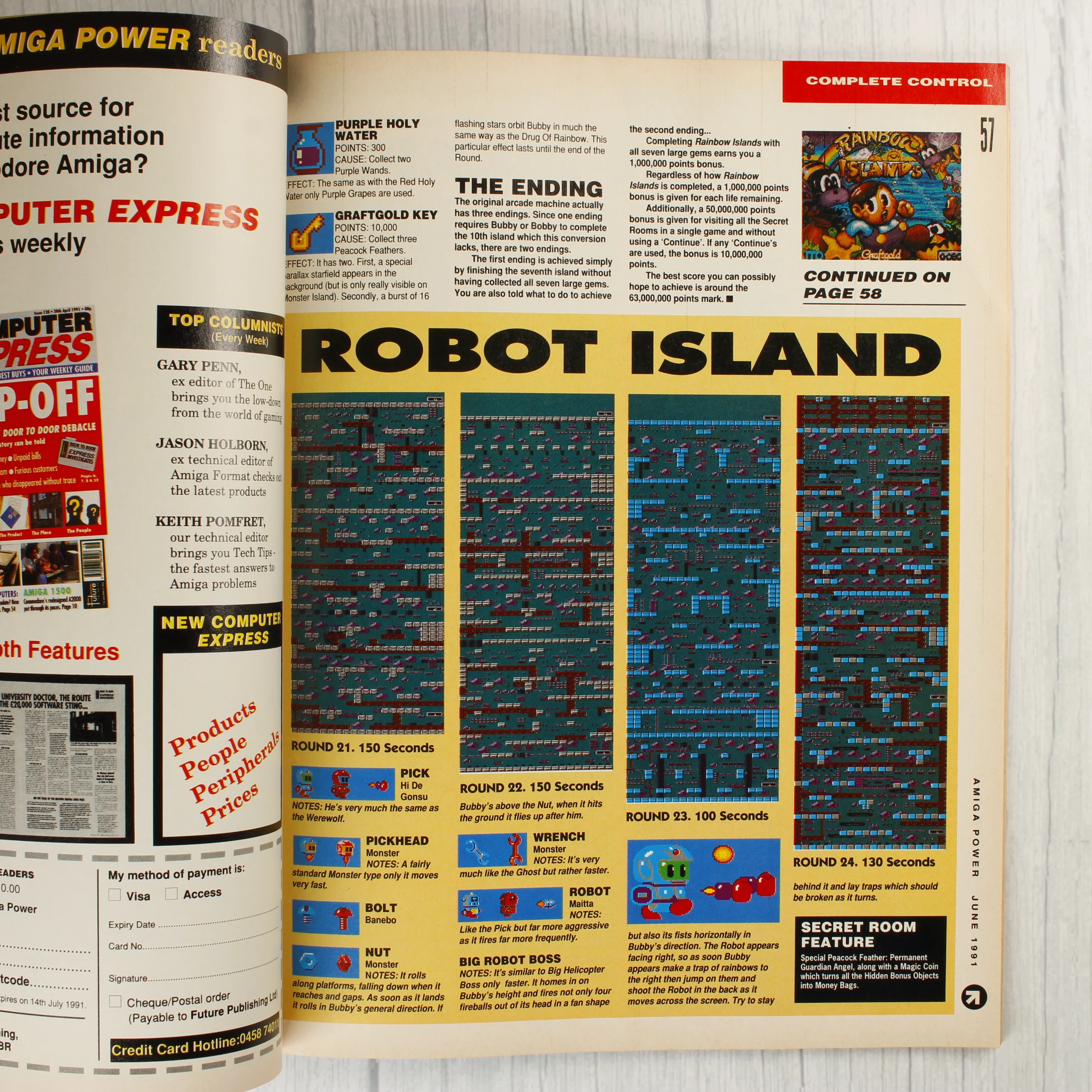 Az Amiga Power magazin 1991. júniusi, 2. lapszáma. A címlapon Peter Molyneux látható, valamint utalások olyan klasszikus videójátékokra, mint a Monkey Island, a Populous II és a Kid Gloves. A kiadvány a Future Publishing gondozásában jelent meg. A belső oldalakon részletes játéktesztek, leírások és képernyőmentések találhatók, többek között a 3D Construction Kit és a Rainbow Islands játékokról. A magazin angol nyelvű, papír alapú, tűzött kötésű. A borítón színes illusztrációk és tipográfia látható, a korszakra jellemző stílusban.