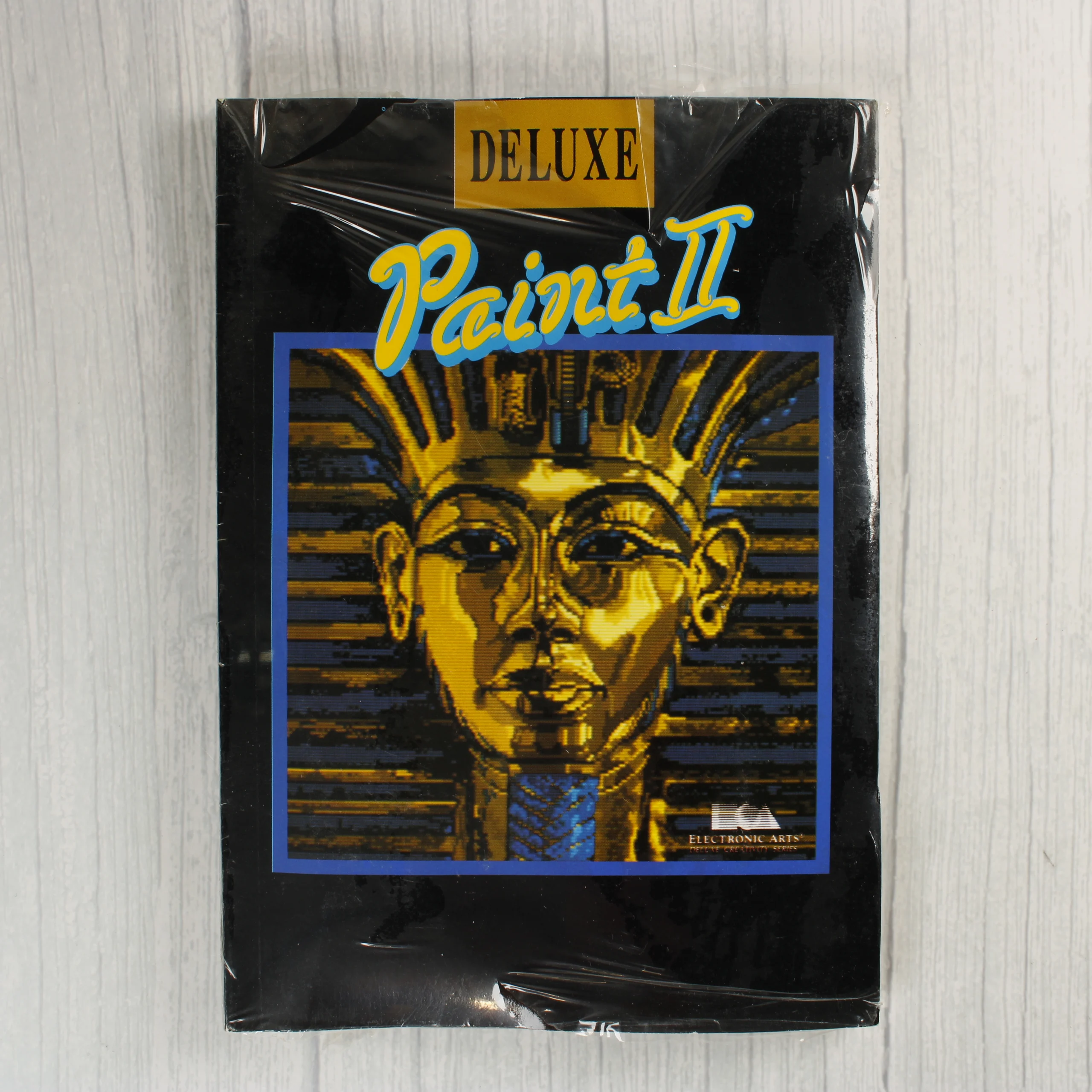 Az Electronic Arts által kiadott Deluxe Paint II szoftver eredeti dobozos kiadása Amiga platformra. A fekete színű kartondoboz előlapján egy arany színű, egyiptomi fáraót ábrázoló grafika látható, felette a sárga és kék színű Deluxe Paint II felirattal. A doboz hátoldalán az Amiga logó, repülőgépek, egy szamuráj és különböző szoftverekből származó képernyőmentések kaptak helyet, valamint egy rövid angol nyelvű leírás a kiadó Amiga-kínálatáról. A termék gyári védőfóliában van, amely több helyen gyűrött és tükröződik, de védi a doboz épségét. A csomagolás sarkai és élei a fólia alatt is épnek tűnnek. A hátoldalon az Electronic Arts logója és a brit kirendeltség címe is olvasható.