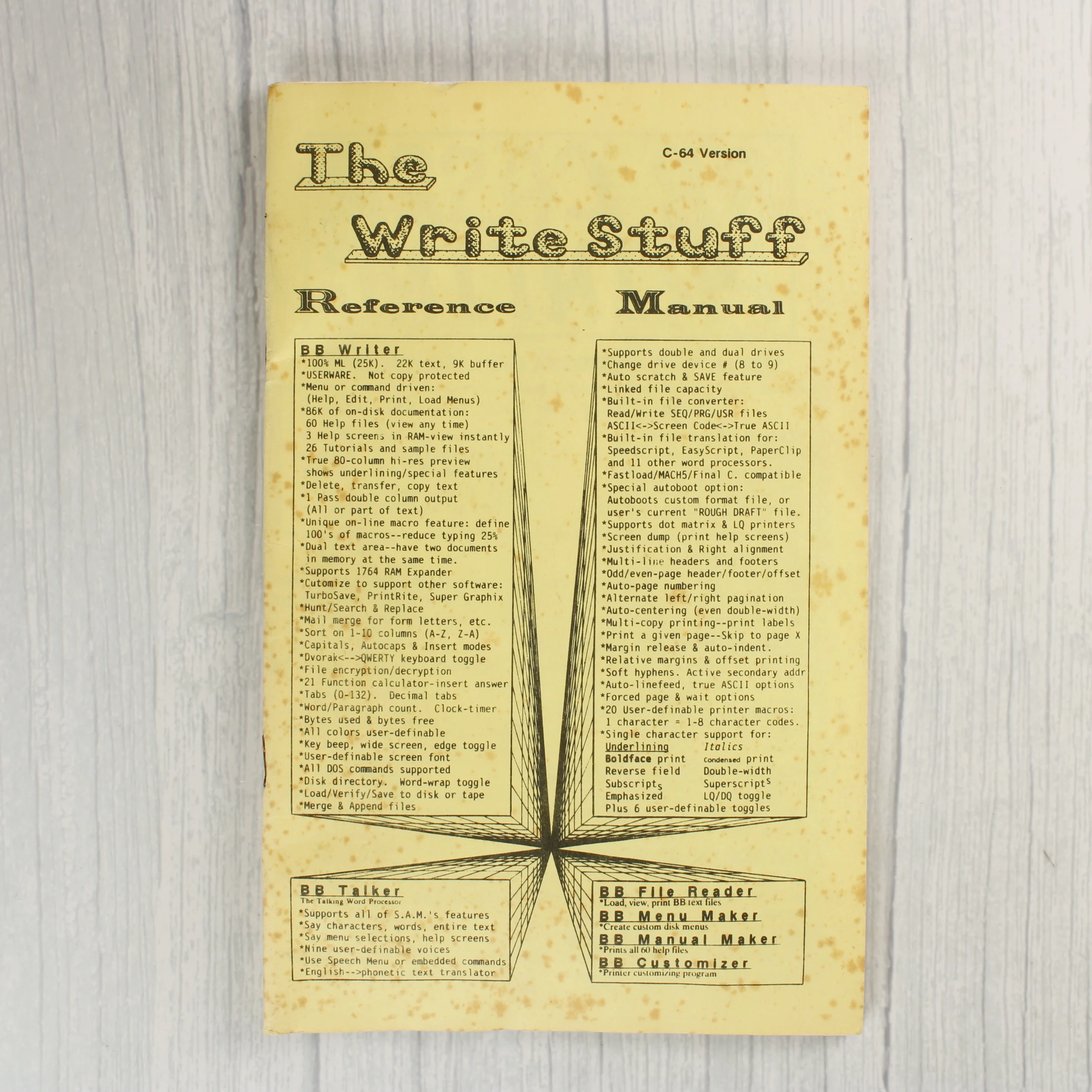 A The Write Stuff szoftver Commodore 64-es verziója, amely egy 5,25 colos floppy lemezt és egy hozzá tartozó használati útmutatót tartalmaz. A szoftvert a Busy Bee Software adta ki 1987-ben. A csomag része egy fekete floppy lemez sárga címkével, amelyen a szoftver neve és egy egyedi sorszám látható, valamint egy fehér papírtok a lemez tárolására. A mellékelt használati útmutató sárgás színű papírra készült, fekete nyomtatással, és részletesen ismerteti a program funkcióit, mint például a szövegszerkesztést és a fájlkezelést. A papíralapú dokumentáción apróbb foltok és az idő múlására utaló elszíneződések láthatók, de a szöveg jól olvasható marad. A floppy lemez és a tok állapota megkímélt, jelentős fizikai sérülés nem látható rajtuk. A termék doboz nélkül kerül bemutatásra.