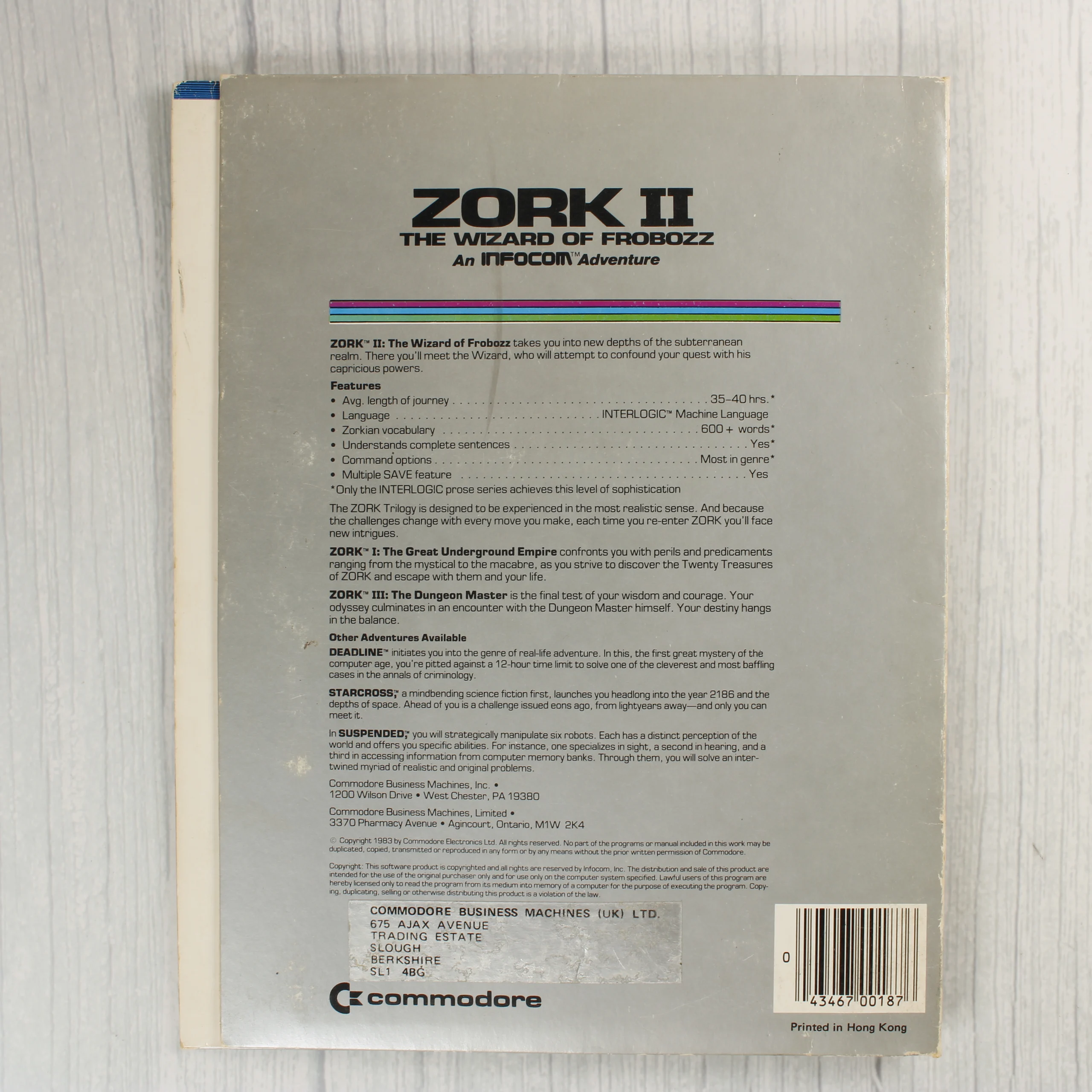 A Zork II: The Wizard of Frobozz című videójáték Commodore 64-es kiadása. A csomag egy nagyméretű, keményfedeles kartonmappát tartalmaz, amelynek elején a játék címe, a Commodore logó és egy illusztráció látható, amely egy varázslót és egy kőfalba vájt kaput ábrázol. A hátoldalon a játék jellemzői, a történet leírása és a kiadó adatai olvashatók. A mappa belsejében egy papírtasakban helyezkedik el az 5,25 colos floppy lemez, amelyen fehér alapon kék feliratú címke található a játék nevével és a C64626-os azonosítóval. A csomagolás és az adathordozó korának megfelelő, megkímélt állapotban van.