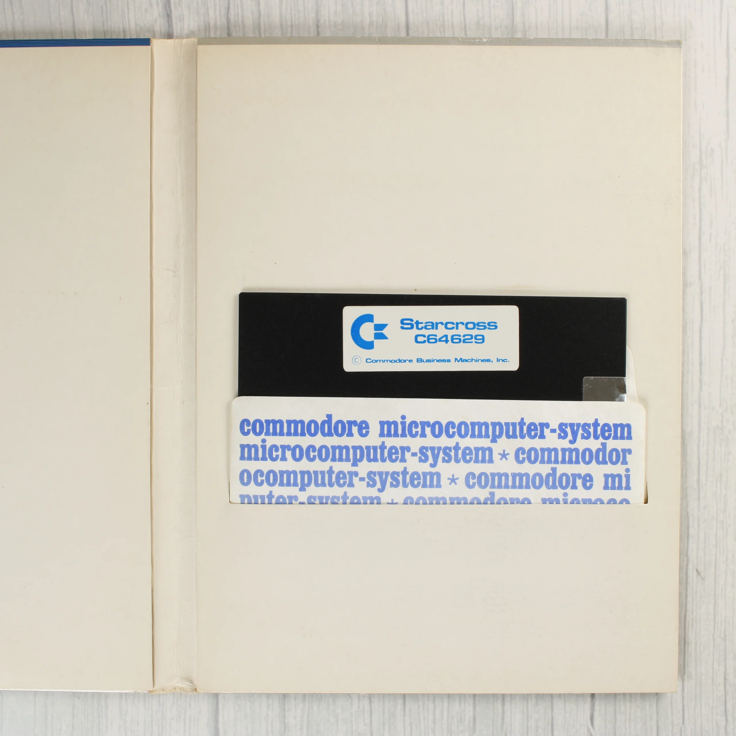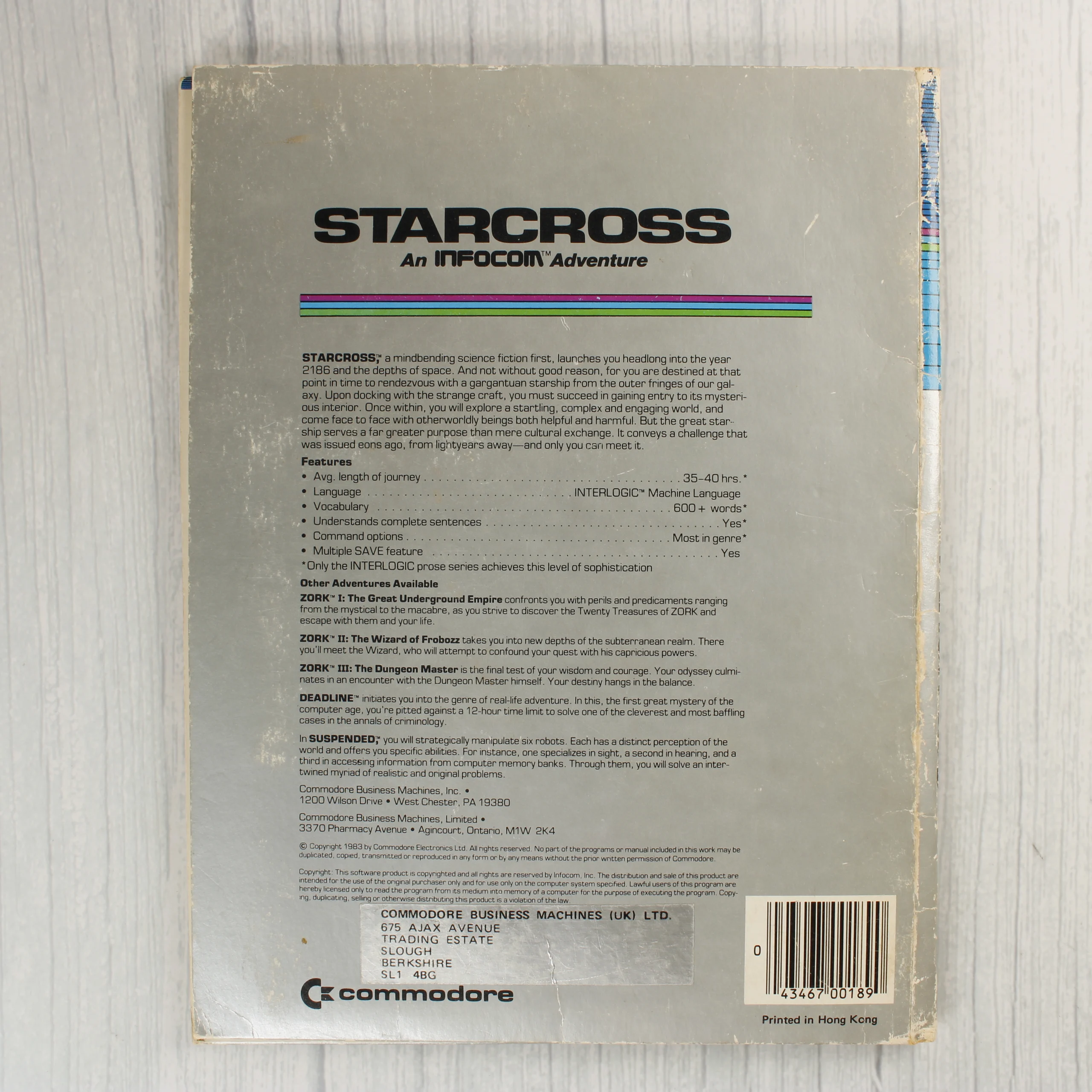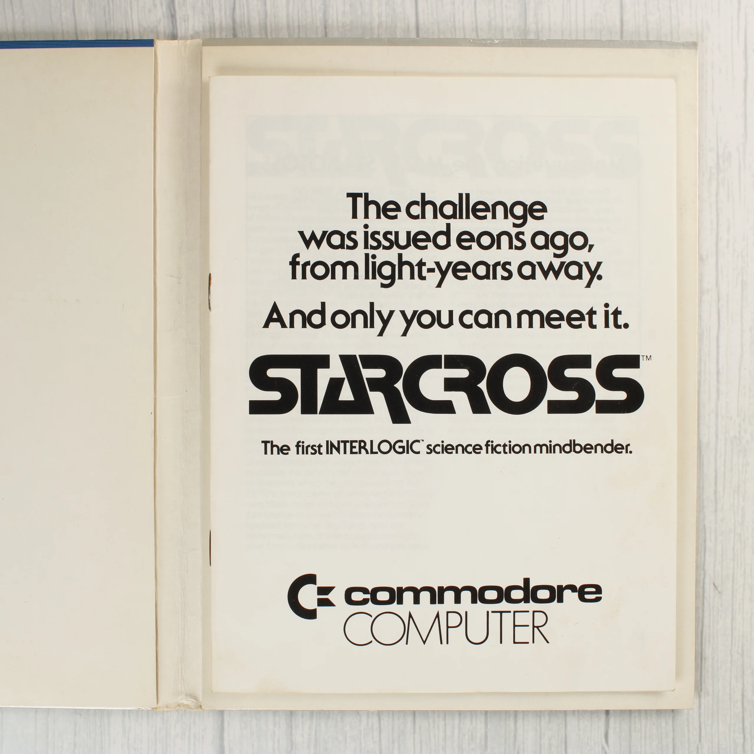 A Starcross című videójáték Commodore 64-es kiadása, amely egy Infocom kalandjáték. A csomag tartalmazza az eredeti, könyvszerűen nyitható kartontokot, amelynek elején egy űrhajó és egy radarkép látható. A tok belsejében egy 5,25 colos floppy lemez található, saját papírtokjában. A készlet része továbbá egy nagyméretű, fekete alapon fehér grafikával ellátott navigációs térkép és egy használati útmutató füzet. A borítón és a hátoldalon a Commodore és az Infocom logói, valamint a játék rövid leírása és technikai jellemzői olvashatók. A csomagolás és a mellékletek koruknak megfelelő állapotban vannak, a széleken és a sarkokon látható kopásokkal.