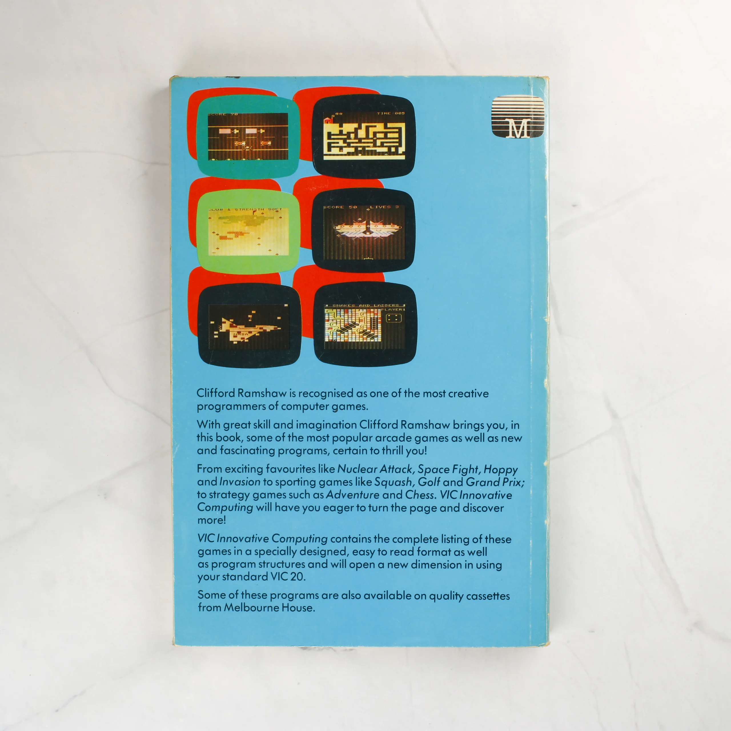 A VIC Innovative Computing című könyv Clifford Ramshaw tollából, amely a Commodore VIC-20 számítógéphez kínál programokat. A borító élénk narancssárga alapszínű, rajta a VIC logóval és a számítógép fotójával, valamint geometrikus alakzatokkal. A hátoldal világoskék, és hat darab képernyőmentést mutat be a könyvben található videójátékokból. A kiadvány puhafedeles, ragasztott kötéssel készült. A borító szélei mentén enyhe kopás és használati nyomok láthatóak, de a könyv szerkezetileg ép. A Melbourne House kiadó logója mindkét oldalon szerepel.