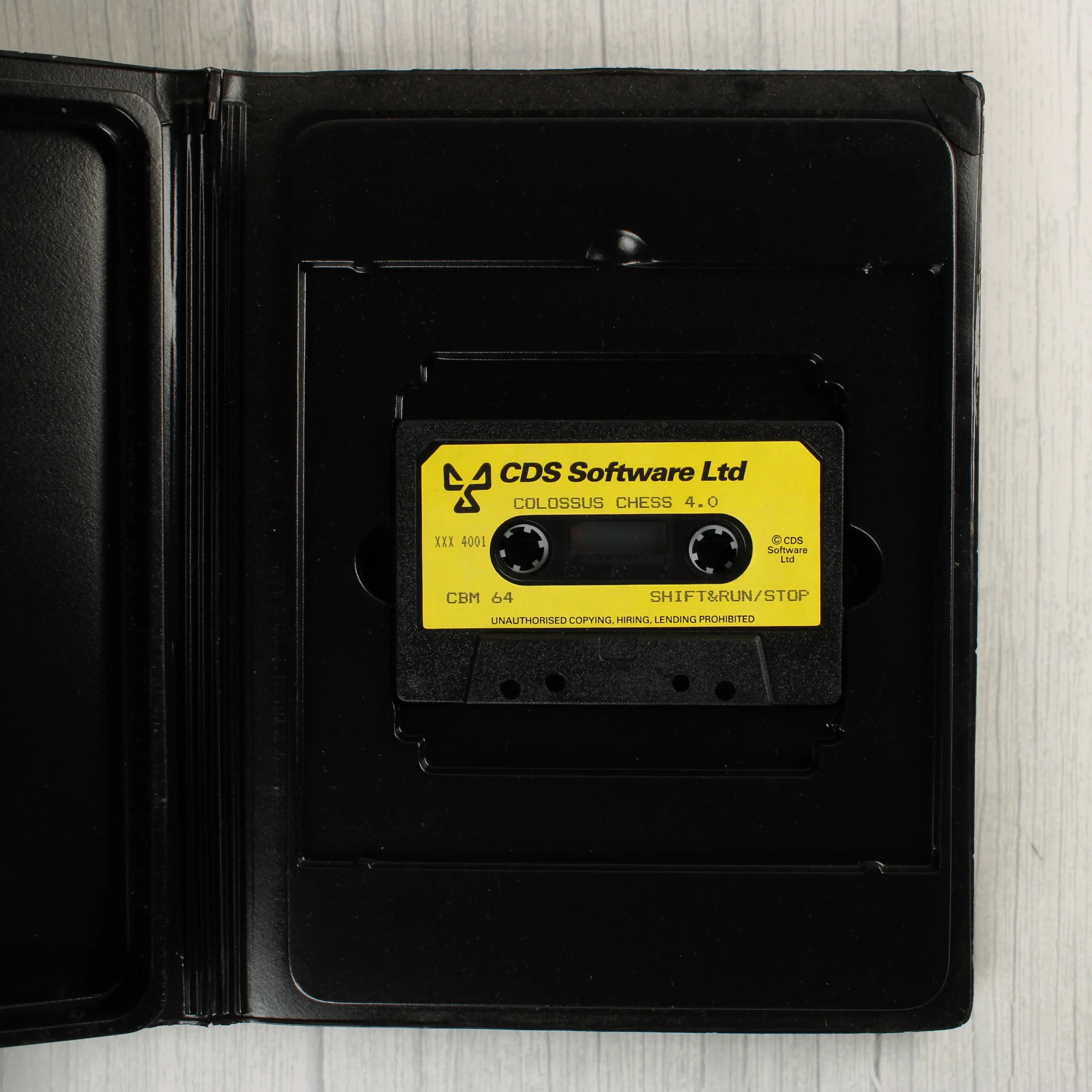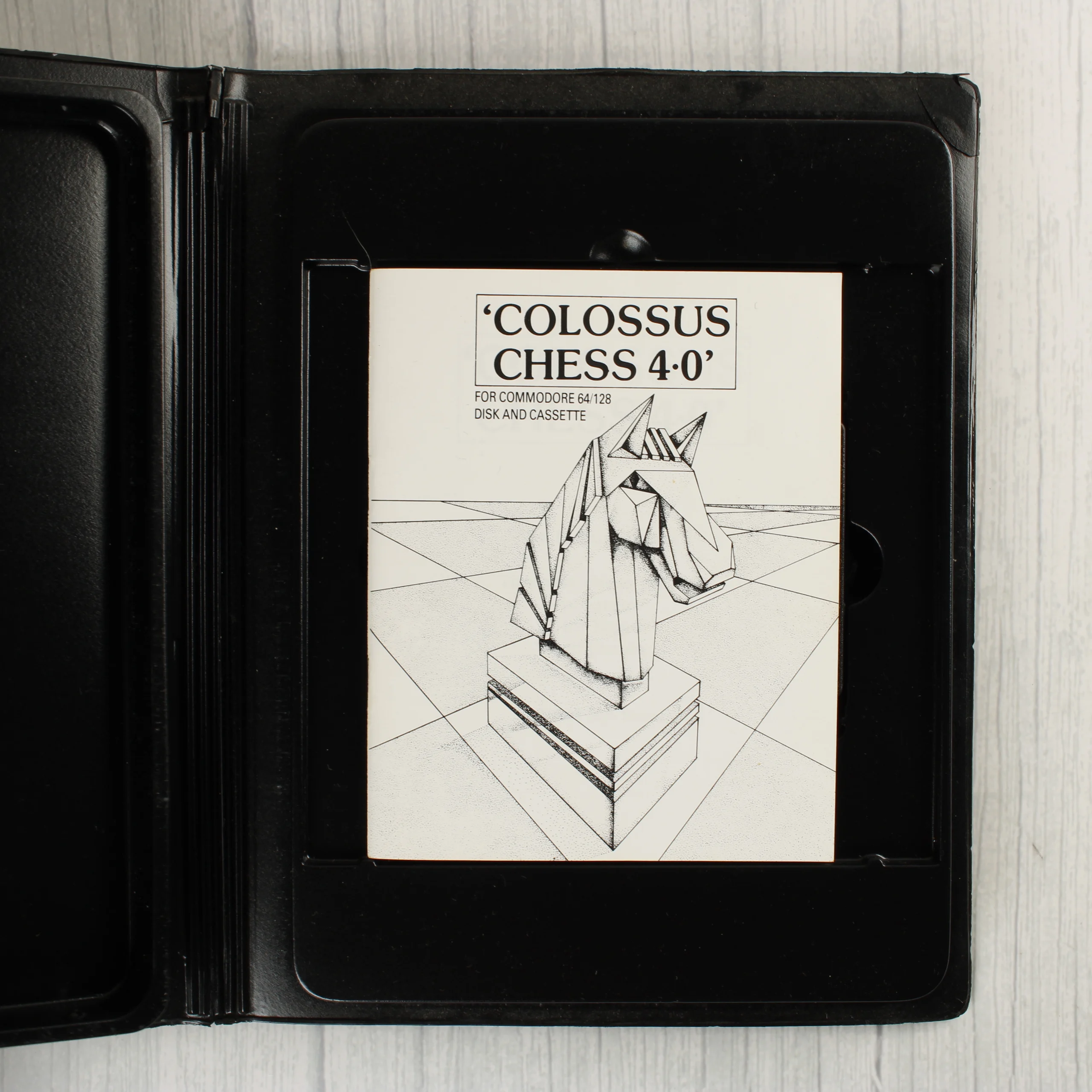 A Colossus 4 Chess videójáték Commodore 64 és C128 platformokra. A csomag egy fekete műanyag tokot tartalmaz, amelyben egy sárga címkés adathordozó kazetta és egy fekete-fehér illusztrációval ellátott használati útmutató található. A borítón egy stilizált, fehér sakkfigura (ló) látható egy kék-fehér sakktábla mintás felületen, vöröses alkonyati háttér előtt. A tok elején egy régi árcímke maradványa látható. A hátoldalon részletes angol nyelvű leírás olvasható a szoftver funkcióiról, valamint a CDS Software Ltd. elérhetőségei és egy vonalkód is szerepel rajta. A kazetta fekete házas, sárga matricával, amelyen a játék címe és a betöltési parancsok láthatóak.