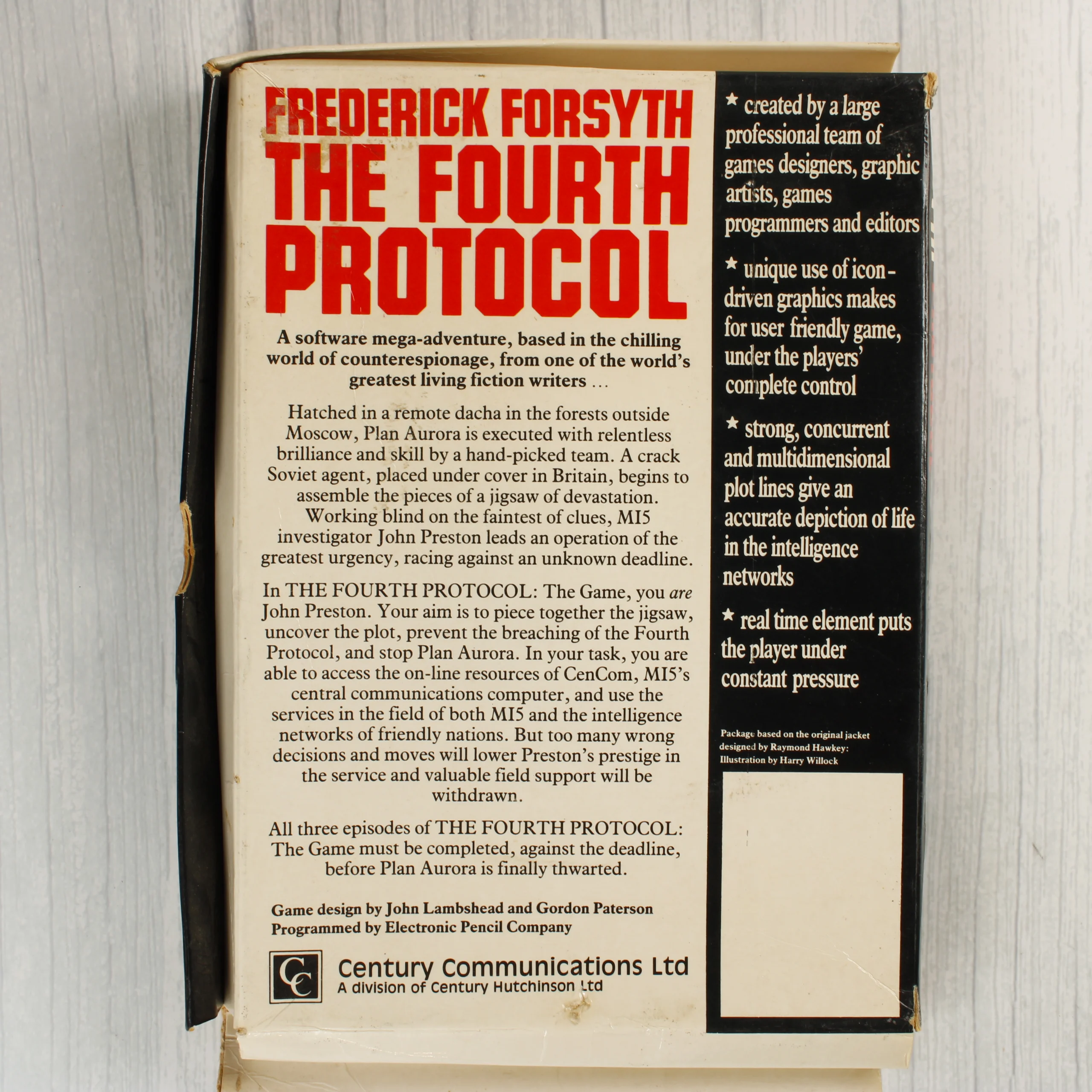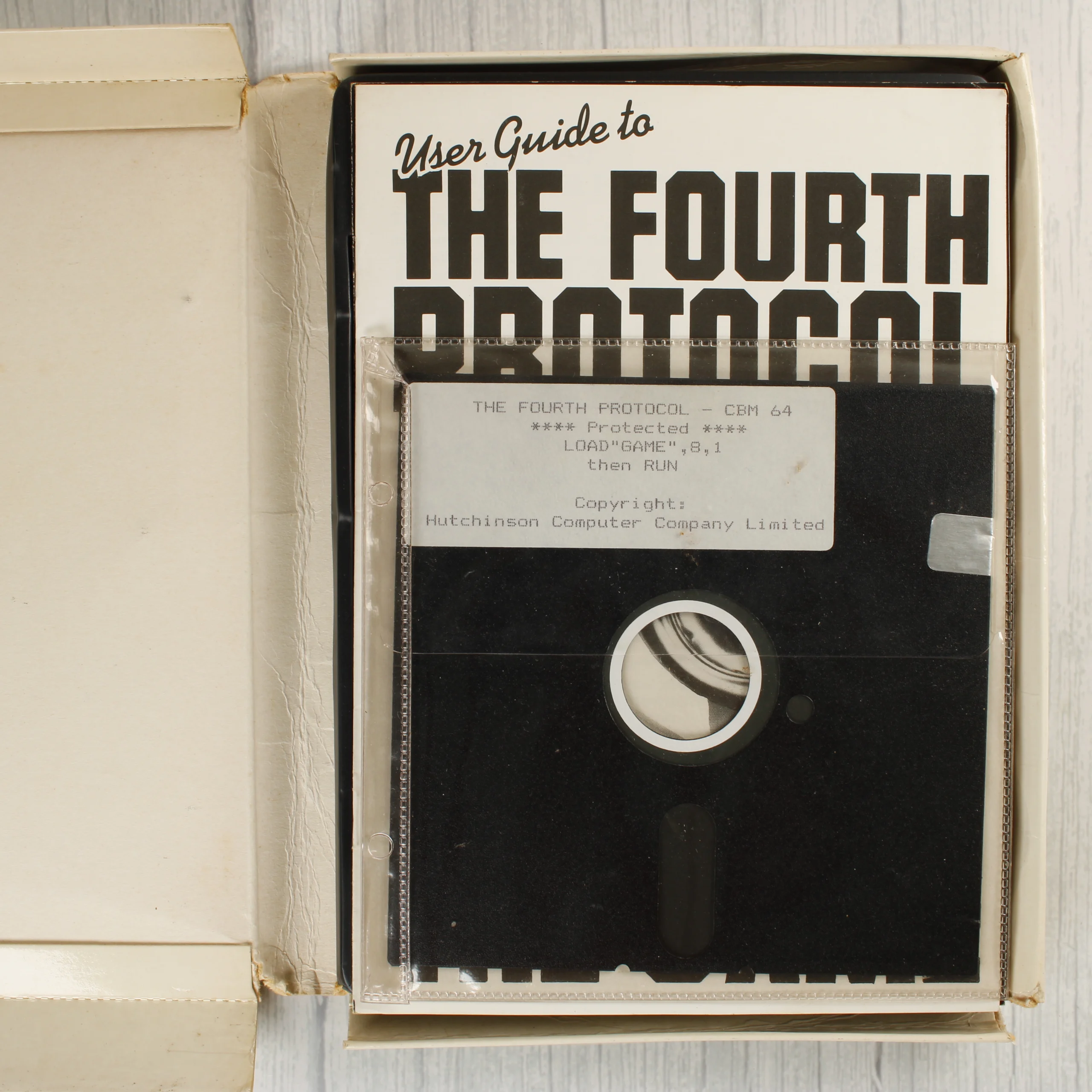 A Frederick Forsyth: The Fourth Protocol című videójáték Commodore 64 platformra készült kiadása. A csomag egy nagyméretű, könyvszerű kartondobozt, egy nyomtatott használati útmutatót és egy 5,25 colos floppy lemezt tartalmaz. A borítón piros és fekete feliratok láthatók fehér alapon, egy koponyás pecsétet ábrázoló grafikával. A doboz hátoldalán részletes angol nyelvű leírás olvasható a játékról és a készítőkről. A floppy lemez egy átlátszó műanyag védőtasakban helyezkedik el a dobozon belül. A kiadvány a Century Communications Ltd gondozásában jelent meg.