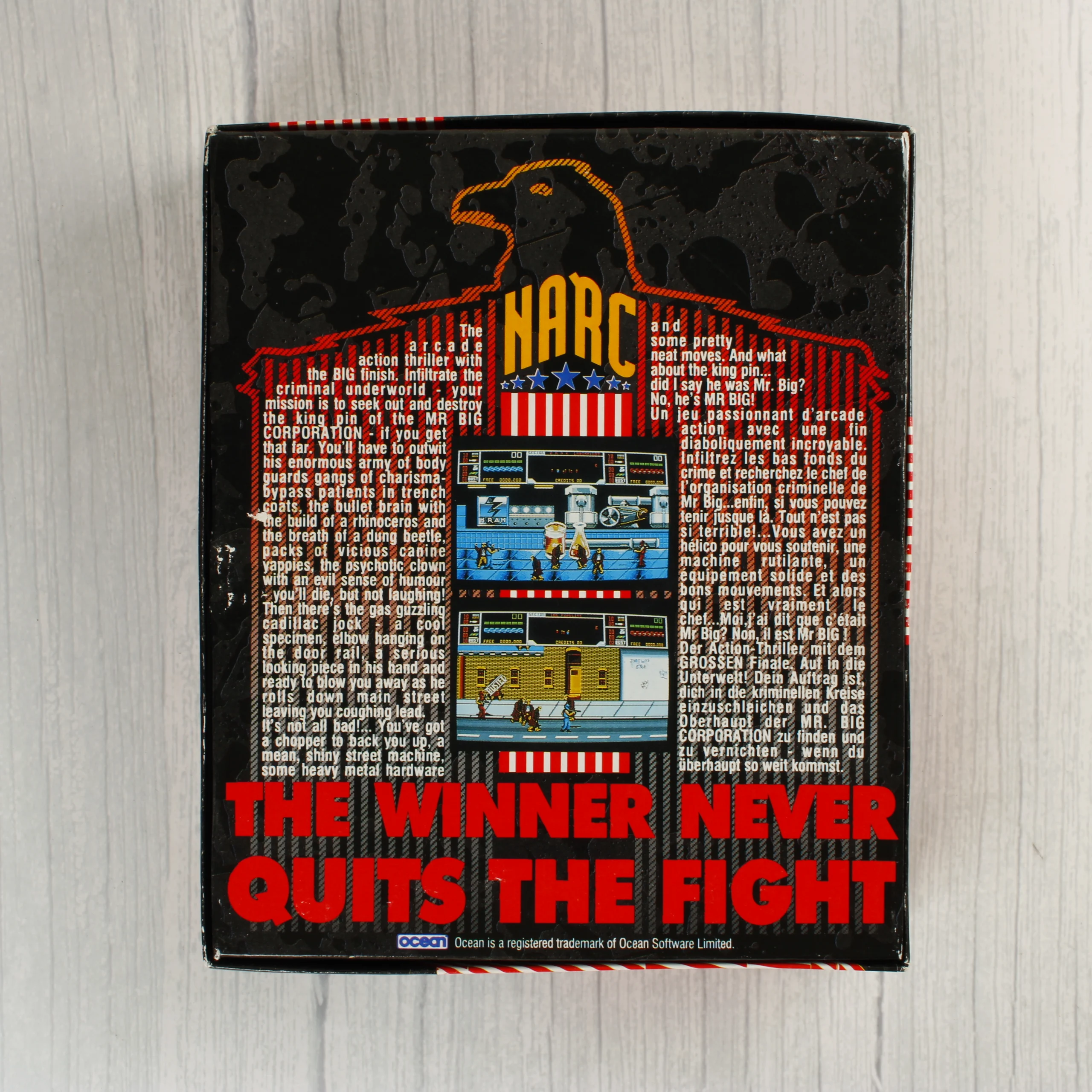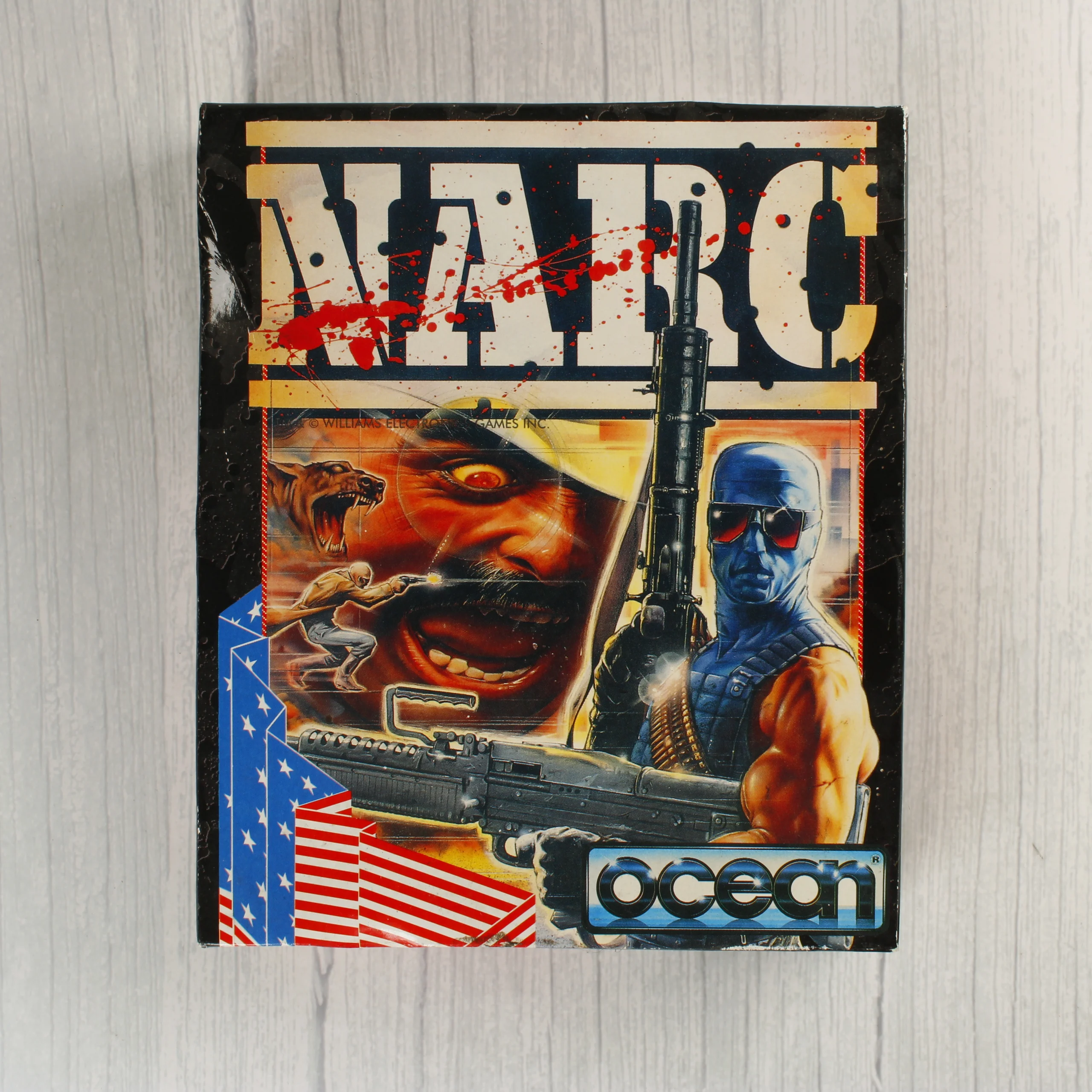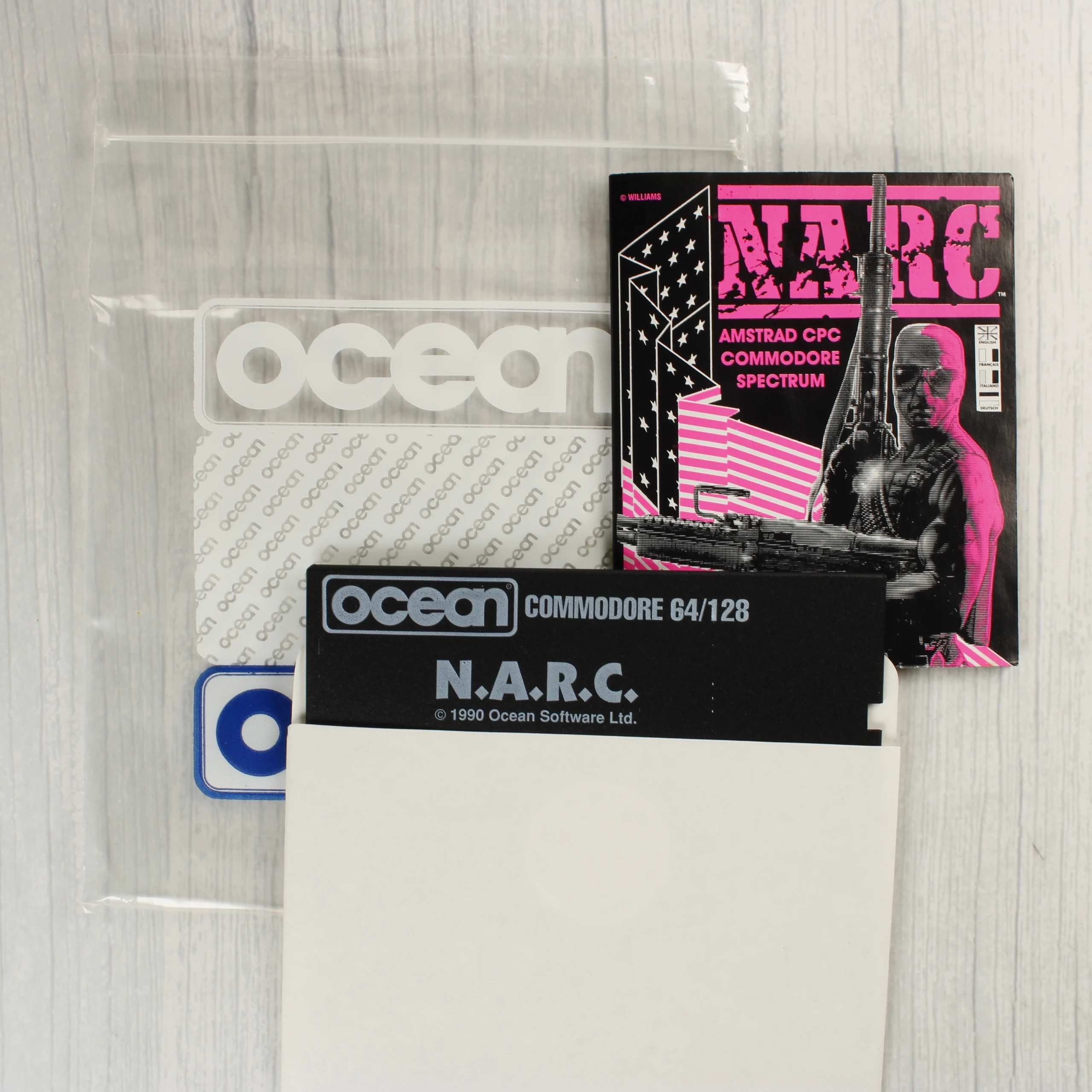 A N.A.R.C. című videójáték Commodore 64/128 platformra készült kiadása, amelyet az Ocean Software jelentetett meg. A csomag tartalmazza az eredeti kartondobozt, egy 5,25 colos floppy lemezt papírtokban, egy többnyelvű használati útmutatót és egy Ocean márkajelzéssel ellátott műanyag tasakot. A doboz elején színes, akciódús illusztráció látható fegyveres karakterekkel és az amerikai zászló motívumával. A hátoldalon angol, francia és német nyelvű leírás, valamint játékmenet-fotók találhatók. A floppy lemez fekete színű, fehér felirattal, amelyen a játék címe és az 1990-es szerzői jogi évszám szerepel.