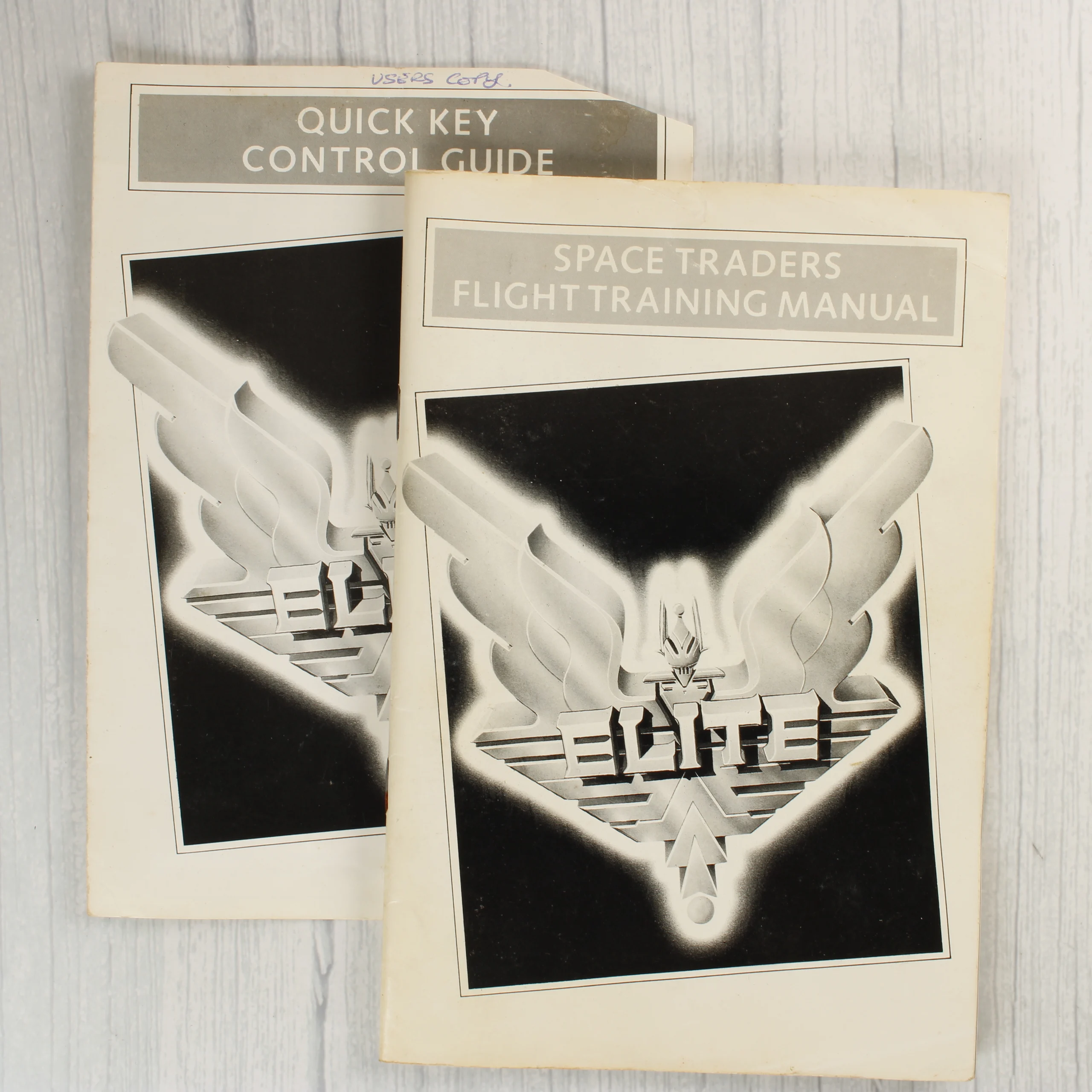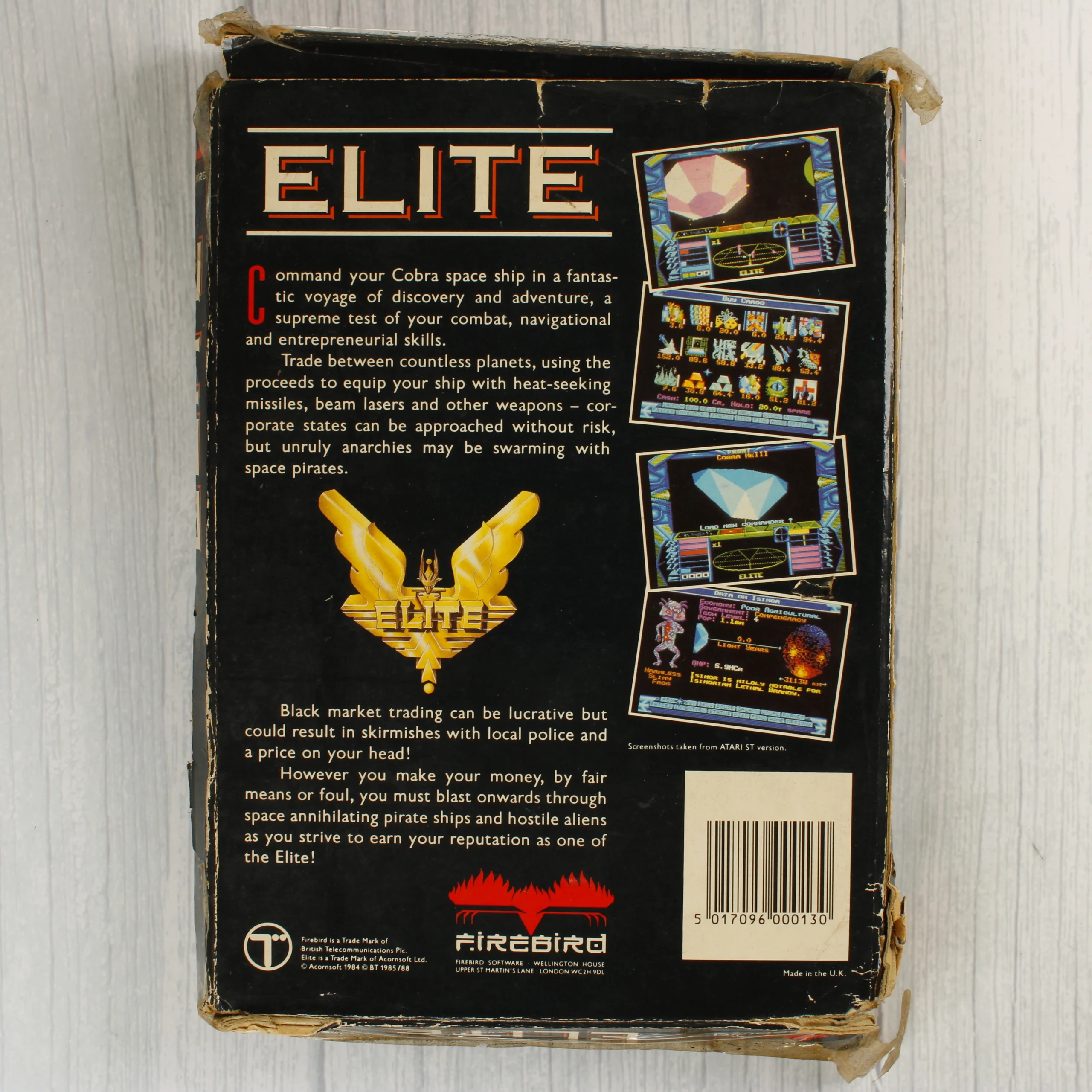 Az Elite egy klasszikus űrszimulátor és kereskedelmi videójáték Atari ST platformra, a Firebird kiadásában. A csomag tartalmazza az eredeti kartondobozt, amelyen az ikonikus arany szárnyas logó látható. A készlet része egy kék színű, 3,5 colos floppy lemez, egy fekete műanyag belső tálca, valamint két nyomtatott kézikönyv: a Space Traders Flight Training Manual és a Quick Key Control Guide. A doboz hátoldalán angol nyelvű leírás és játékmenet-pillanatképek találhatók. A termék az 1980-as évek végéről származik, az Egyesült Királyságban készült.