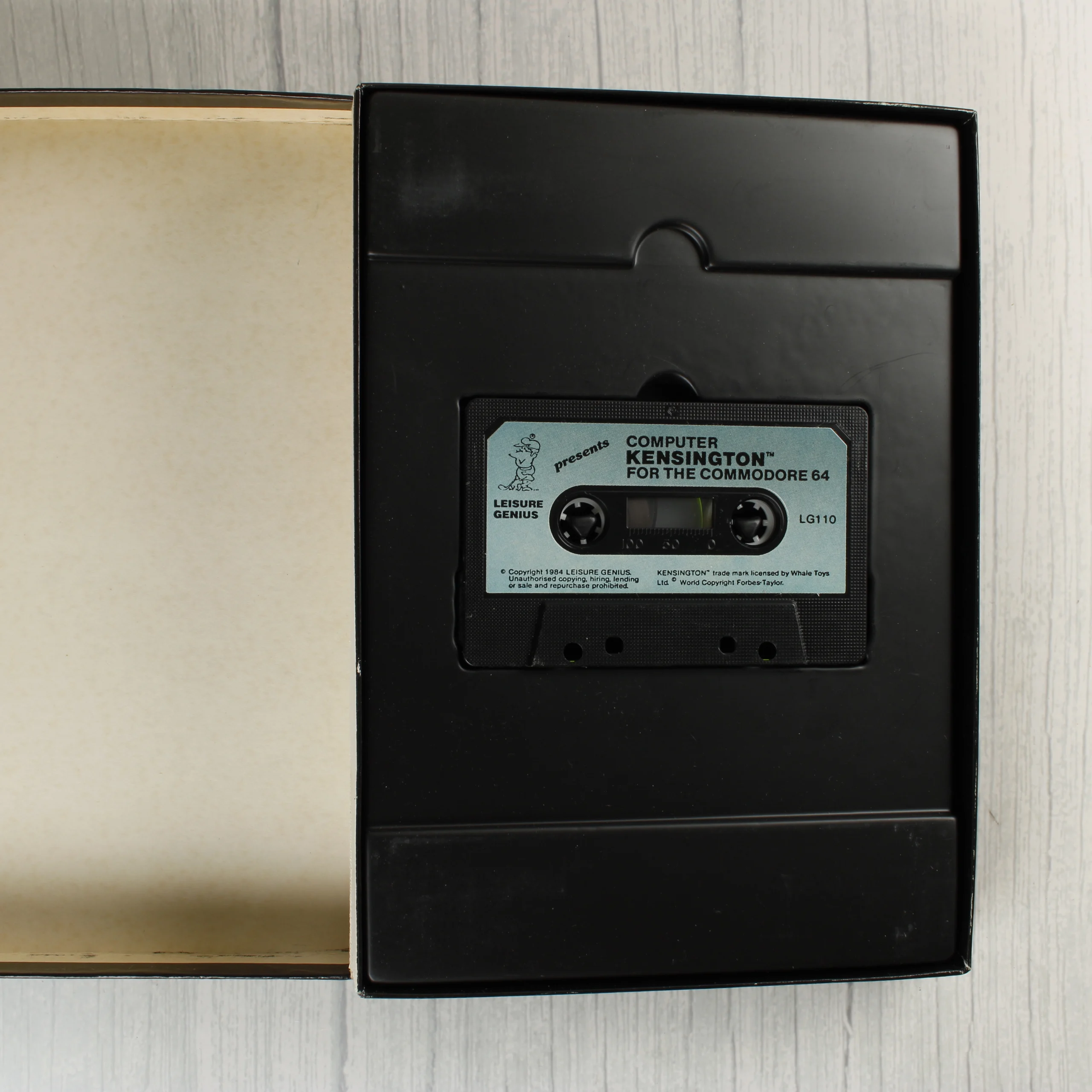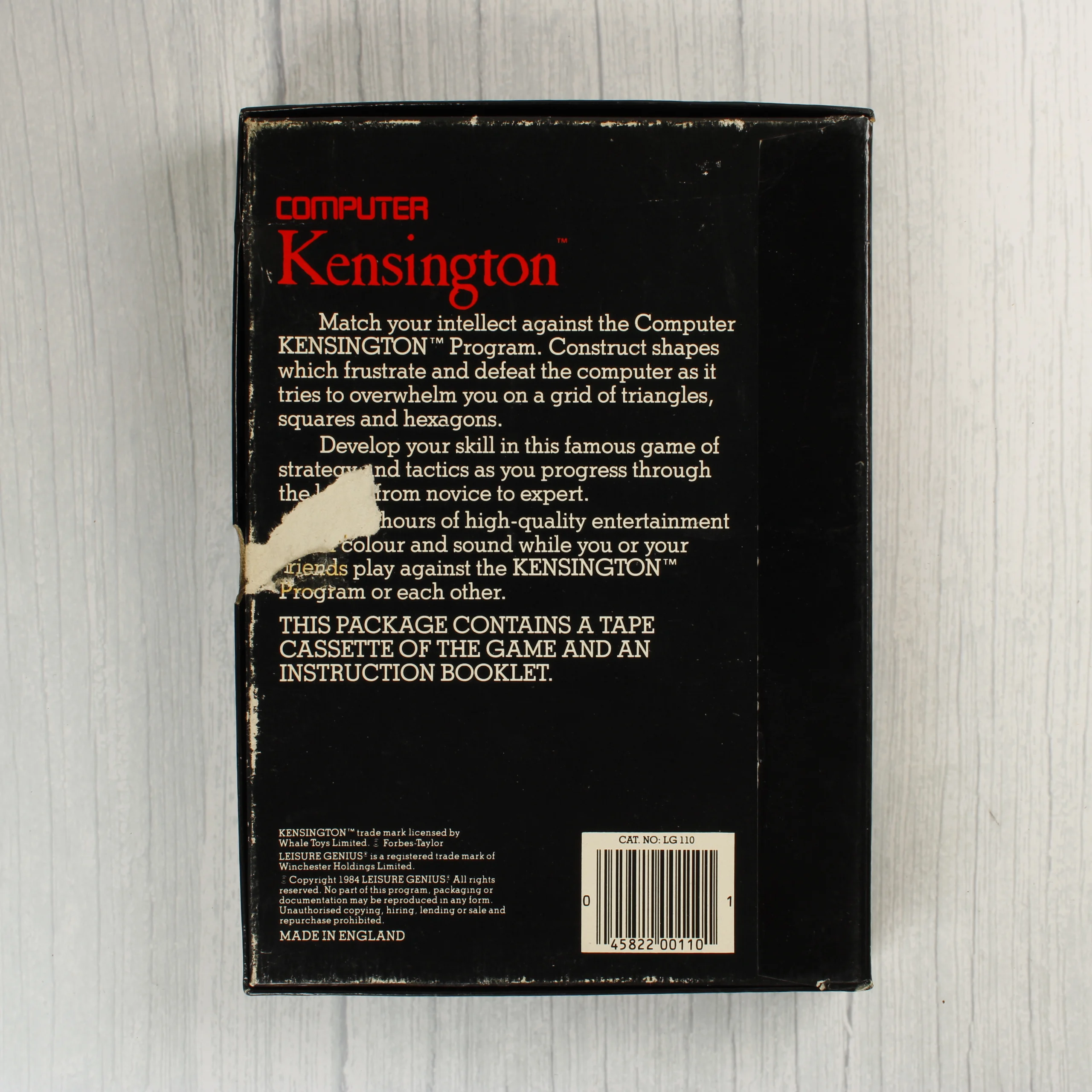 A Leisure Genius által kiadott Computer Kensington egy stratégiai videójáték Commodore 64 platformra. A csomag egy fekete kartondobozt tartalmaz, amelynek elején színes geometriai alakzatok láthatók. A doboz belsejében egy fekete műanyag tálca található, amelyben egy darab mágnesszalagos kazetta helyezkedik el. A kazetta címkéje szürke, rajta fekete feliratokkal és a kiadó logójával. A hátoldalon angol nyelvű leírás olvasható a játékmenetről, amely háromszögekből, négyzetekből és hatszögekből álló rácson alapuló alakzatépítésre fókuszál. A csomagoláson látható a gyártás helye, amely Anglia, valamint az 1984-es szerzői jogi évszám.