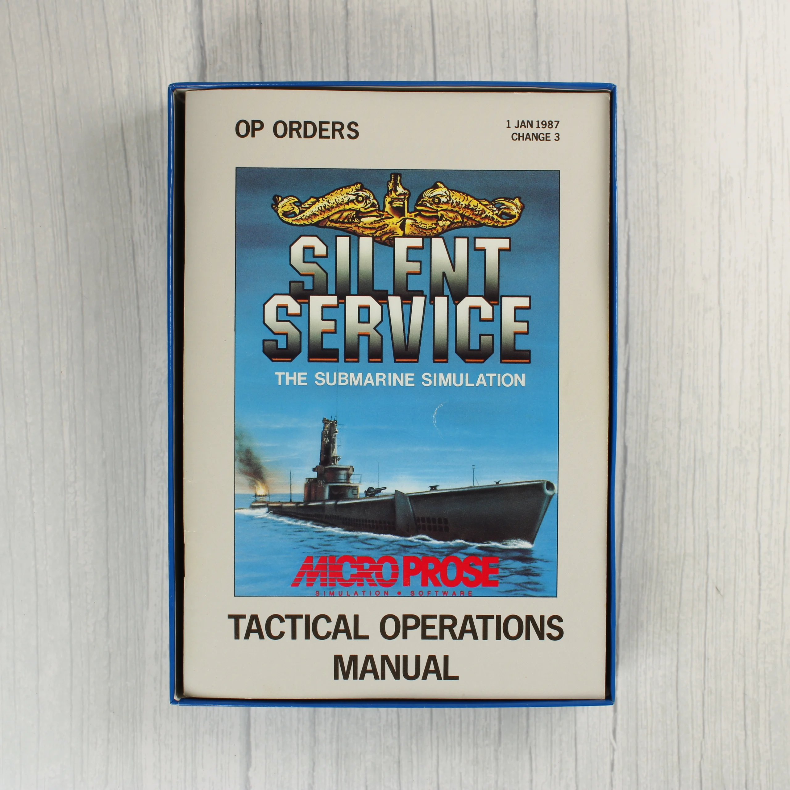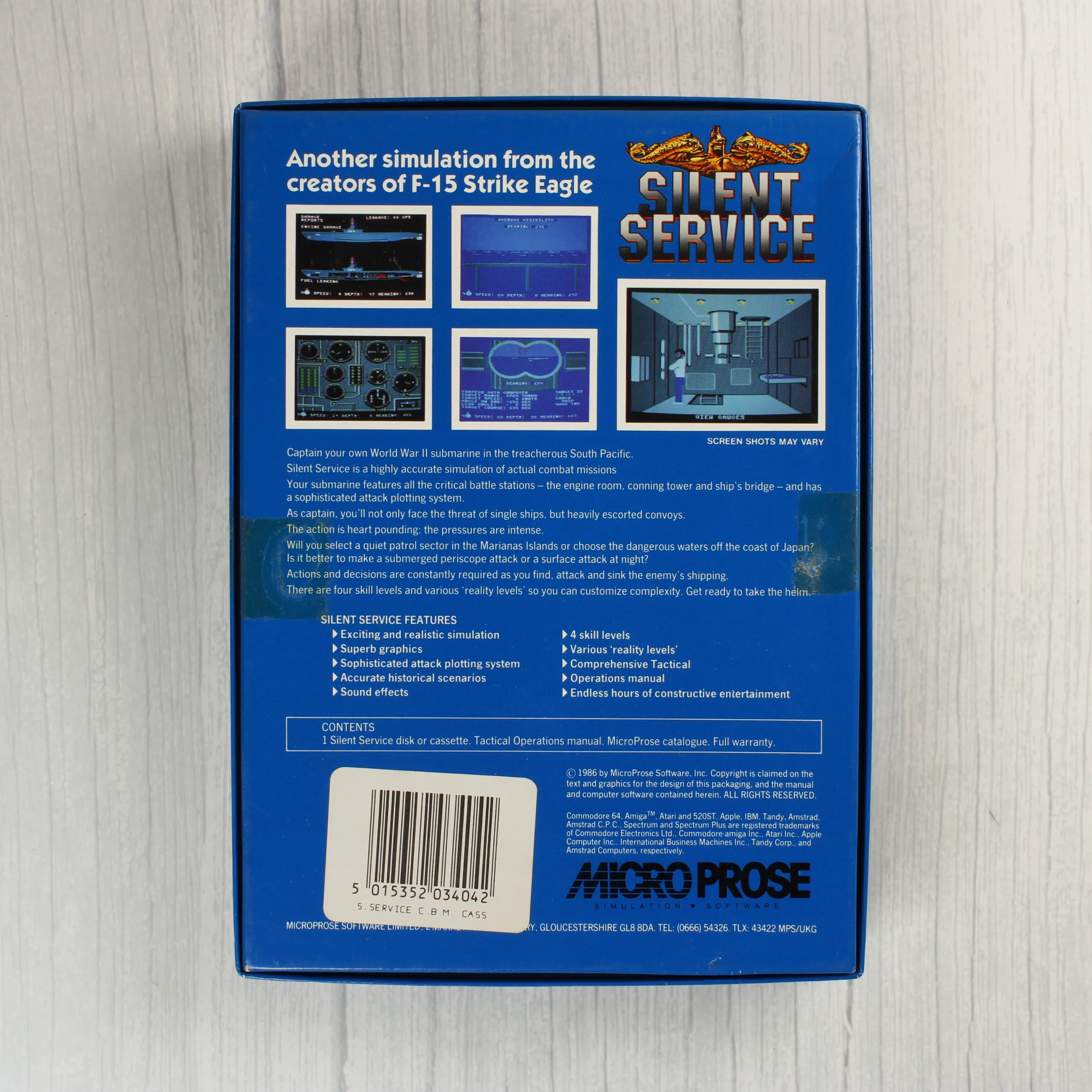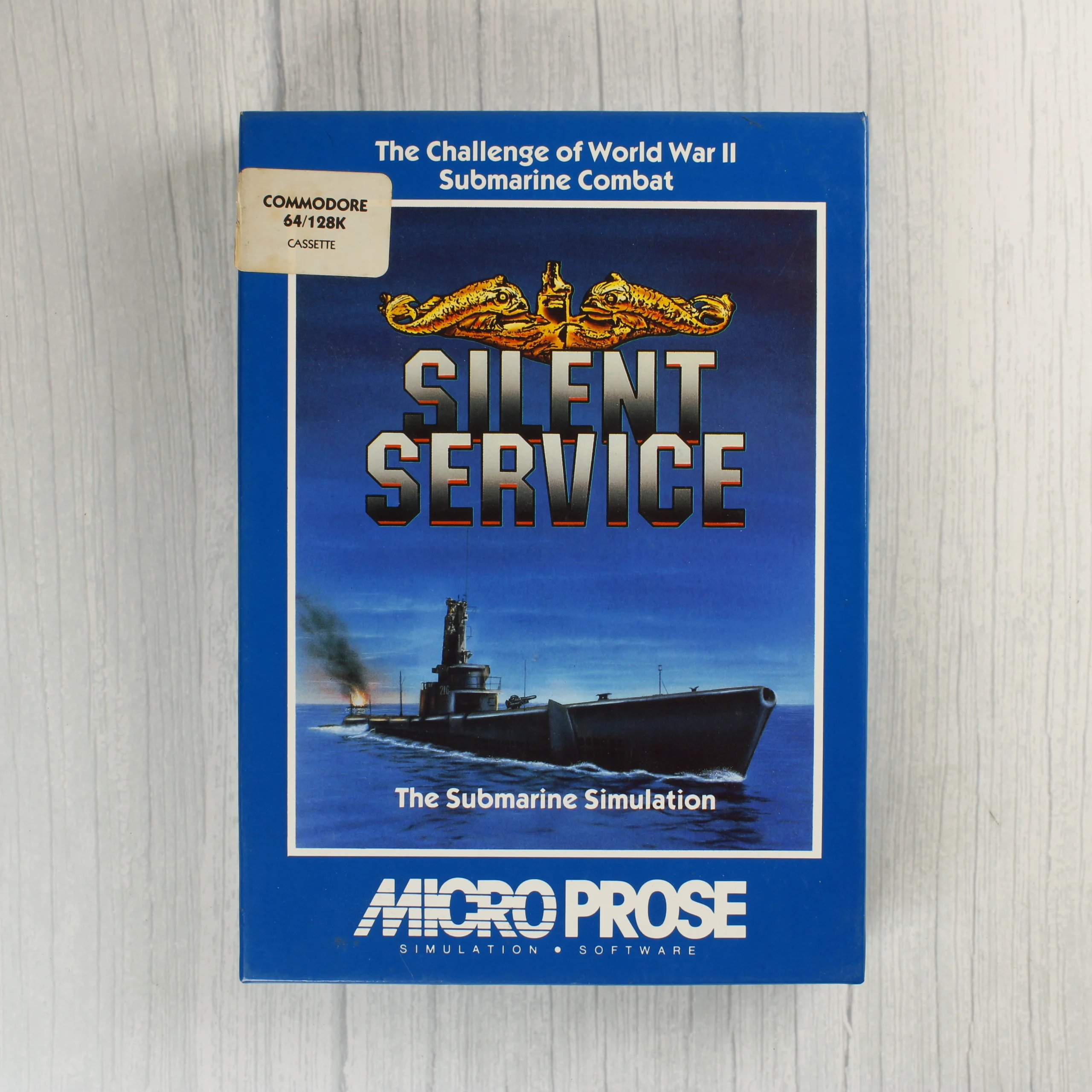 A Silent Service egy tengeralattjáró-szimulációs videójáték Commodore 64/128 rendszerekhez. A termék egy kék színű, kartonból készült dobozban található, amelynek elején egy tengeralattjárót ábrázoló illusztráció és a MicroProse logója látható. A csomag tartalmazza az eredeti fekete színű mágnesszalagos kazettát, amely egy fekete műanyag tálcában helyezkedik el. Mellékelve van továbbá egy nyomtatott, angol nyelvű taktikai kézikönyv is. A doboz hátoldalán játékmenet-képek és részletes leírás olvasható a funkciókról. A csomagoláson látható egy fehér matrica a platform megjelölésével, valamint egy vonalkódos matrica a hátoldalon. A doboz élei mentén enyhe kopás és használati nyomok fedezhetők fel, de a készlet hiánytalannak tűnik.