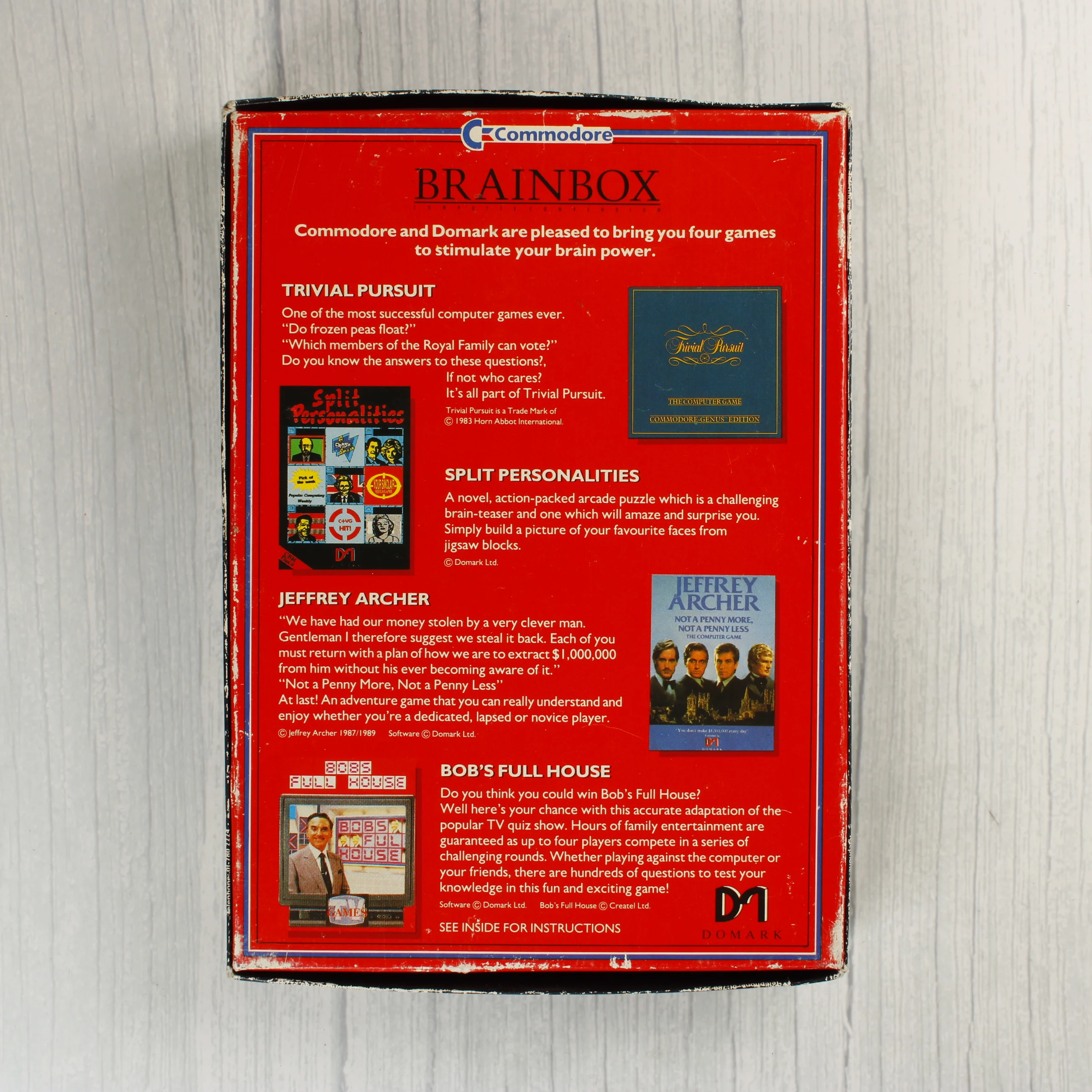 A Brainbox Computer Compendium egy videójáték-válogatás Commodore 64/128 platformra, amelyet a Domark adott ki. A csomag négy különböző játékot tartalmaz: Trivial Pursuit, Split Personalities, Not a Penny More, Not a Penny Less és Bob's Full House. A termék egy nagyméretű kartondobozban érkezik, amelynek elején egy villámokkal kísért agyfelhő látható egy hegyvidéki táj felett. A doboz hátoldala piros alapszínű, és részletes leírást, valamint képernyőképeket tartalmaz a mellékelt játékokról. A csomag tartalma egy fekete színű magnókazetta, amelyen a Not a Penny More, Not a Penny Less játék található, valamint különböző nyomtatott dokumentációk, köztük egy kék színű Your Passport to Capcom füzet. A doboz élei mentén látható kopások és fehér foltok jelzik a használatot és az idő múlását.