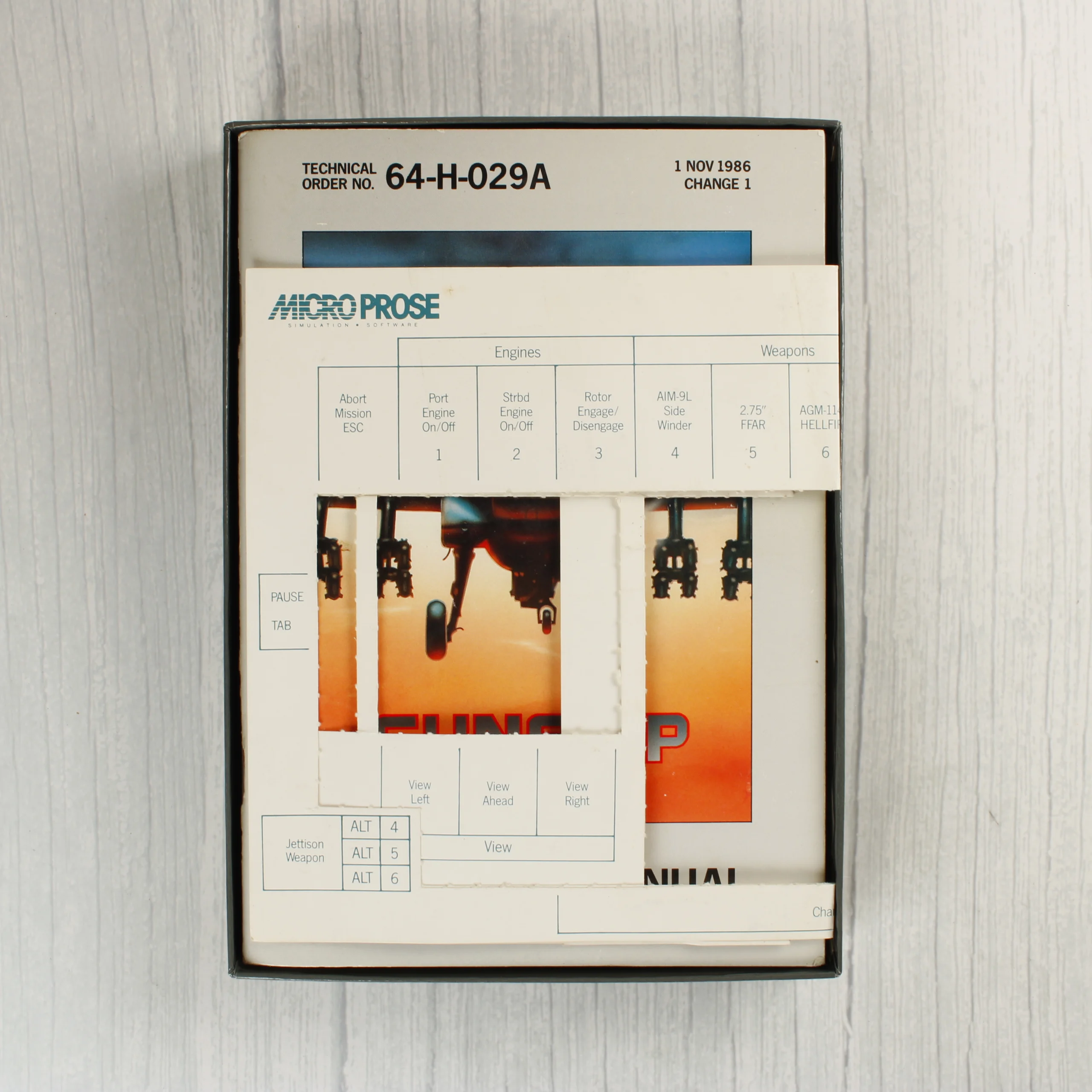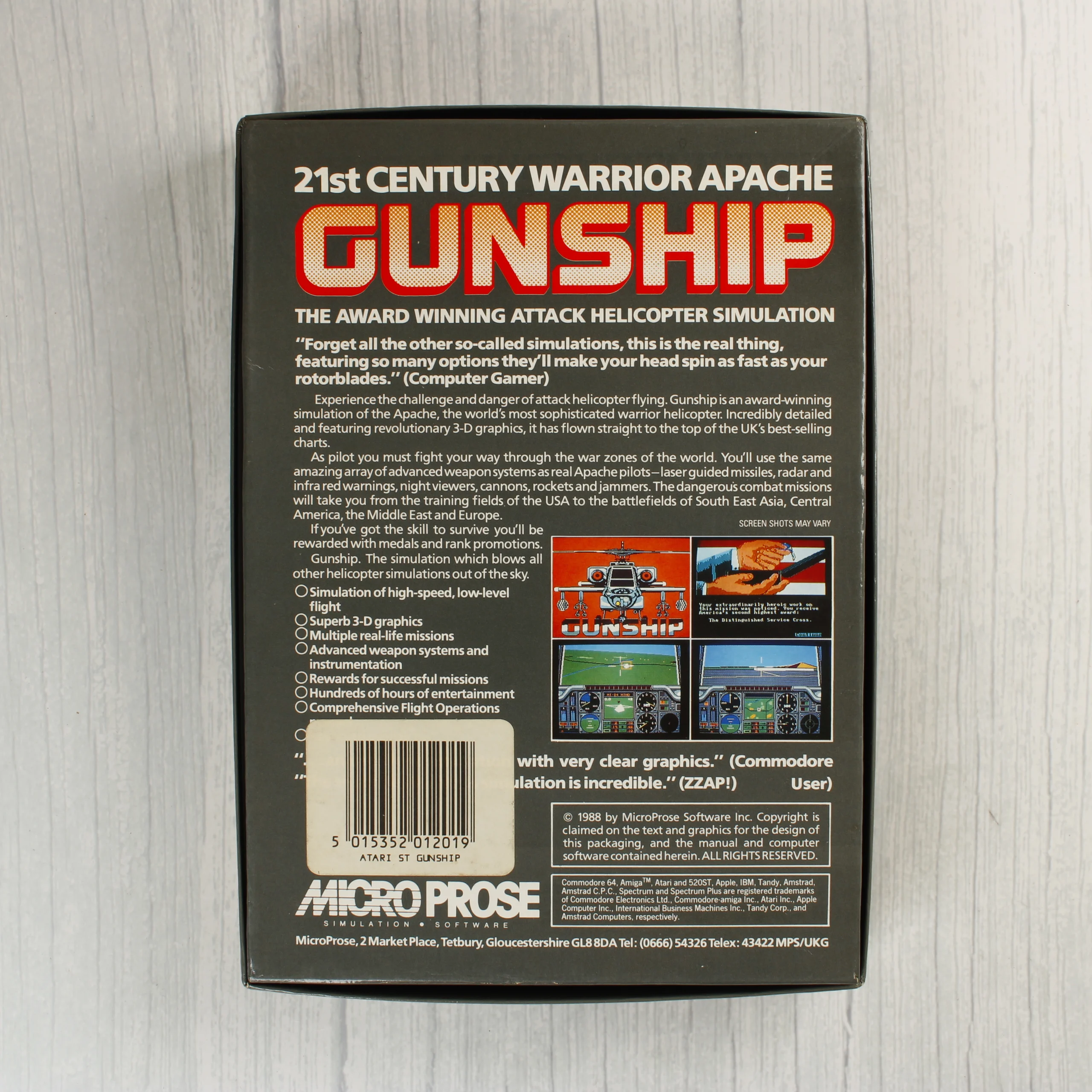 A MicroProse által kiadott Gunship videójáték Atari ST platformra készült kiadása. A csomag tartalmazza az eredeti kartondobozt, amelyen egy AH-64 Apache harci helikopter látható bevetés közben. A doboz belsejében megtalálható a részletes, angol nyelvű műveleti kézikönyv (Operations Manual), egy billentyűzetkiosztást segítő sablon, valamint egy kék színű, 3,5 colos floppy lemez. A szoftver egy díjnyertes helikopter-szimulátor, amely 3D-s grafikát és összetett fegyverrendszereket kínál. A csomagoláson látható az Atari ST jelzés és a MicroProse logója. A termék korának megfelelő, megkímélt állapotban van, a papíralapú kiegészítők épek.