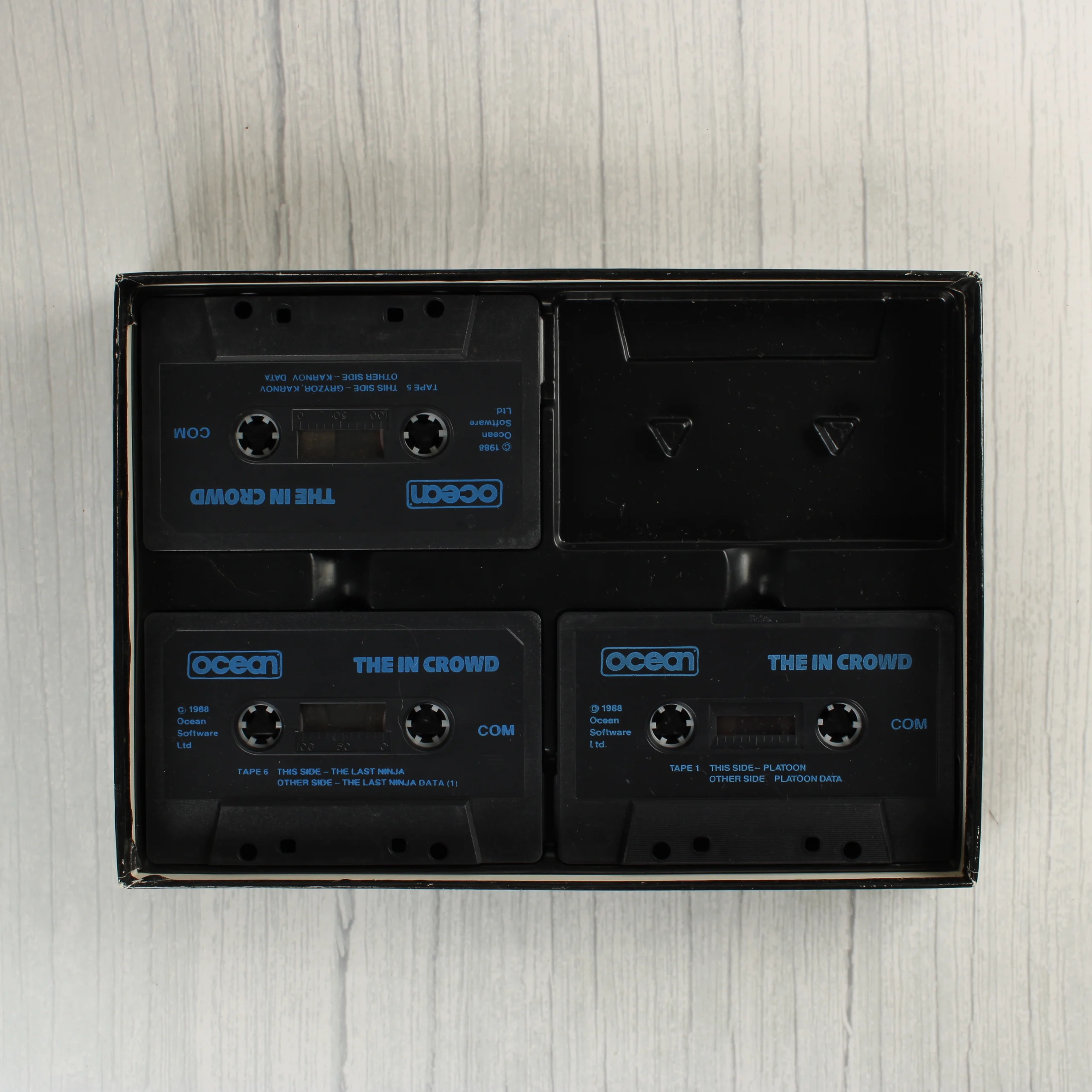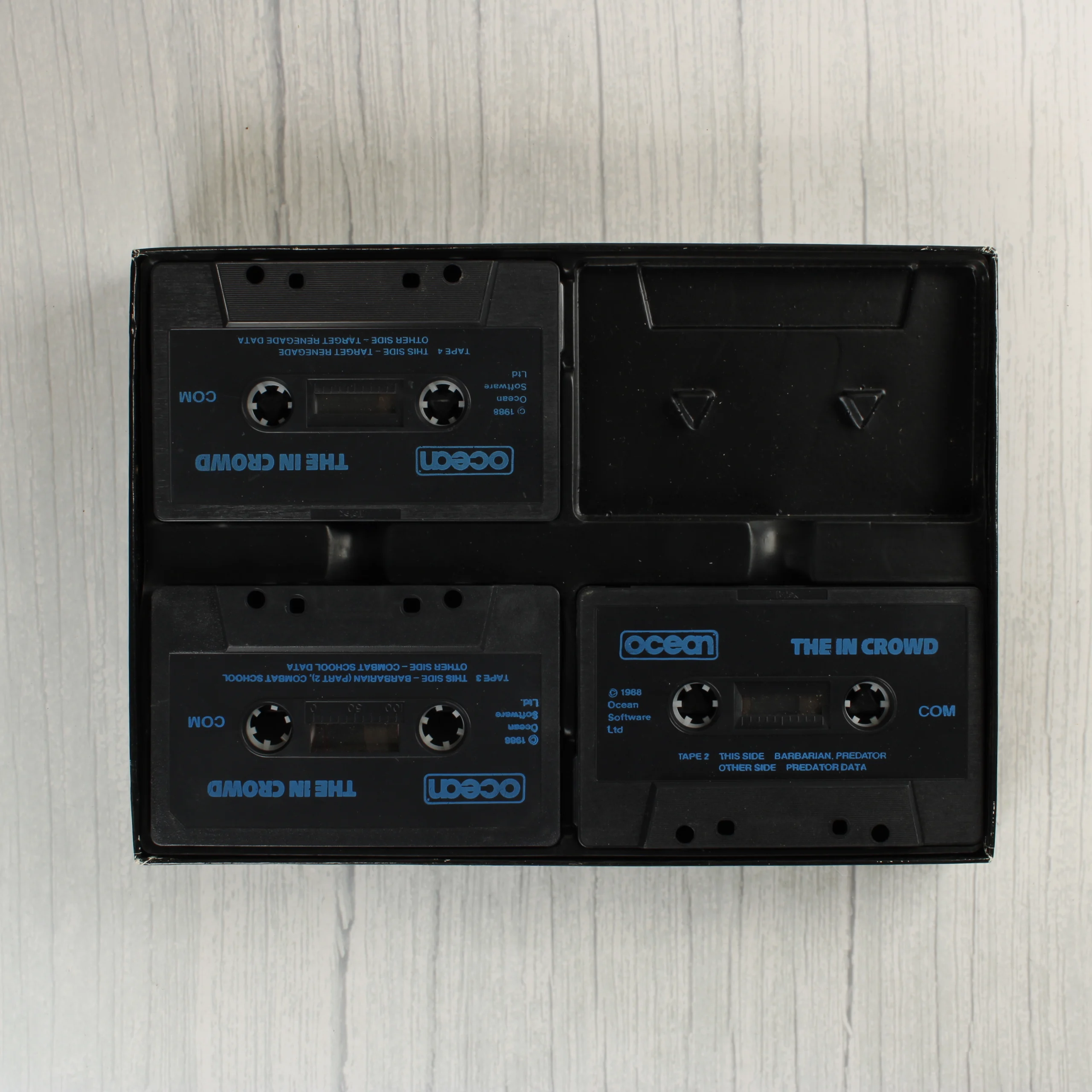 Az Ocean Software által kiadott The In Crowd egy videójáték-válogatás Commodore 64 platformra. A fekete kartondobozos kiadás nyolc népszerű címet tartalmaz, köztük a Gryzor, Barbarian, The Last Ninja, Predator, Karnov, Combat School, Target Renegade és Platoon játékokat. A csomagolás elején a játékok borítóképei láthatók, valamint egy piros-fehér kör alakú matrica, amely a hat kazettát tartalmazó speciális kiszerelést jelzi. A doboz belsejében egy fekete műanyag tálca található, amelyben a fekete színű, kék feliratos kazetták helyezkednek el. A hátoldalon a játékokból vett képernyőmentések és rövid angol nyelvű leírások olvashatók. A termék korának megfelelő állapotban van, a doboz élein és sarkain kisebb kopások láthatók.