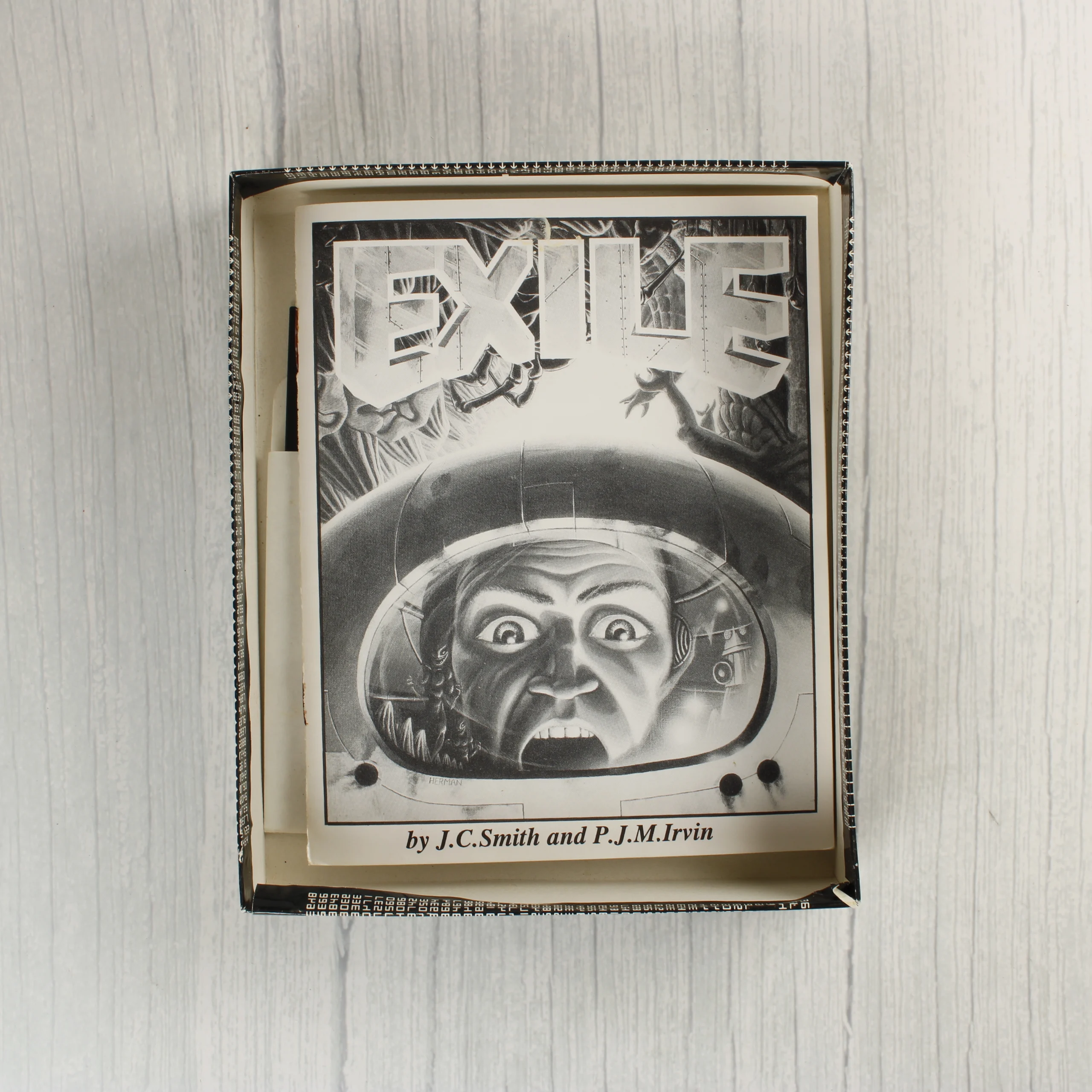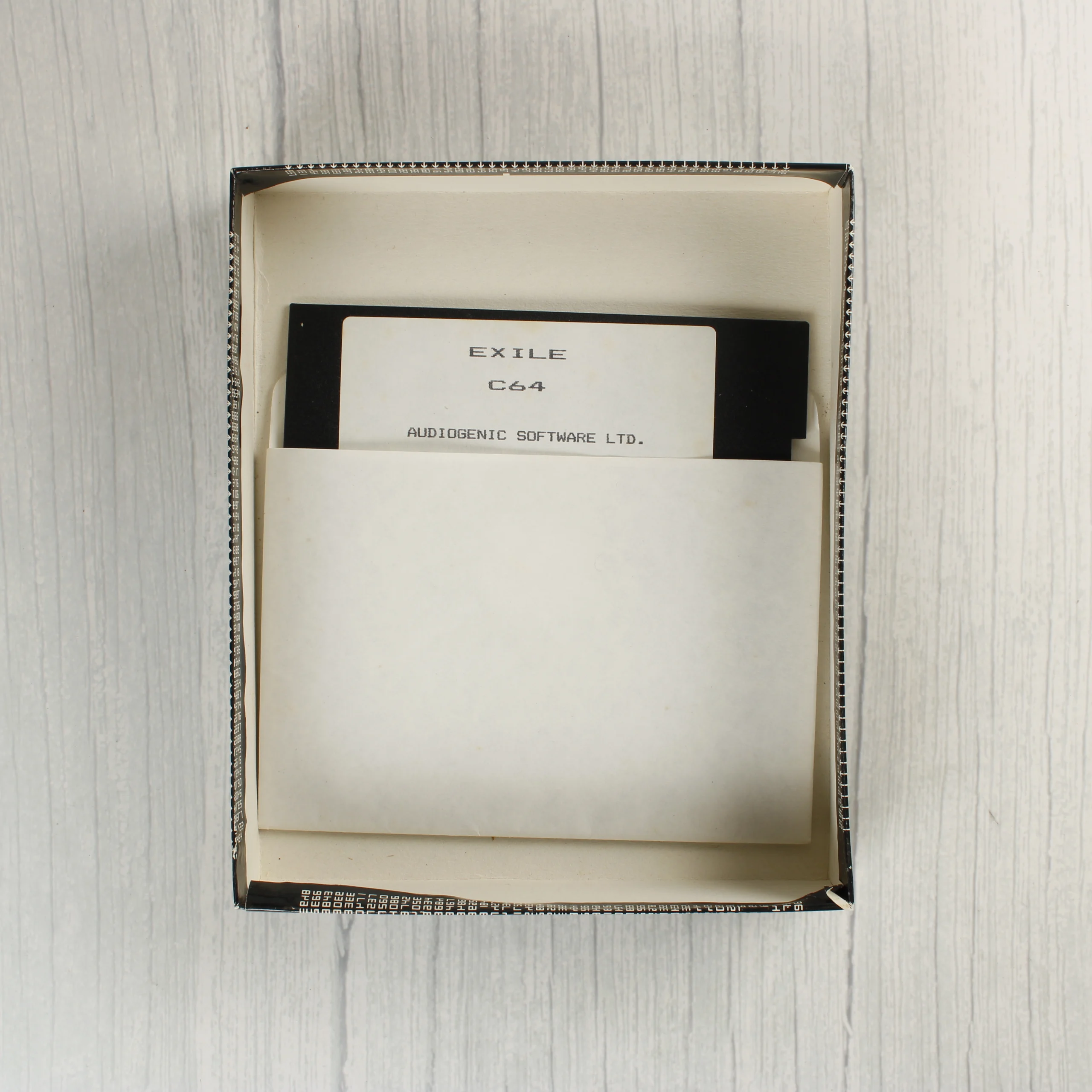 Az Exile egy klasszikus videójáték Commodore 64 platformra, amely eredeti kartondobozos kiadásban látható. A csomag tartalmazza a fekete színű 5,25 colos floppy lemezt fehér papírtokban, valamint a fekete-fehér illusztrációval ellátott használati útmutatót. A doboz előlapján egy drámai sci-fi grafika látható, amely egy űrhajós arcát ábrázolja sisakban, felette a fémes hatású Exile felirattal. A hátoldalon angol nyelvű leírás, játékmenet-jellemzők és képernyőmentések találhatók. A doboz sarkain és élein kisebb kopások és használati nyomok láthatók, de a szerkezete ép. A floppy lemez címkéje tiszta, a feliratok jól olvashatóak. A belső papírtok enyhén sárgult az idő múlásával.