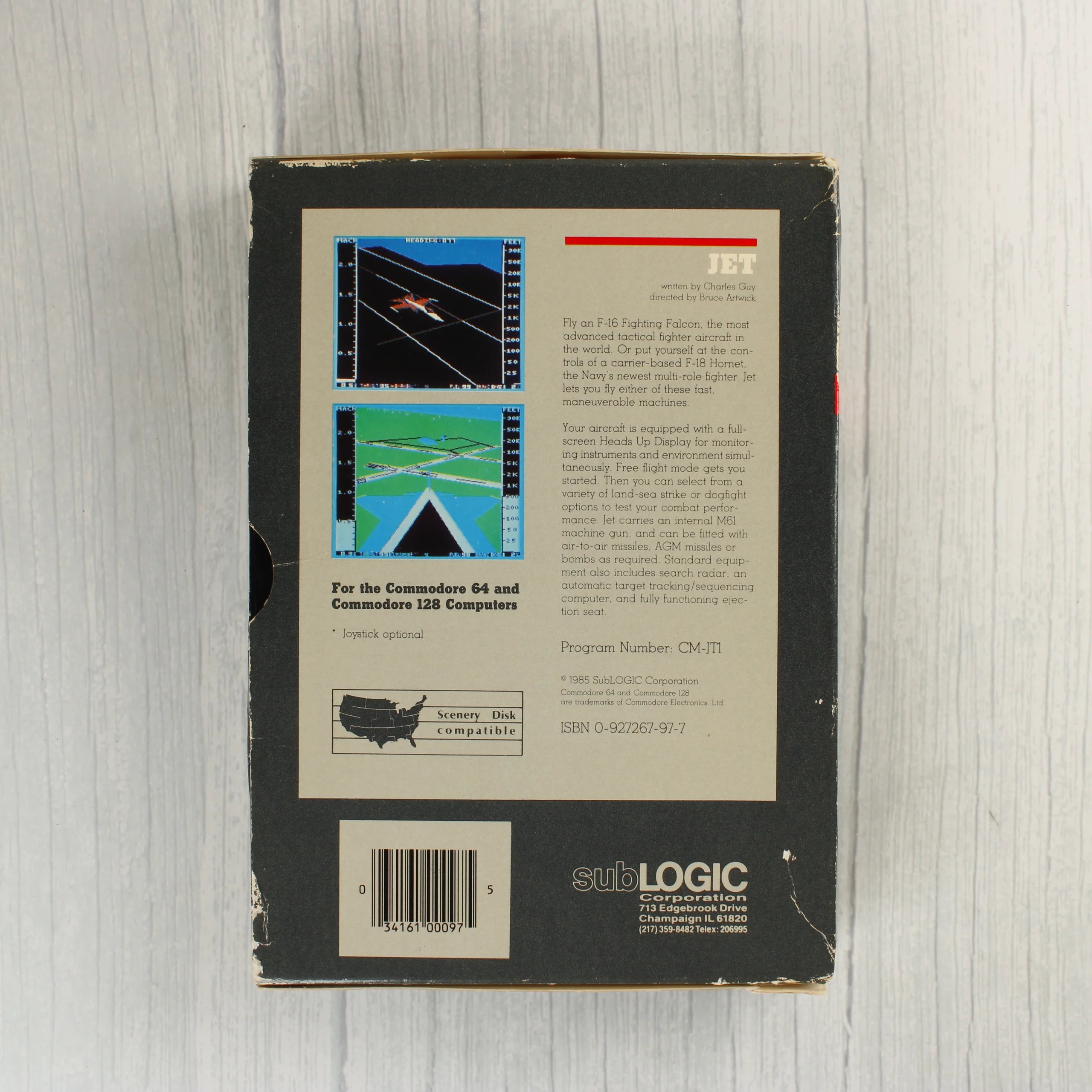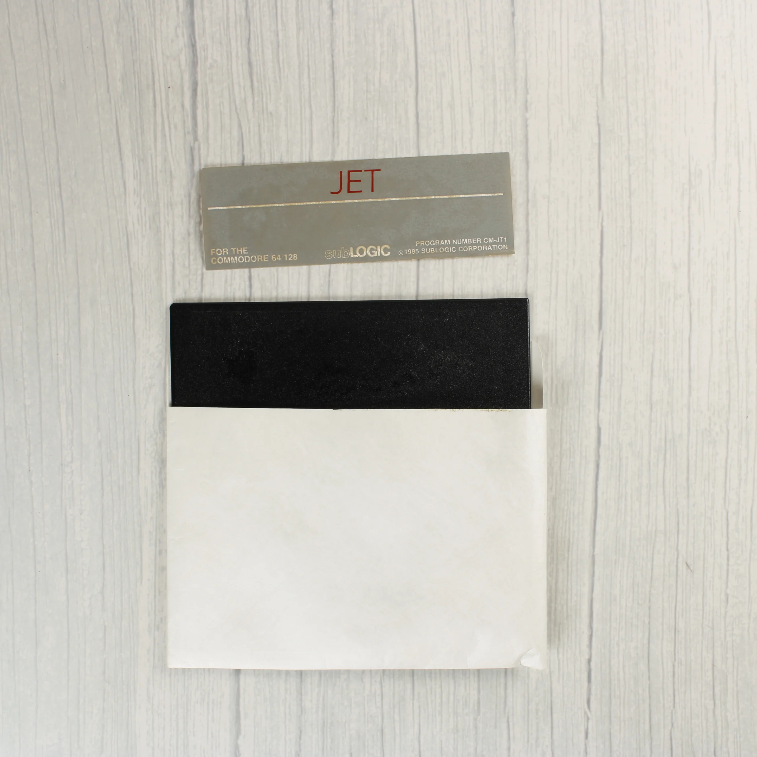 A SubLOGIC által kiadott JET egy repülőgép-szimulátor videójáték Commodore 64 és Commodore 128 számítógépekre. A csomag tartalmazza az eredeti fekete kartondobozt, amelyen egy vadászgép sziluettje és egy pilótafülke-nézet látható. A készlet része egy fekete borítójú használati útmutató, valamint egy 5,25 colos floppy lemez fehér papírtokban, a hozzá tartozó szürke címkével. A doboz hátoldalán játékmenet-fotók és angol nyelvű leírás olvasható a szimulátor funkcióiról, például az F-16 Fighting Falcon és F-18 Hornet típusok irányításáról. A termék az 1980-as évek közepéről származik, amit a dobozon látható 1985-ös szerzői jogi jelzés is megerősít.