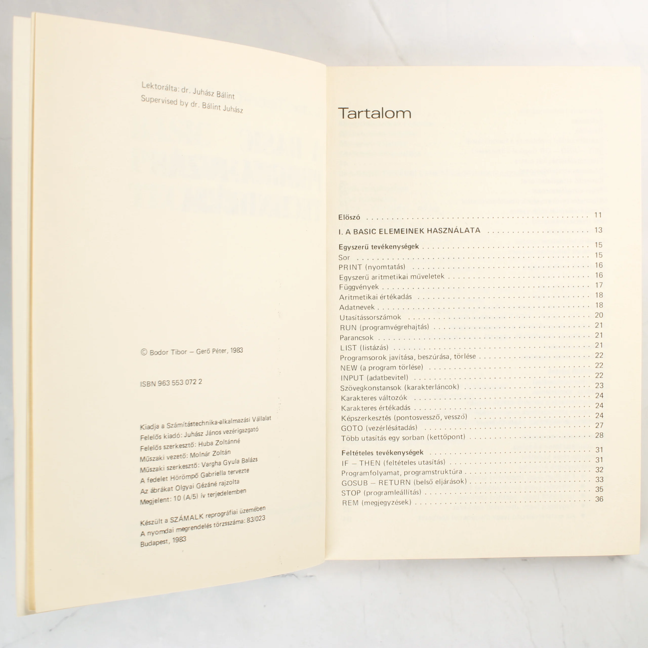 Bodor Tibor és Gerő Péter A BASIC programozás technikája című szakkönyve. A puhafedeles kiadvány borítója kék és fehér színekben pompázik, rajta a cím és a szerzők nevei jól olvashatóak. A belső oldalakon a tartalomjegyzék és a kiadói adatok láthatóak, amelyek szerint a mű 1983-ban jelent meg a Számítástechnika-alkalmazási Vállalat gondozásában. A könyv papírja az idő múlásával enyhén sárgult, de a szöveg tiszta és jól olvasható. A borító élei és sarkai minimális kopást mutatnak, ami a korának megfelelő állapotot tükrözi. A kötés épnek tűnik, nincsenek látható szakadások vagy firkálások a bemutatott oldalakon.