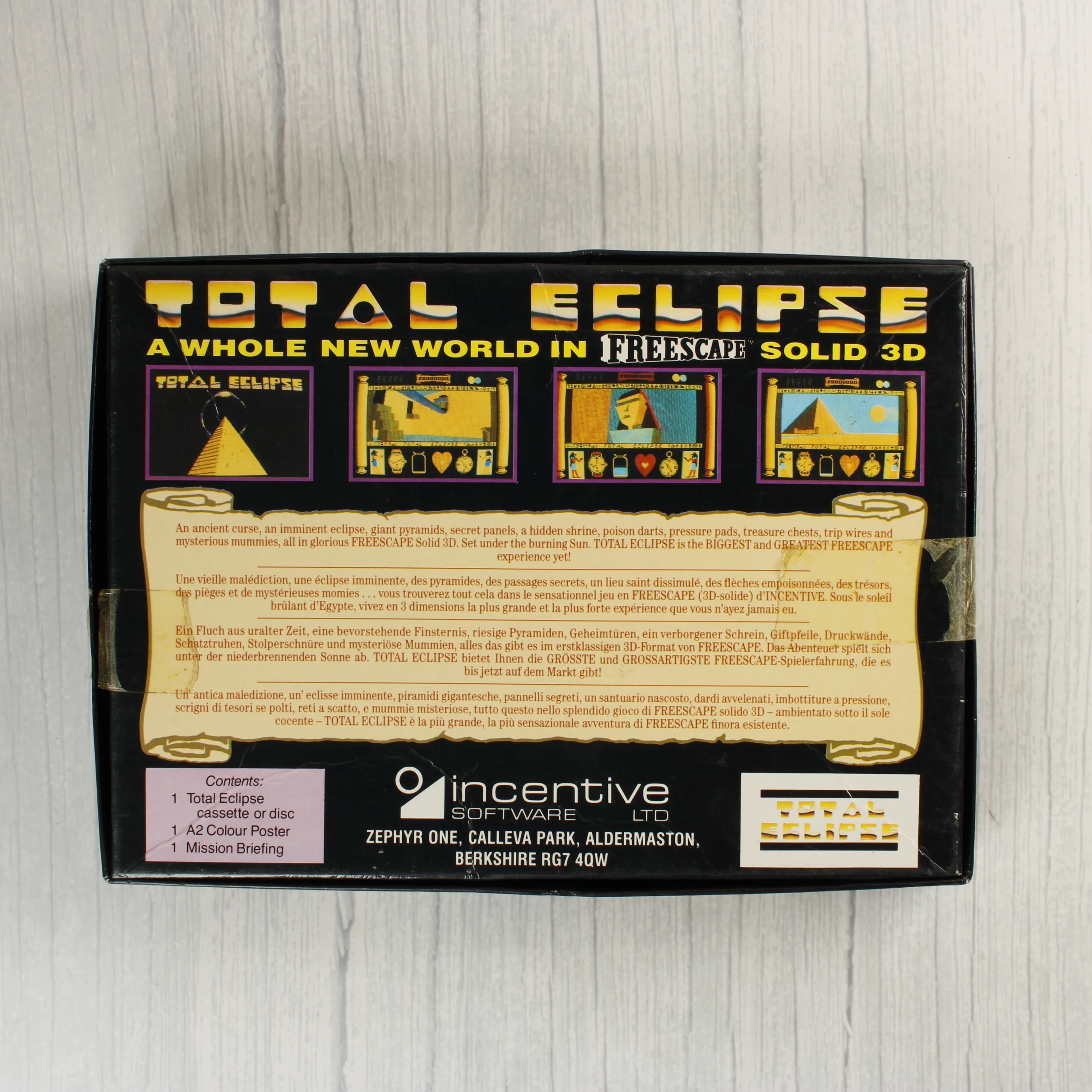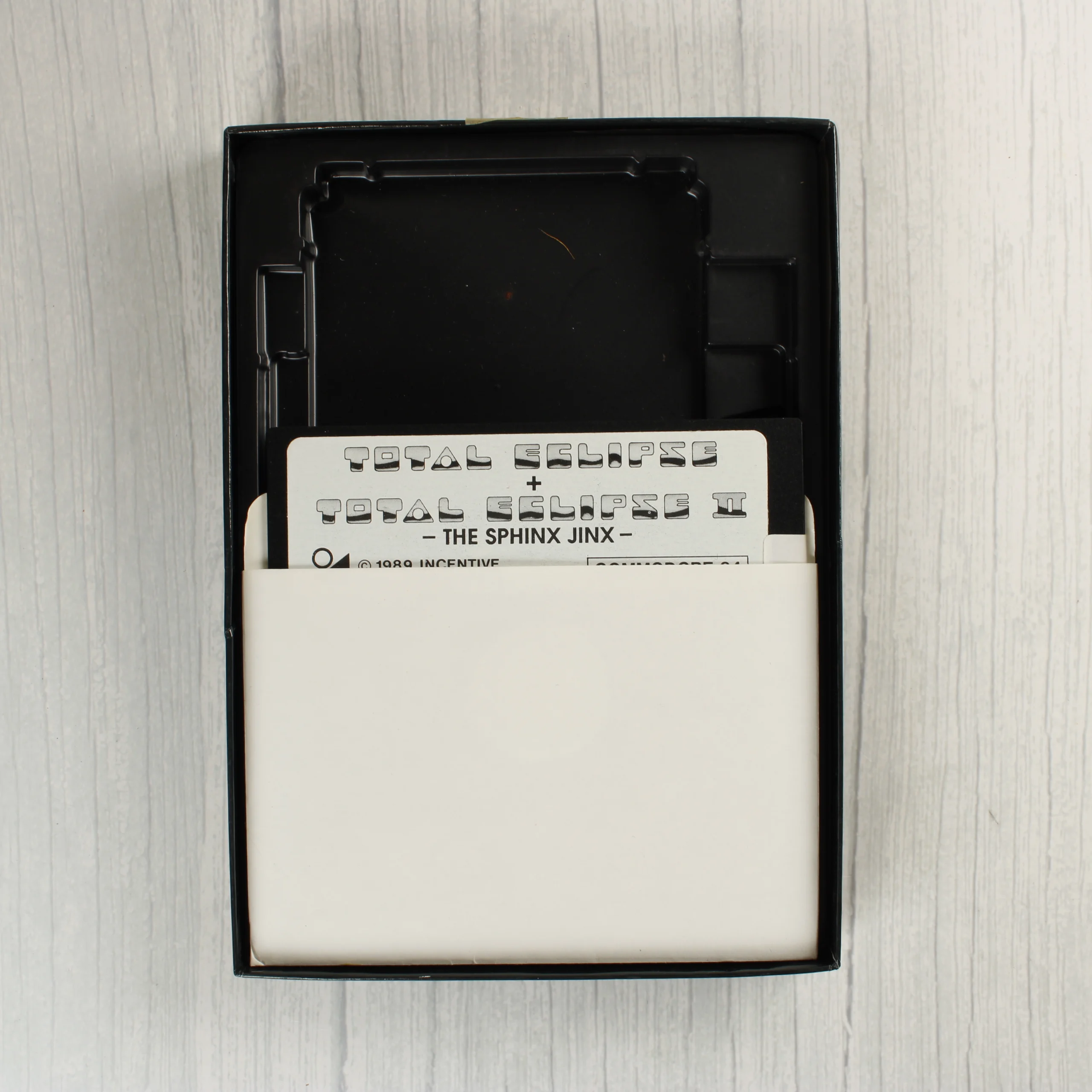A Total Eclipse és Total Eclipse II videójátékokat tartalmazó gyűjtemény Commodore 64 platformra. A csomag egy fekete kartondobozban érkezik, amelynek elején egy piramis és egy napfogyatkozás látható. A dobozon sárga 'Special Edition' és 'Special Price' matricák találhatók. A készlet tartalmaz egy 5,25 colos floppy lemezt fehér papírtokban, valamint egy összehajtogatott színes posztert. A doboz hátoldalán többnyelvű leírás és játékmenet-képek láthatóak. A belső műanyag tálca fekete színű és ép. A doboz élein és sarkain enyhe kopás és használati nyomok fedezhetők fel, a ragasztószalag maradványai látszanak az oldalakon.