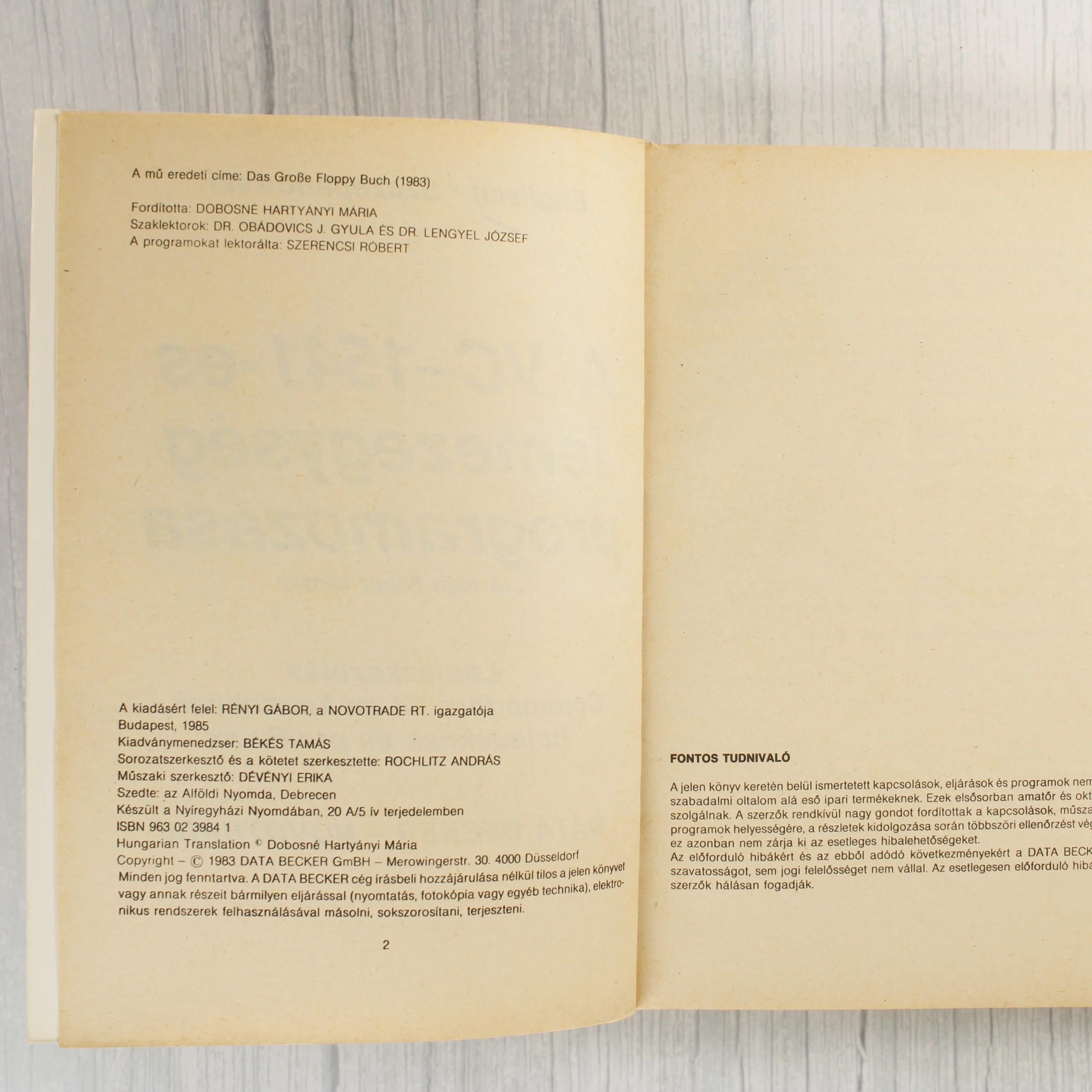 A VC-1541-es lemezegység programozása (A nagy floppy könyv) című szakkönyv magyar nyelvű kiadása. A puhafedeles kötet borítója fehér alapszínű, piros kerettel és feliratokkal. A Data Becker és a Novotrade gondozásában megjelent mű a Commodore 64 számítógép lemezkezelésével foglalkozik. A borítón a szerzők, Englisch és Szczepanowski nevei láthatók. A belső oldalon a kiadási adatok, az 1985-ös évszám és az ISBN azonosító is olvasható. A könyv állapota használt, a borító szélein és sarkain kopásnyomok, valamint apróbb elszíneződések észlelhetők, de a kötés épnek tűnik.