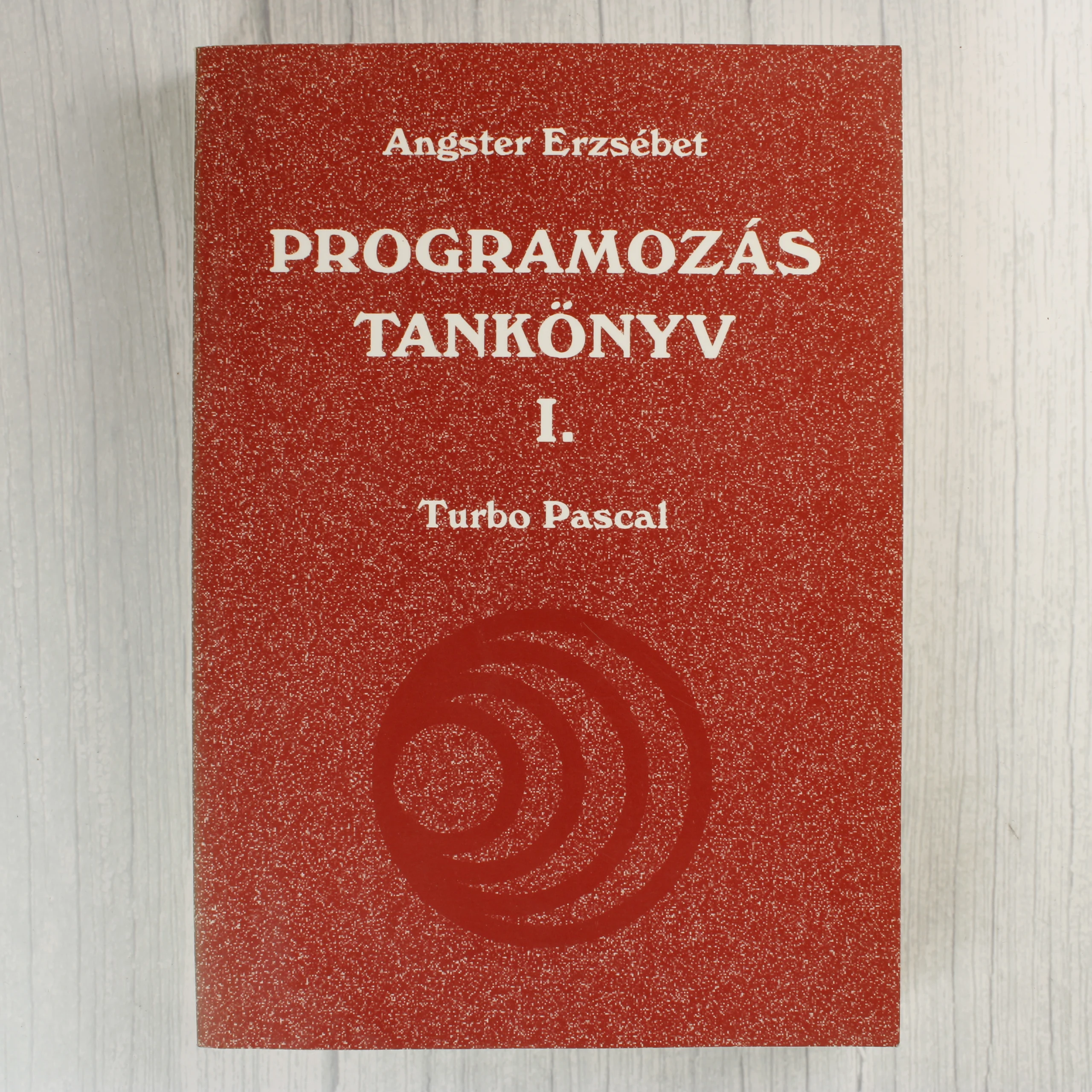 Angster Erzsébet Programozás Tankönyv I. kötete, amely a Turbo Pascal programozási nyelv alapjaival foglalkozik. A könyv puhafedeles kötésben készült, borítója vörös színű, fehér feliratokkal és egy körkörös grafikai elemmel az alsó harmadban. A belső oldalak fekete-fehér nyomásúak, folyamatábrákat, forráskód-példákat és magyarázó szövegeket tartalmaznak. A papír enyhén sárgult, ami a korából adódik, de a szöveg tisztán olvasható. A borító élei és sarkai minimális kopást mutatnak, szerkezetileg ép állapotban van.