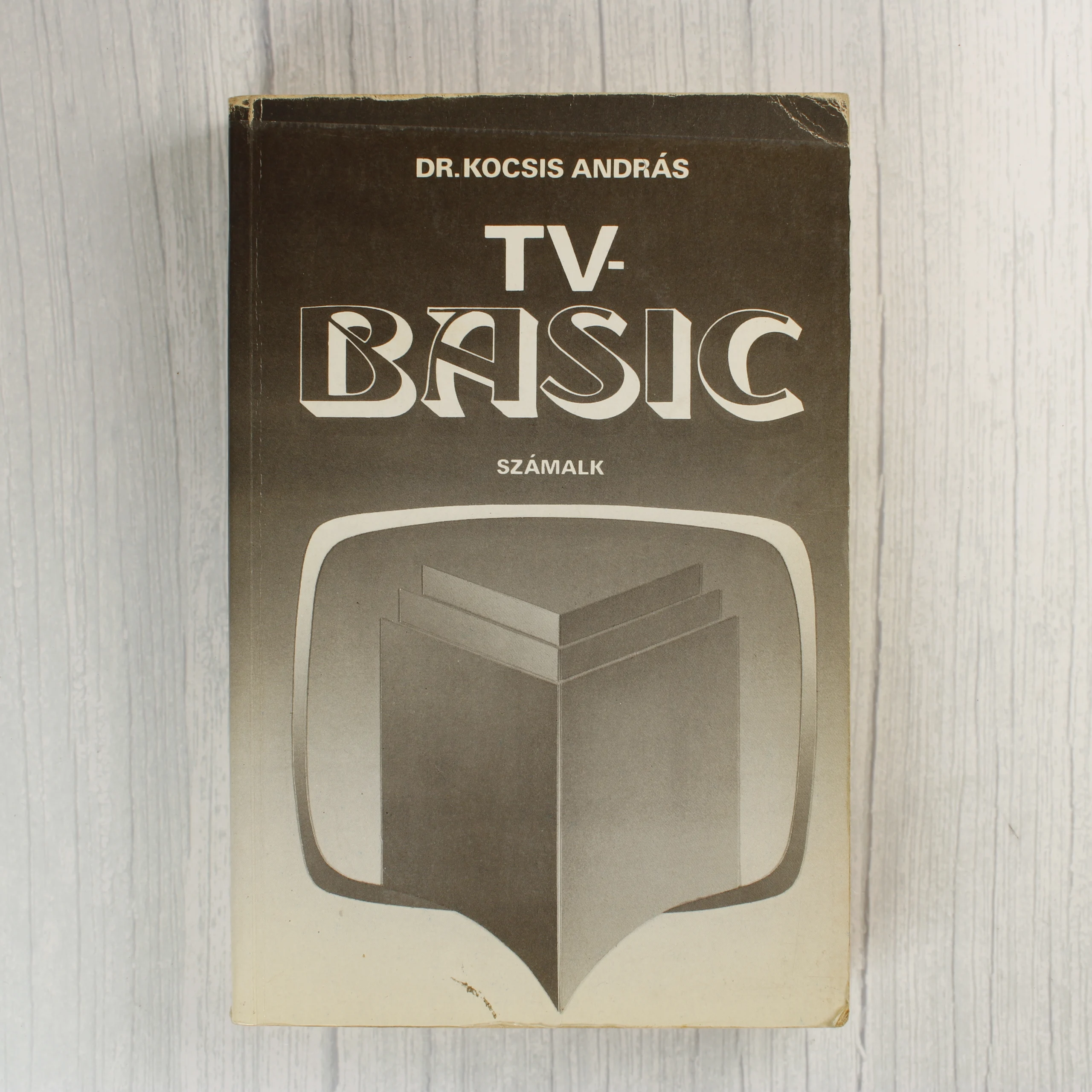 Dr. Kocsis András TV-BASIC című szakkönyve a Számalk gondozásában jelent meg. A puhafedeles kötet borítója sötétbarna és krémszínű átmenettel rendelkezik, rajta egy stilizált televízió képernyő és egy geometrikus alakzat látható. A belső oldalakon technikai folyamatábrák és magyar nyelvű programozási útmutatók találhatók, amelyek olyan korabeli számítógépekre hivatkoznak, mint a HT, a PRIMO és a Sinclair modellek. A papír az idő múlásával enyhén megsárgult, a borító élei és sarkai kopottak, néhol apróbb gyűrődések és elszíneződések láthatók. A kötés láthatóan használt, de egyben van.
