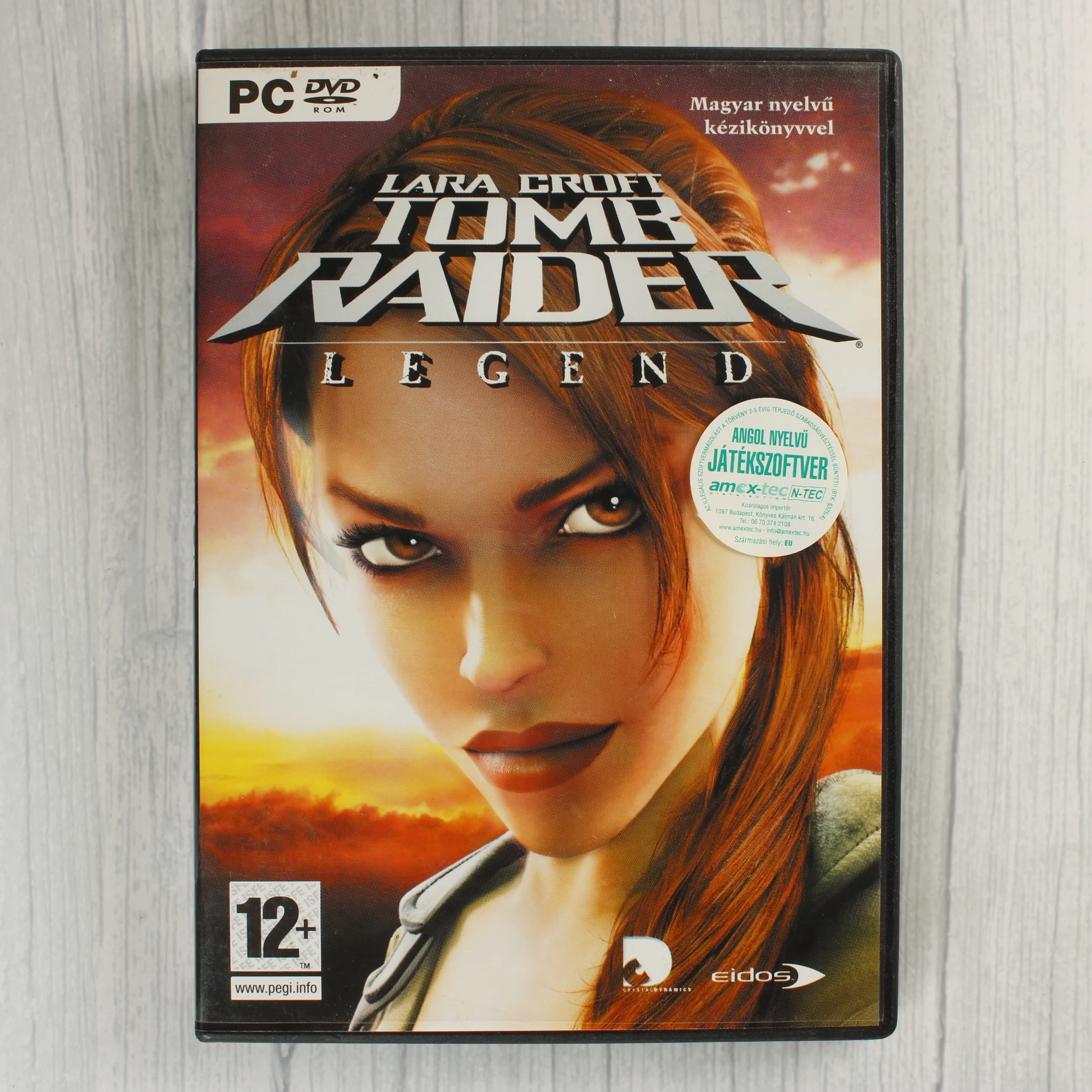 A Lara Croft Tomb Raider: Legend című videójáték PC-s kiadása normál fekete műanyag tokban. A borítón Lara Croft arcképe látható naplementés háttérrel, a felső részen a játék címe, az alsó sarokban pedig a PEGI 12-es korhatár-besorolás szerepel. A tok elején egy kerek fehér matrica jelzi az angol nyelvű szoftvert és a magyar forgalmazót. A hátoldalon magyar nyelvű leírás, játékmenet-képek és a rendszerkövetelmények olvashatók. A csomag tartalmazza a játékot tartalmazó DVD-ROM lemezt, amely piros és fehér grafikával van ellátva, valamint a tok belsejében látható a kísérő füzet széle is.