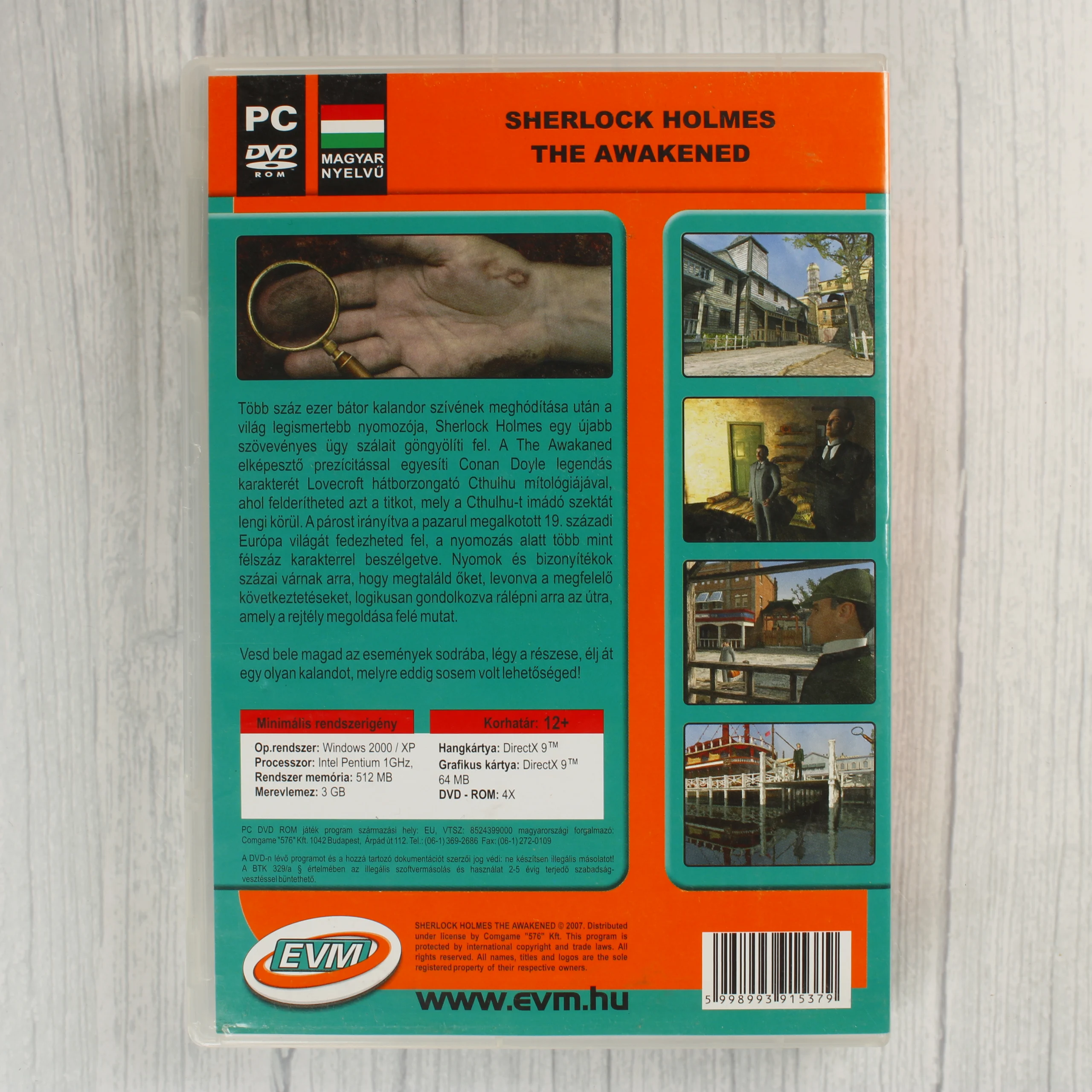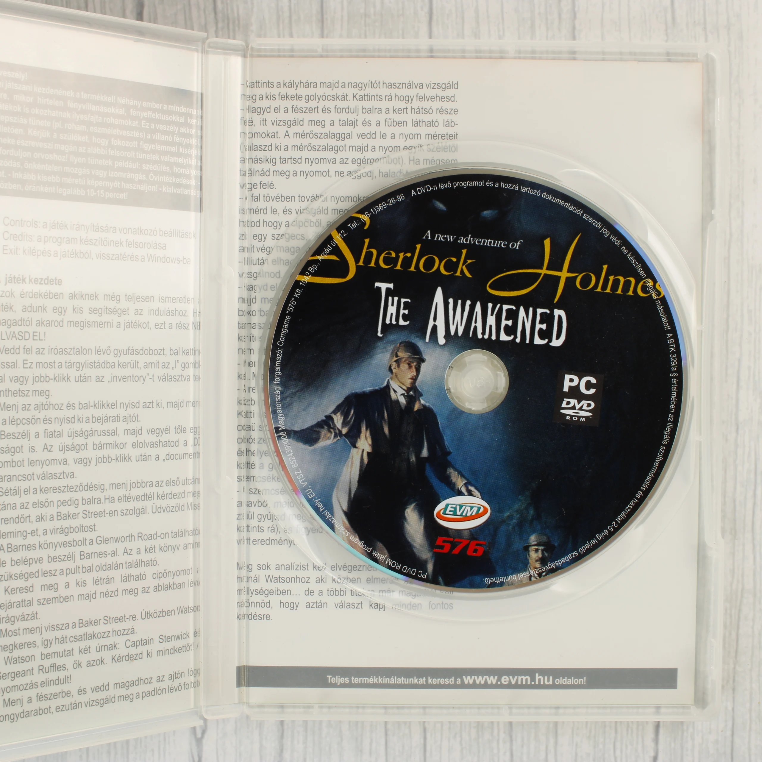A Sherlock Holmes: The Awakened című PC-s videójáték magyar nyelvű kiadása. A csomag egy átlátszó műanyag tokot tartalmaz, amelyben a játékot tartalmazó DVD lemez és egy nyomtatott, magyar nyelvű útmutató található. A borítón Sherlock Holmes és Dr. Watson látható egy sötét, mocsaras környezetben, lámpással a kézben. A csomagoláson jól látható az EVM és az 576 Kbyte logója, valamint a magyar nyelvű tartalomra utaló jelzések. A hátoldalon a játékmenetből vett képernyőfotók, a történet rövid leírása és a minimális rendszerigények szerepelnek.