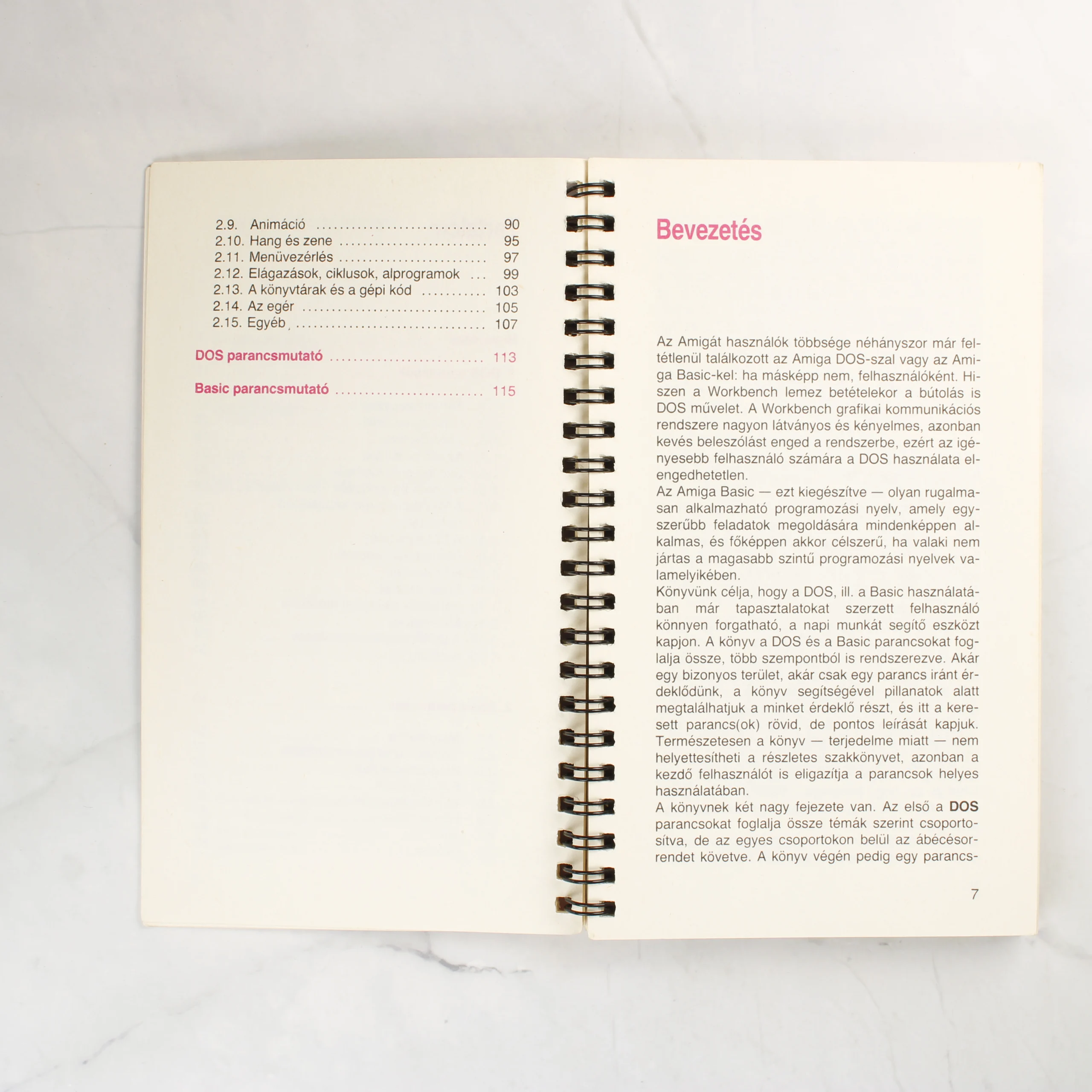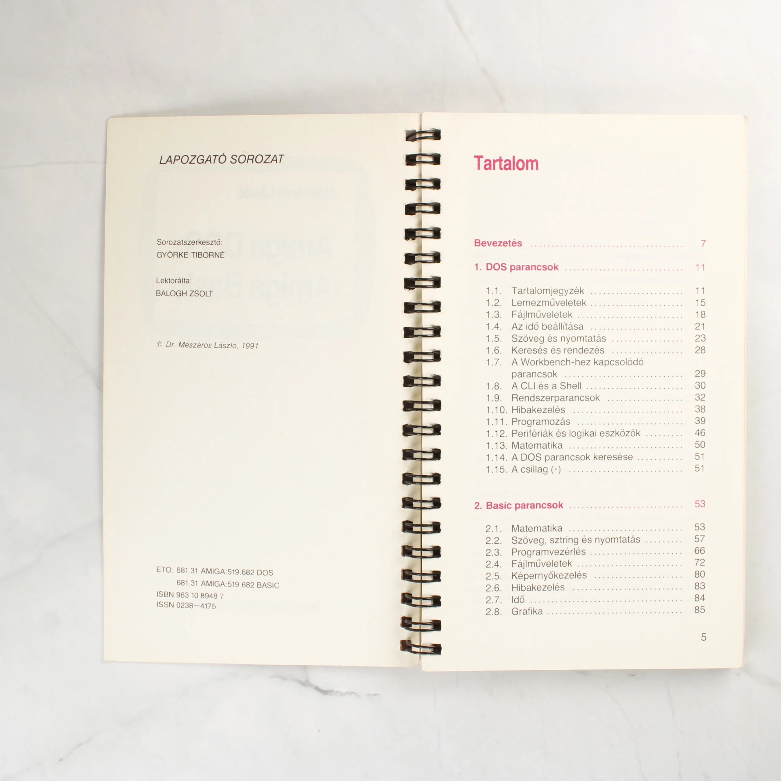 Mészáros László Amiga DOS, Amiga BASIC című szakkönyve a Lapozgató sorozat részeként jelent meg 1991-ben. A kiadvány spirálkötésű, ami lehetővé teszi a lapok teljes kihajtását. A borító sötétrózsaszín és magenta árnyalatú, fehér és fekete feliratokkal, valamint egy stilizált grafikai elemmel az alsó harmadban. A belső oldalakon a tartalomjegyzék és a bevezetés látható, a szöveg fekete és piros színekkel nyomtatott. A könyv az Amiga operációs rendszerének parancsait és a BASIC programozási nyelvet mutatja be. A papír enyhén sárgult az idő múlásával, de a szöveg tisztán olvasható. A spirál fémből készült és fekete bevonattal rendelkezik.