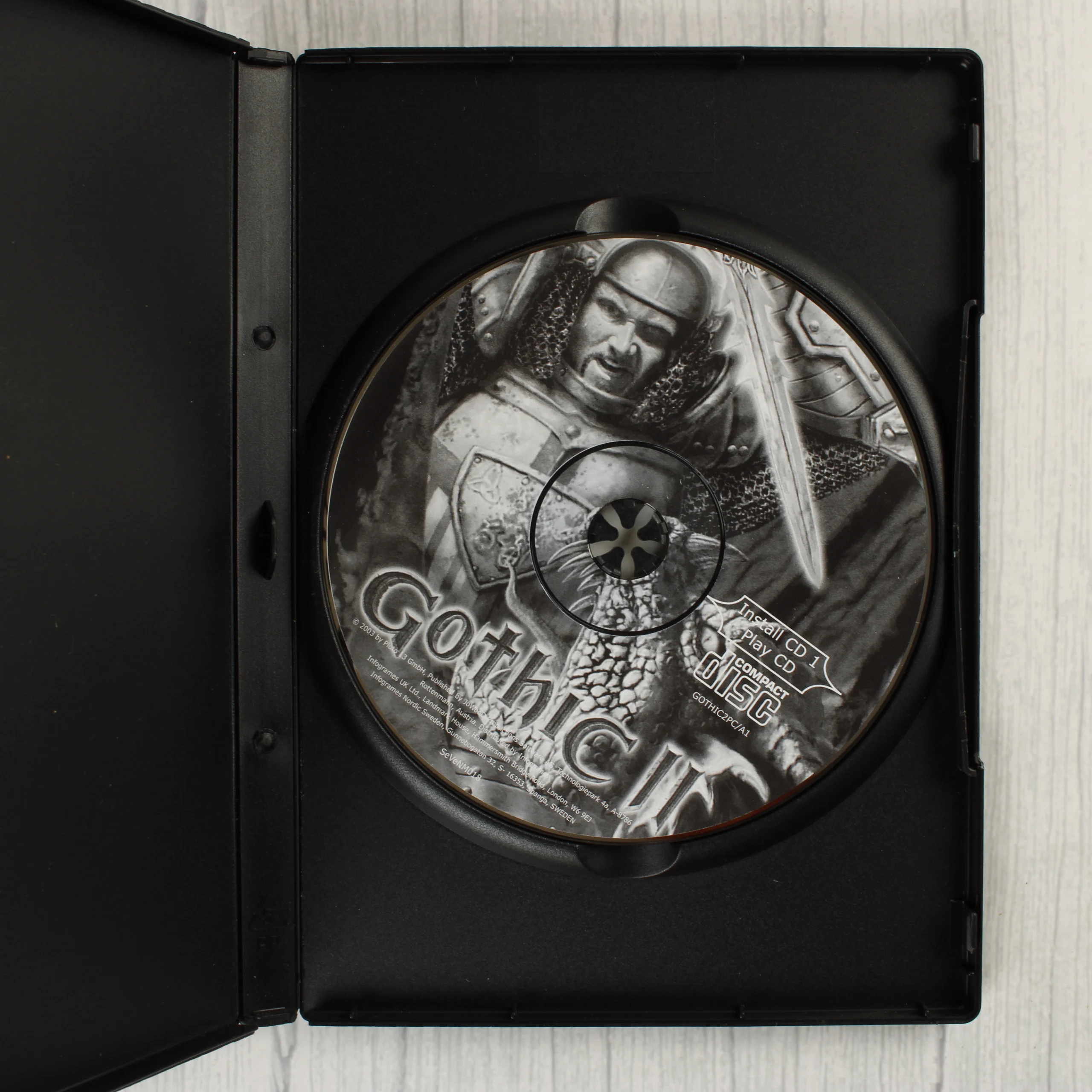 A Gothic II című videójáték PC-s kiadása, amely egy fekete műanyag DVD-tokban található. A borítón egy páncélos lovag látható, amint egy sárkánnyal küzd, faerezetes mintájú keretben. A csomag összesen három darab CD-ROM-ot tartalmaz: egy kombinált telepítő- és játéklemezt a tok belső tartójában, valamint két további telepítőlemezt fehér papírtasakokban. A hátoldalon többnyelvű (angol, cseh, magyar, szlovák) leírás és képernyőmentések láthatóak a játékból. A kiadványon a JoWooD és a Piranha Bytes logói szerepelnek, a korhatár-besorolás PEGI 12+.
