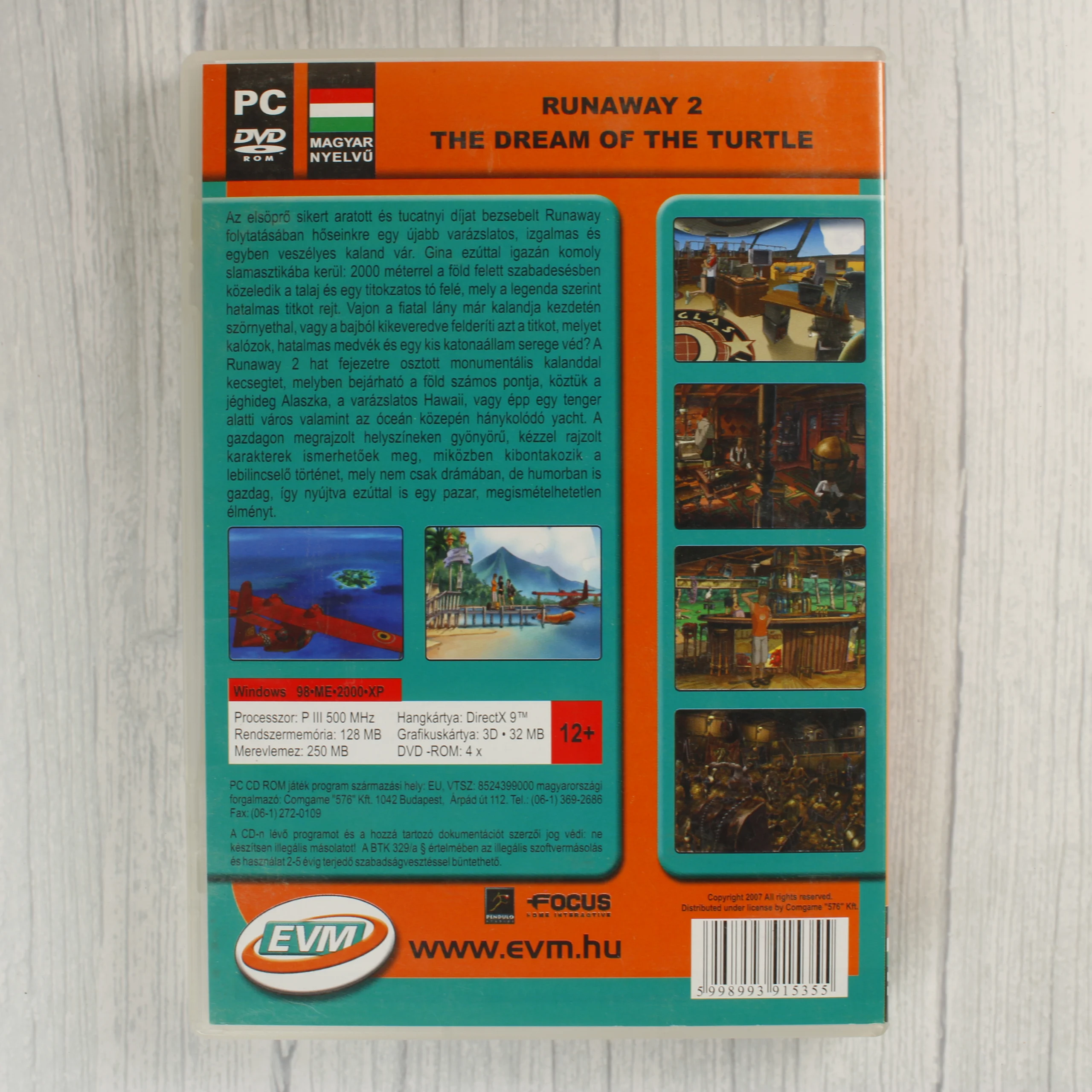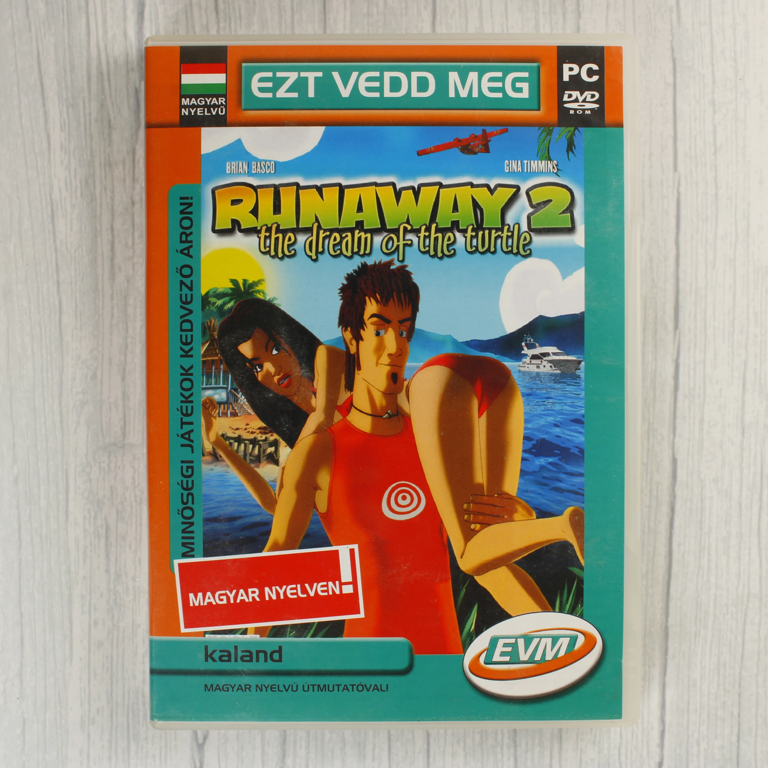 A Runaway 2: The Dream of the Turtle egy PC-re megjelent kalandjáték magyar nyelvű kiadása. A csomag egy fehér színű, normál DVD-tokot tartalmaz, amelyben a játéklemezen kívül egy többoldalas, magyar nyelvű használati útmutató is található. A borítón a játék főszereplői láthatóak trópusi környezetben, a hátoldalon pedig rövid leírás és képernyőmentések olvashatóak a szoftverről. A kiadvány az EVM (Ezt Vedd Meg) sorozat része, amit a borító felső részén található zöld sáv is jelez. A lemez felülete színes, a borító grafikáját ismétli meg.